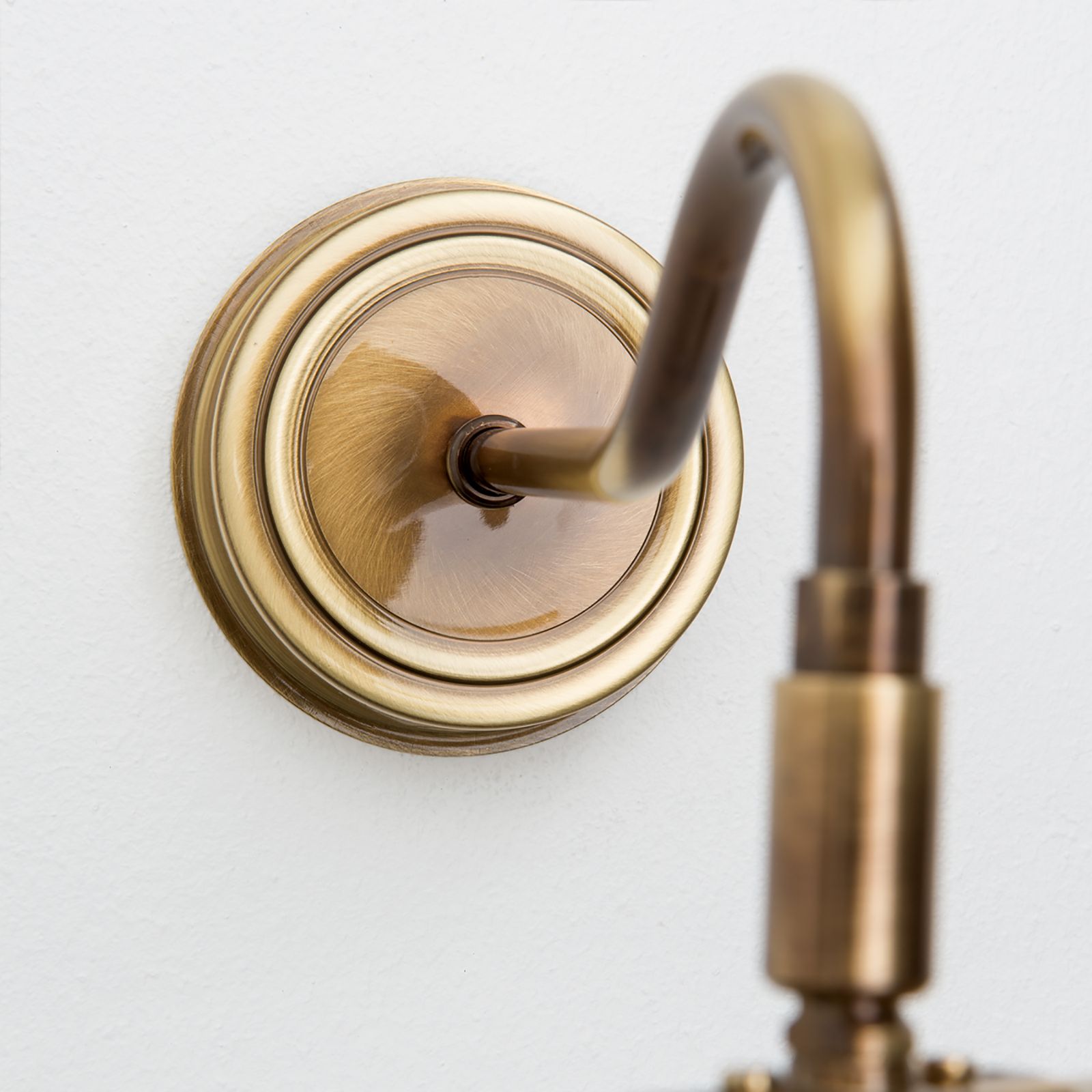 Die aus Vollmessing gefertigte Bilderleuchte hat einen schmückenden Charakter und setzt die edlen Materialien gekonnt in Szene. Ein Finish in Messing matt oder handschattierter Patina vollenden den eleganten Gesamteindruck der Leuchte, die sowohl zur Beleuchtung von Wänden, Kunstwerken als auch Spiegeln eingesetzt werden kann.