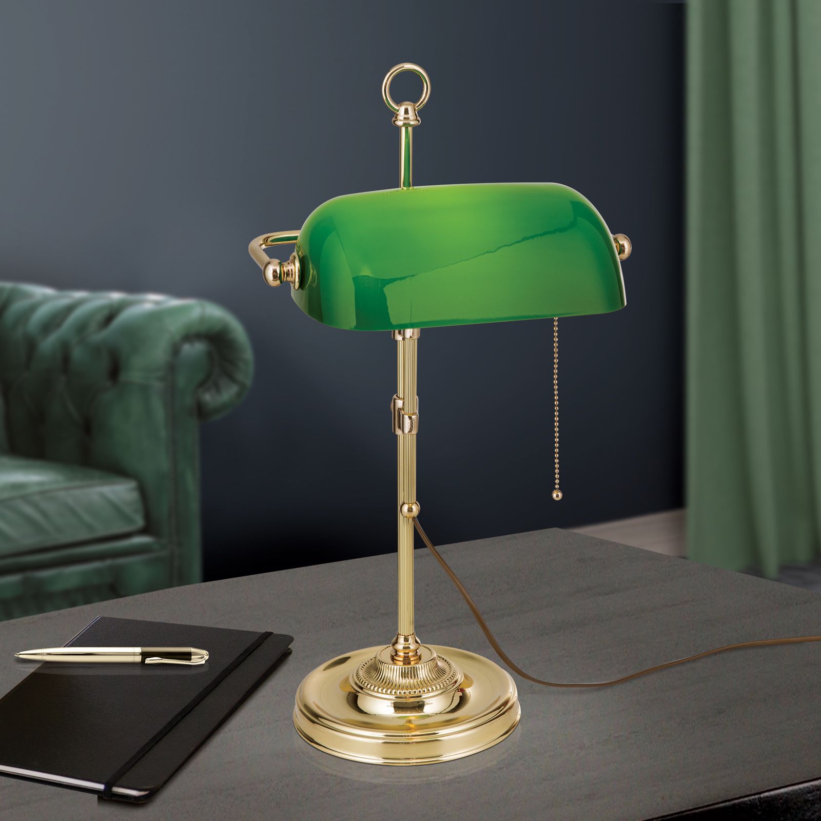 Bankerslamp HARVARD, Messing mit grünem Glasschirm, 53cm