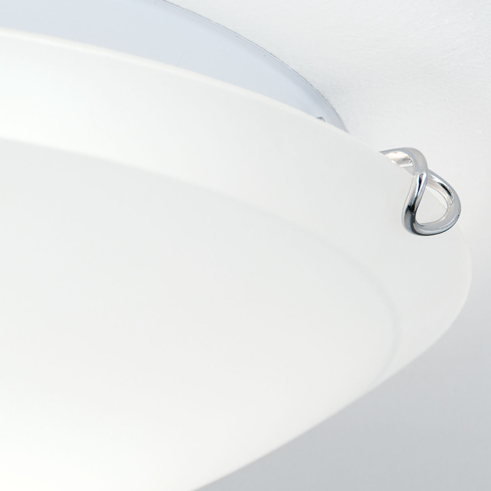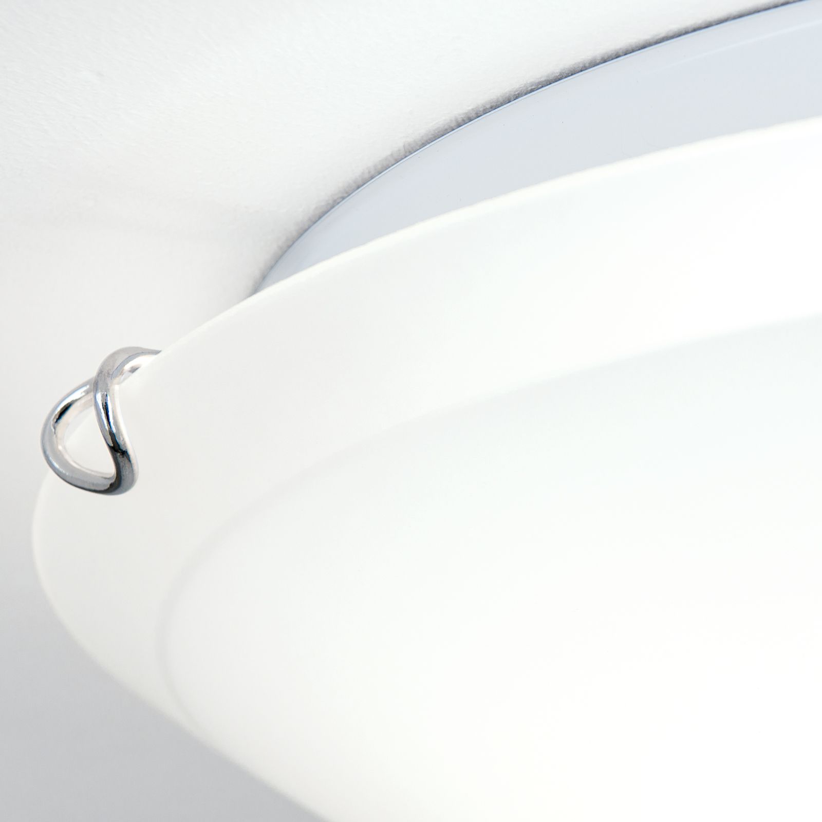 Der Opalglas-Schirm in Zweifach-Tönung wird von drei verchromten Clips fixiert und gewährleistet eine schöne und gleichmäßige Beleuchtung des Innenraums. AGADA kann in kleinen oder auch nicht sehr hohen Räumen eingesetzt werden, wo ausladenden Deckenleuchten nicht ausreichend Platz zur Verfügung steht und problemlos mit verschiedenen Design-Stilen kombiniert werden.
