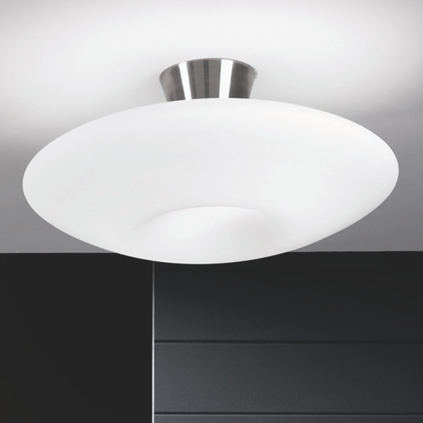 Der charakteristische, ringförmige, mattweiße Schirm der Deckenleuchte BLANC inspirierte zur Namensgebung. Das Design ist ganz auf das Wesentliche konzentriert und lässt die Wirkung des mundgeblasenen Opalglasschirms voll zur Geltung kommen.