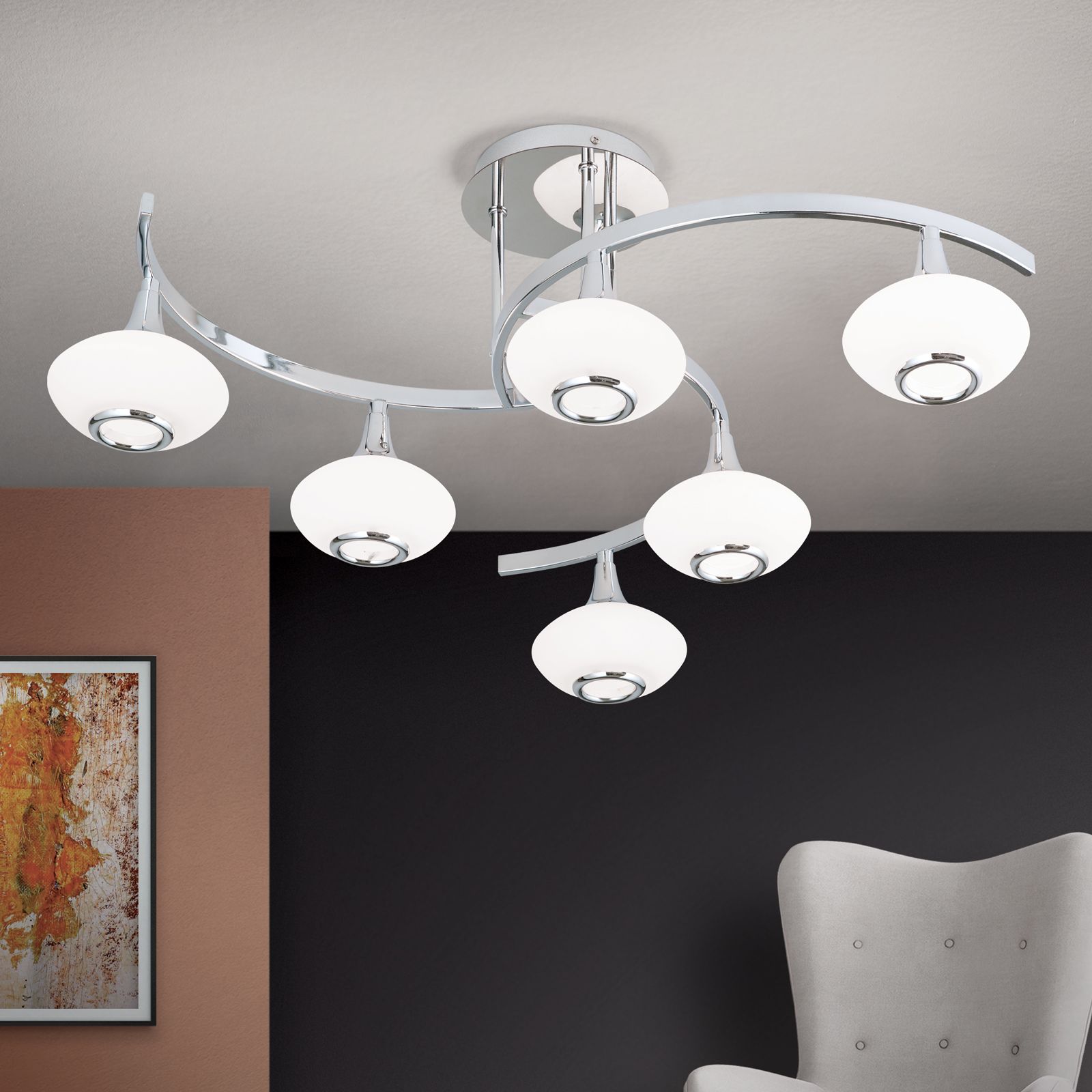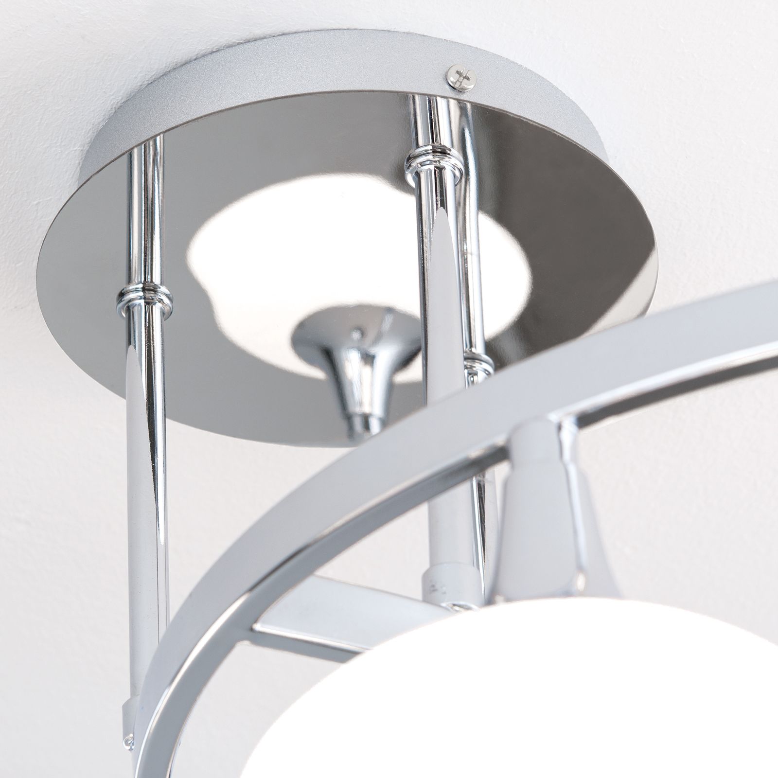 In klassisch schlicht gehaltene Speis- oder Wohnzimmer fügt sich die moderne Deckenleuchte harmonisch und sorgt dort aufgrund der opalmatten Glasschirme für ein weiches, ausgewogenes und blendfreies Raumlicht. Die chromglänzende Umrandung der Schirmränder verlieht ihr das gewisse Extra.