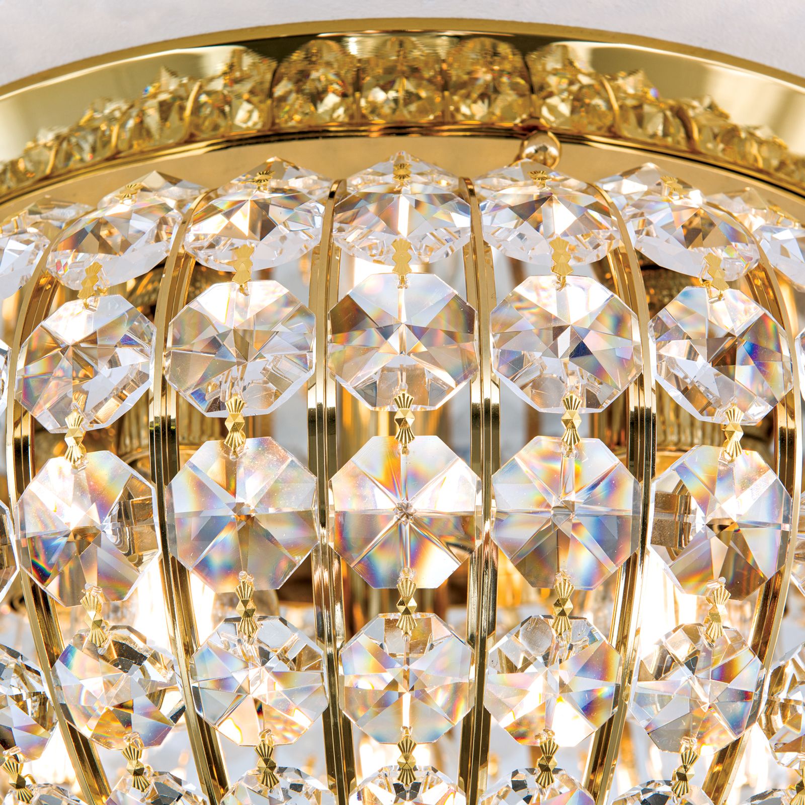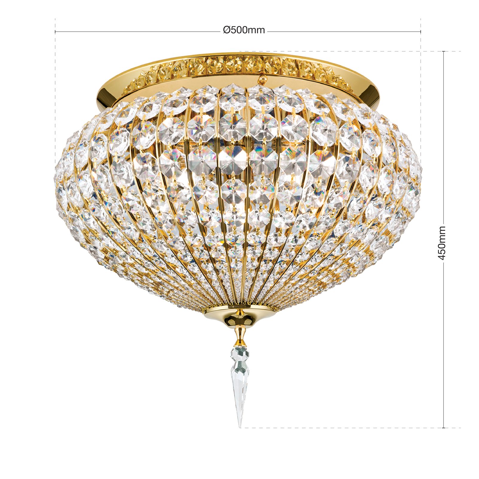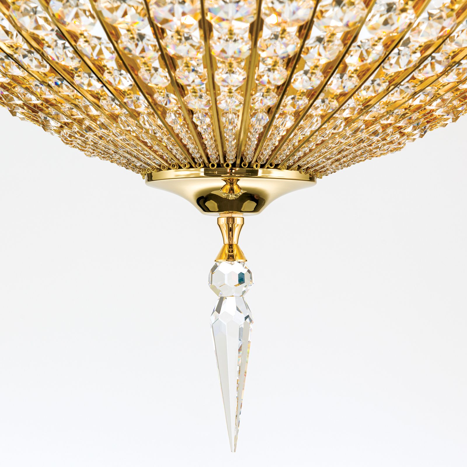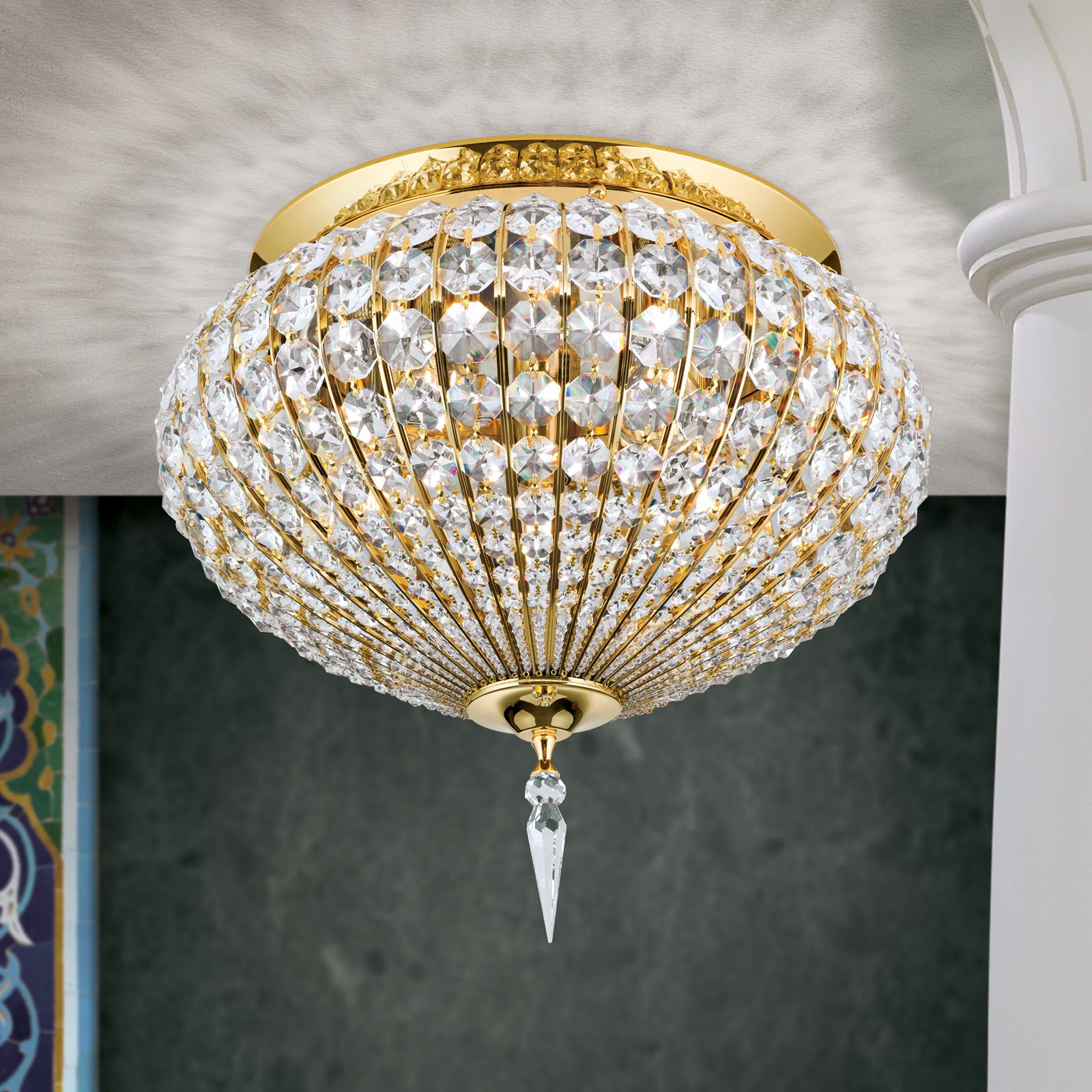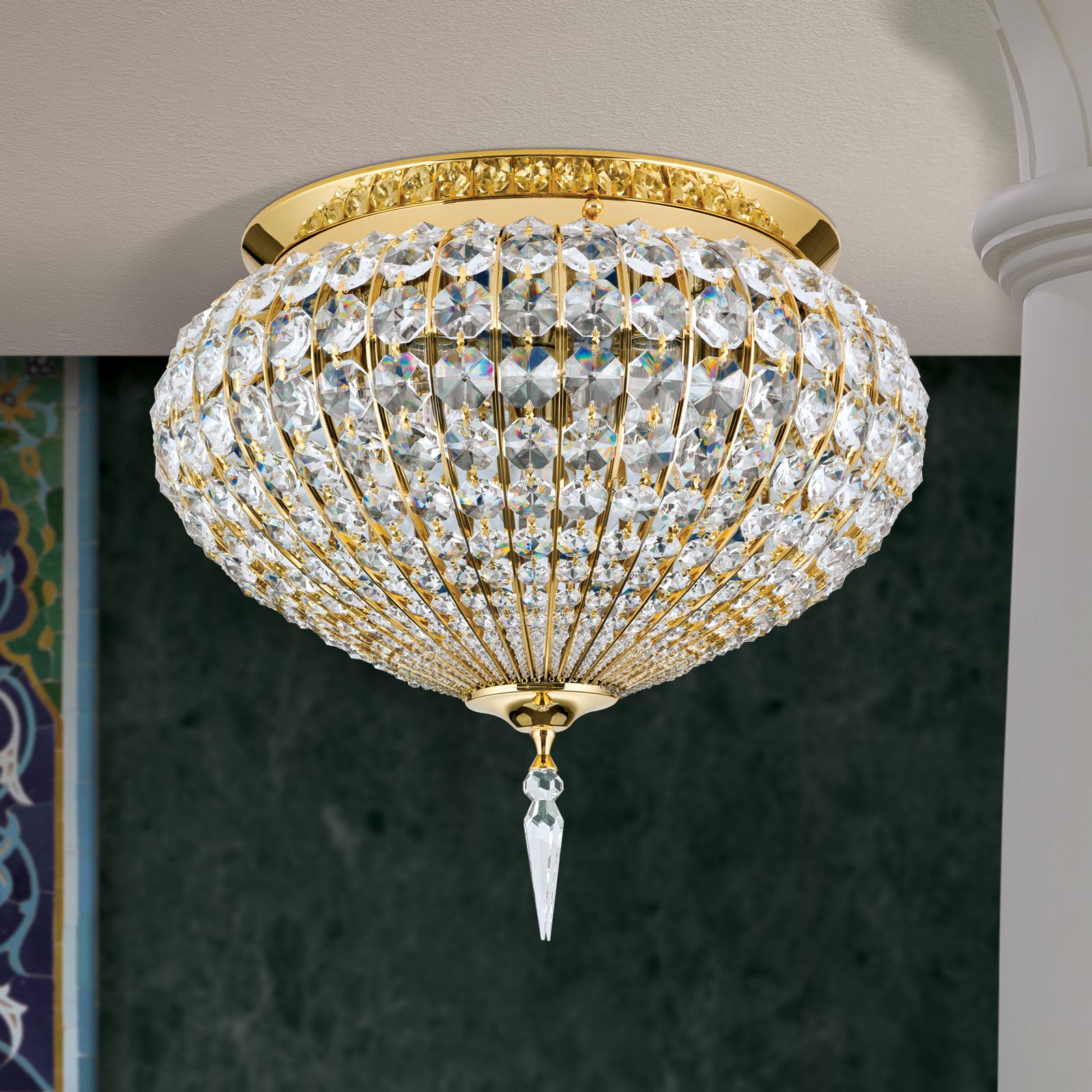 Klassische Interieurs profitieren von einer dekorativen Grundbeleuchtung und orientalischer Opulenz, wie sie diese Leuchte bietet. Sie ist vielseitig einsetzbar und lässt sich wunderbar in Flure, Wohn-, Ess- und Schlafzimmern integrieren, wo sie für beeindruckende Lichtspiele sorgt. Das Gestell besteht aus einer vergoldeten Vollmessingplatte sowie sich verjüngende Kristallketten, die durch feine goldene Streben getrennt sind. Der einzelne Kristalltropfen, der am unteren Ende der Kristallkuppel platziert ist, rundet und das Gesamtbild perfekt ab.