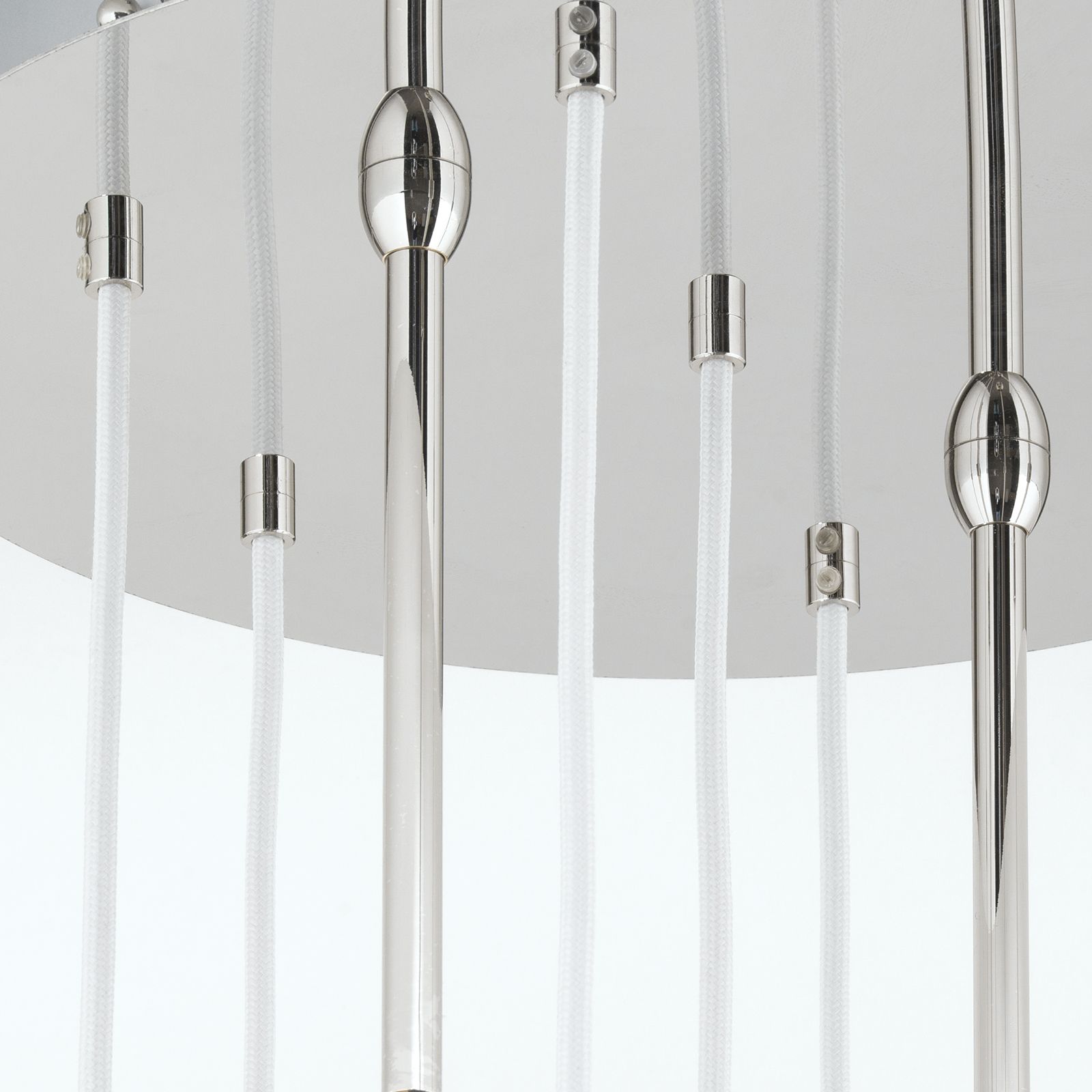 Die Metallelemente sind aus edlem Vollmessing und verleihen dem Luster mit den Oberflächenveredelungen in schimmerndem Nickel und 24 Karat Gold einen zeitlosen Esprit, der mit verschiedenen Einrichtungsstilen ausgezeichnet harmoniert.