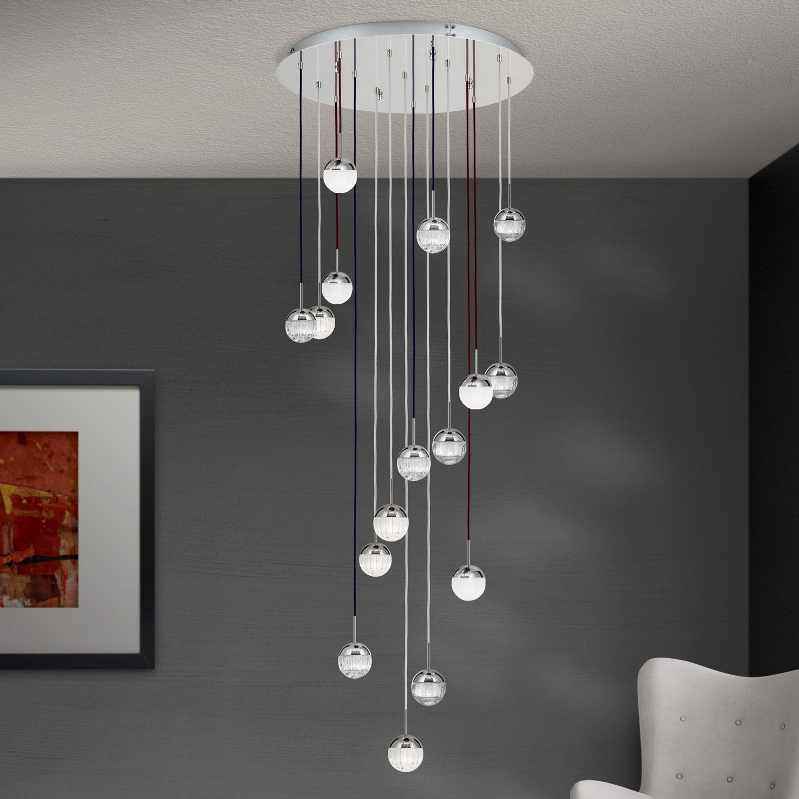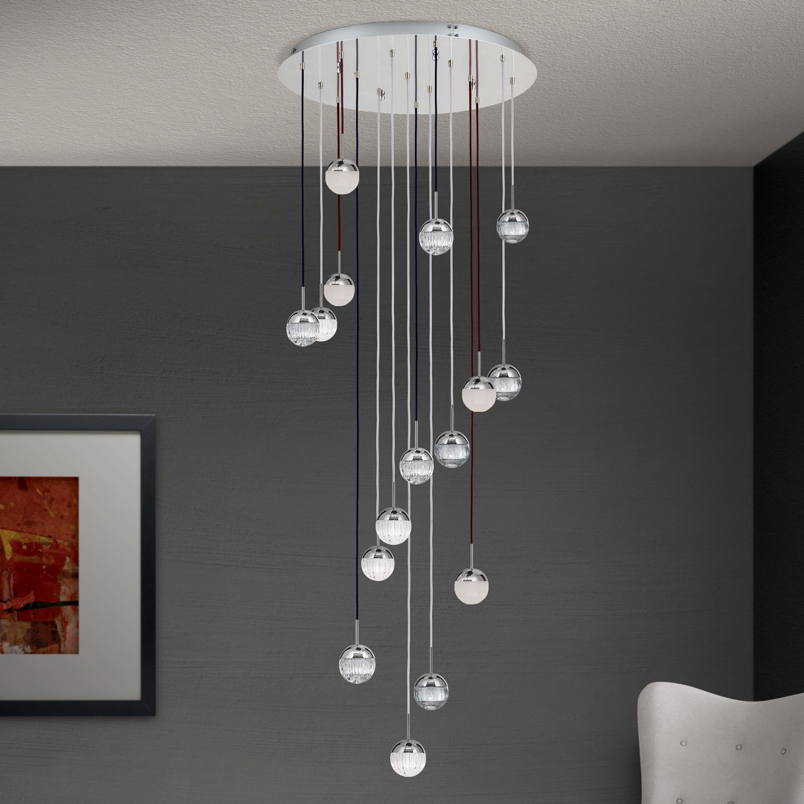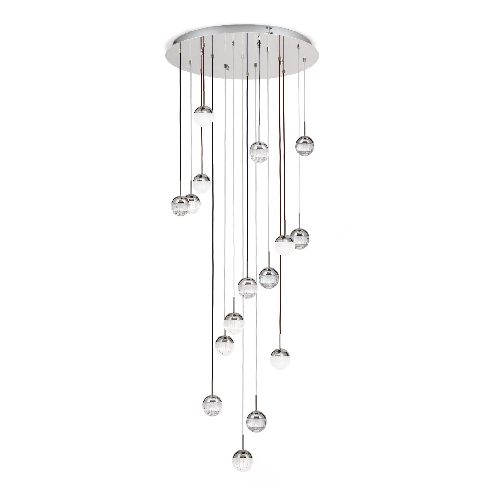 Deckenluster BALL, Ø 80cm, nickel, mit Textilkabelfarb- und Glasmix