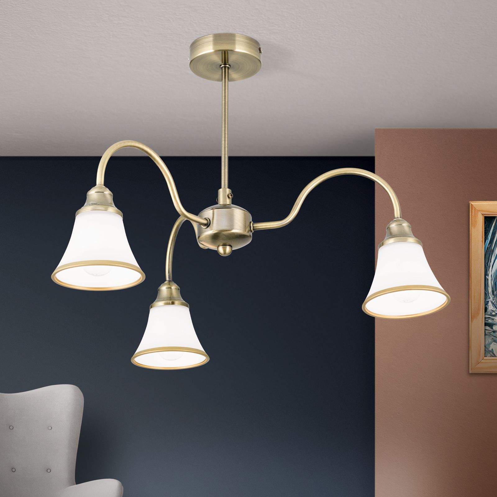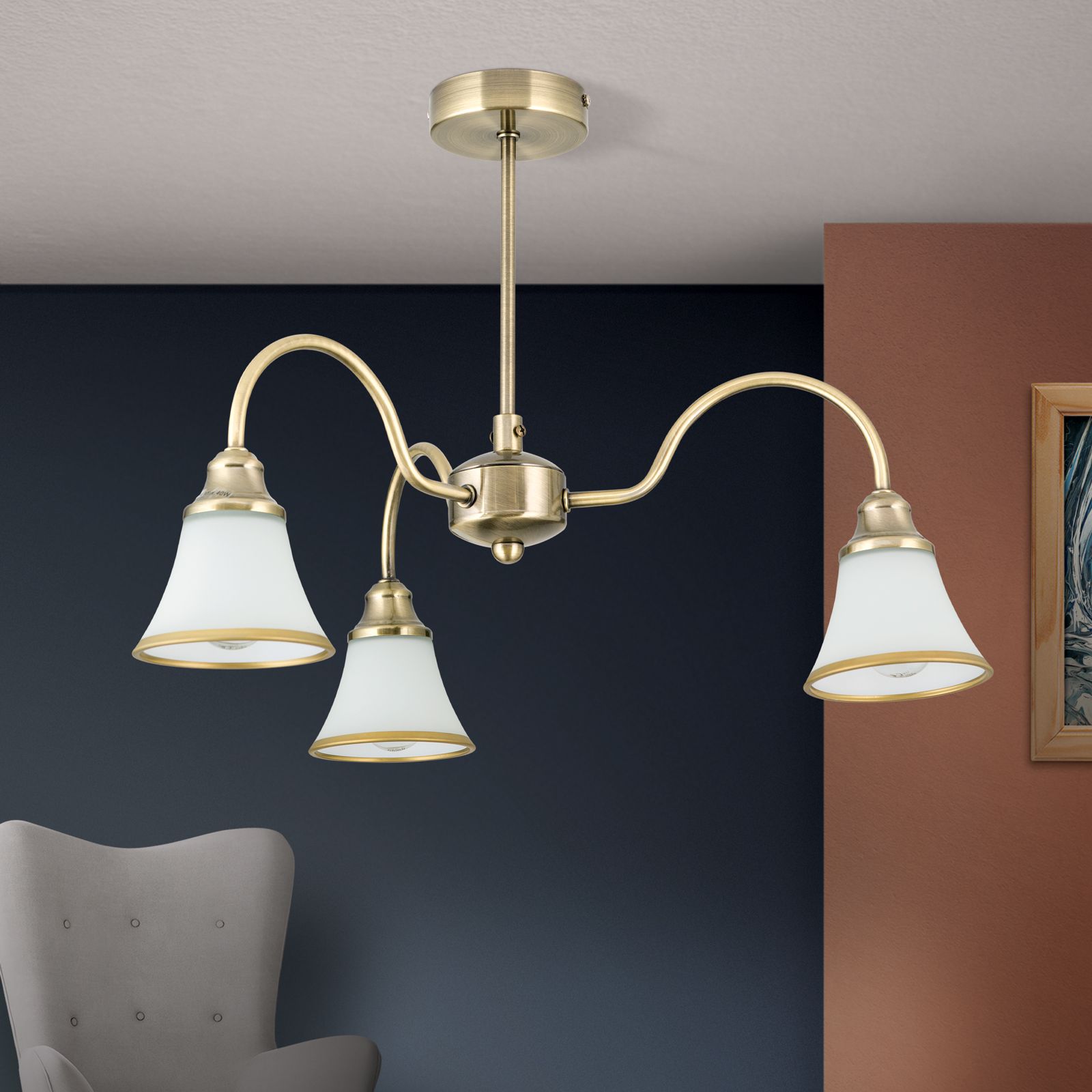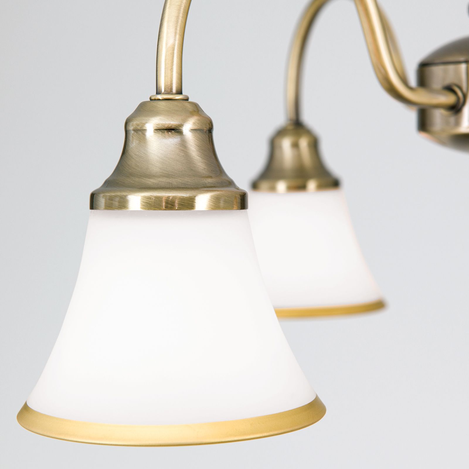 Der 3-flammige Kronleuchter MAJA sorgt für eine gute Ausleuchtung an jedem Platz. Die Schirme werden von gebogenen messing-matten Metallarmen getragen, die das Licht nach unten hin abgeben. Das opal-matte Glas der Schirme garantiert ein angenehmes und blendfreies Licht. Abgerundet wird das Design durch die patinaveredelte Oberfläche, welche auch den unteren Rand der Glasschirme schmückt.