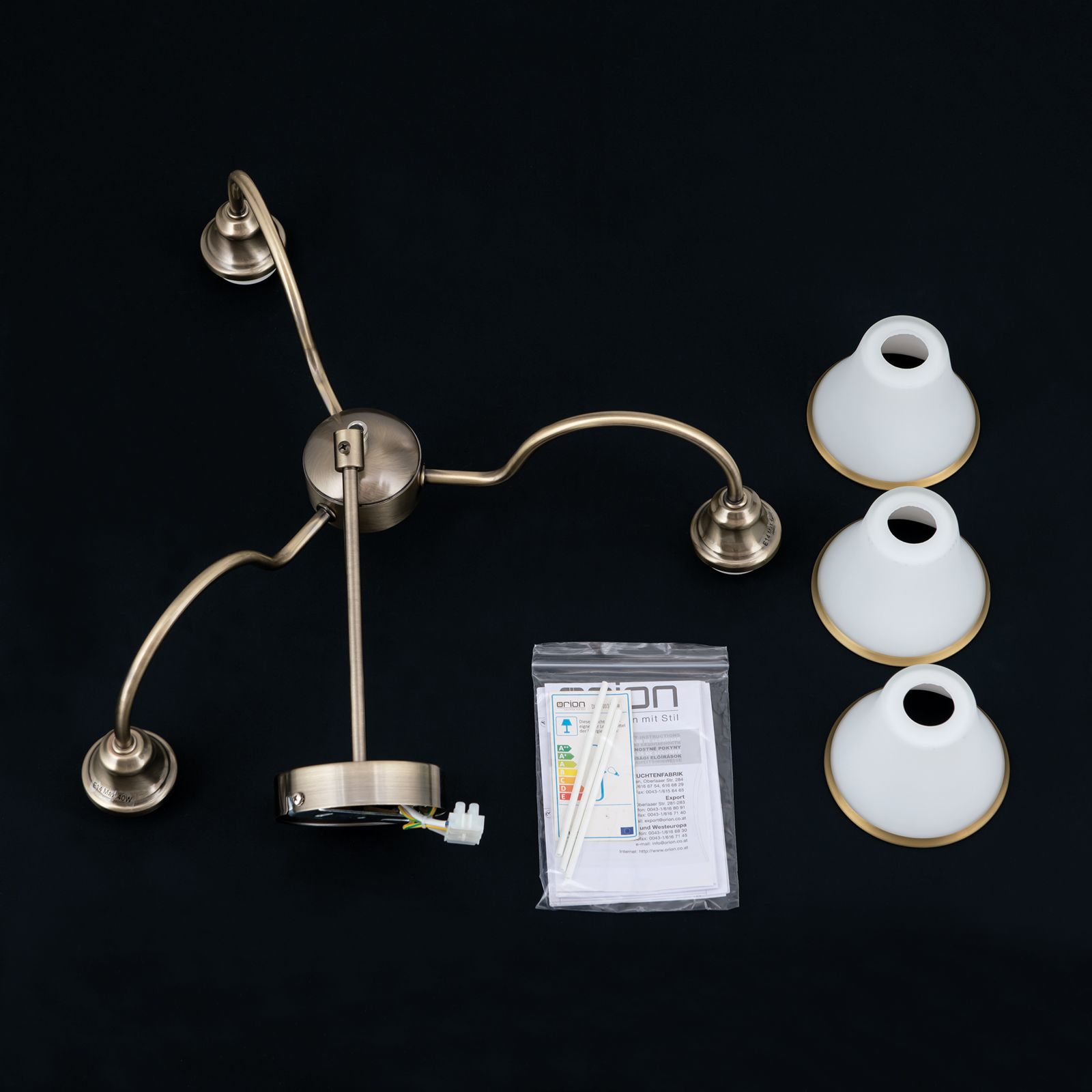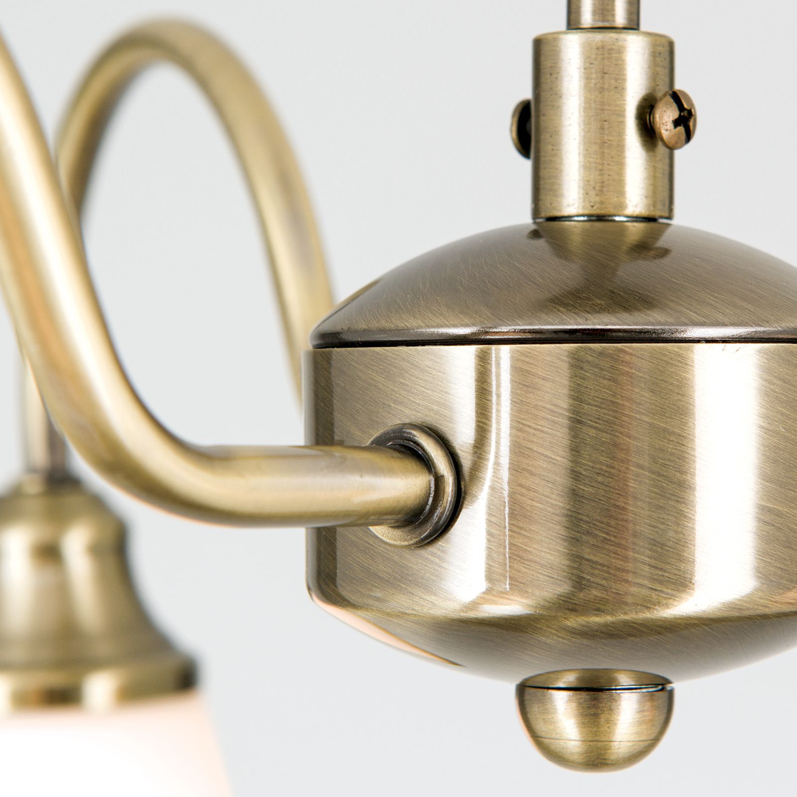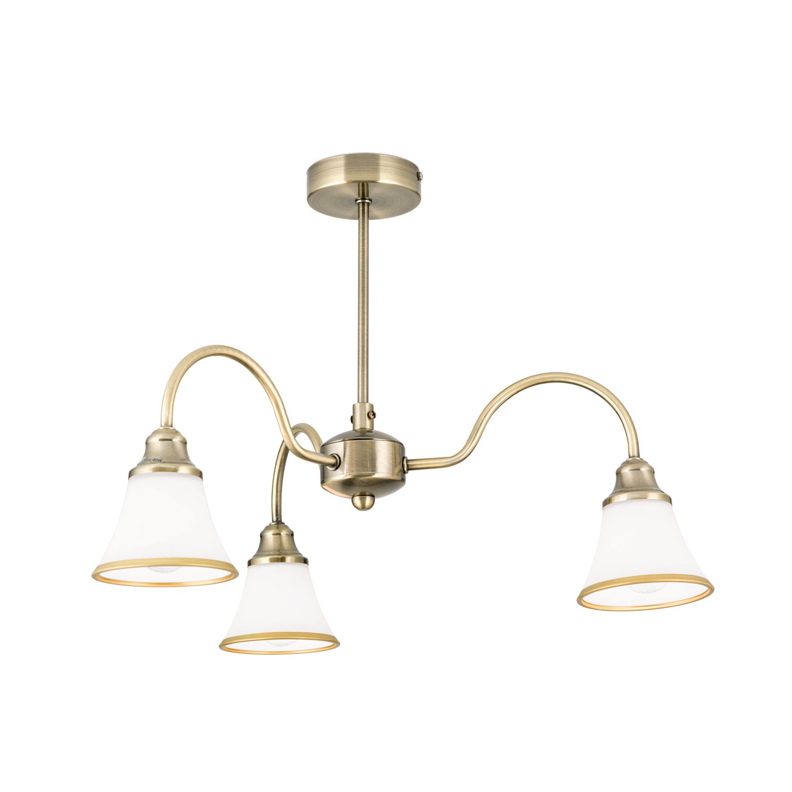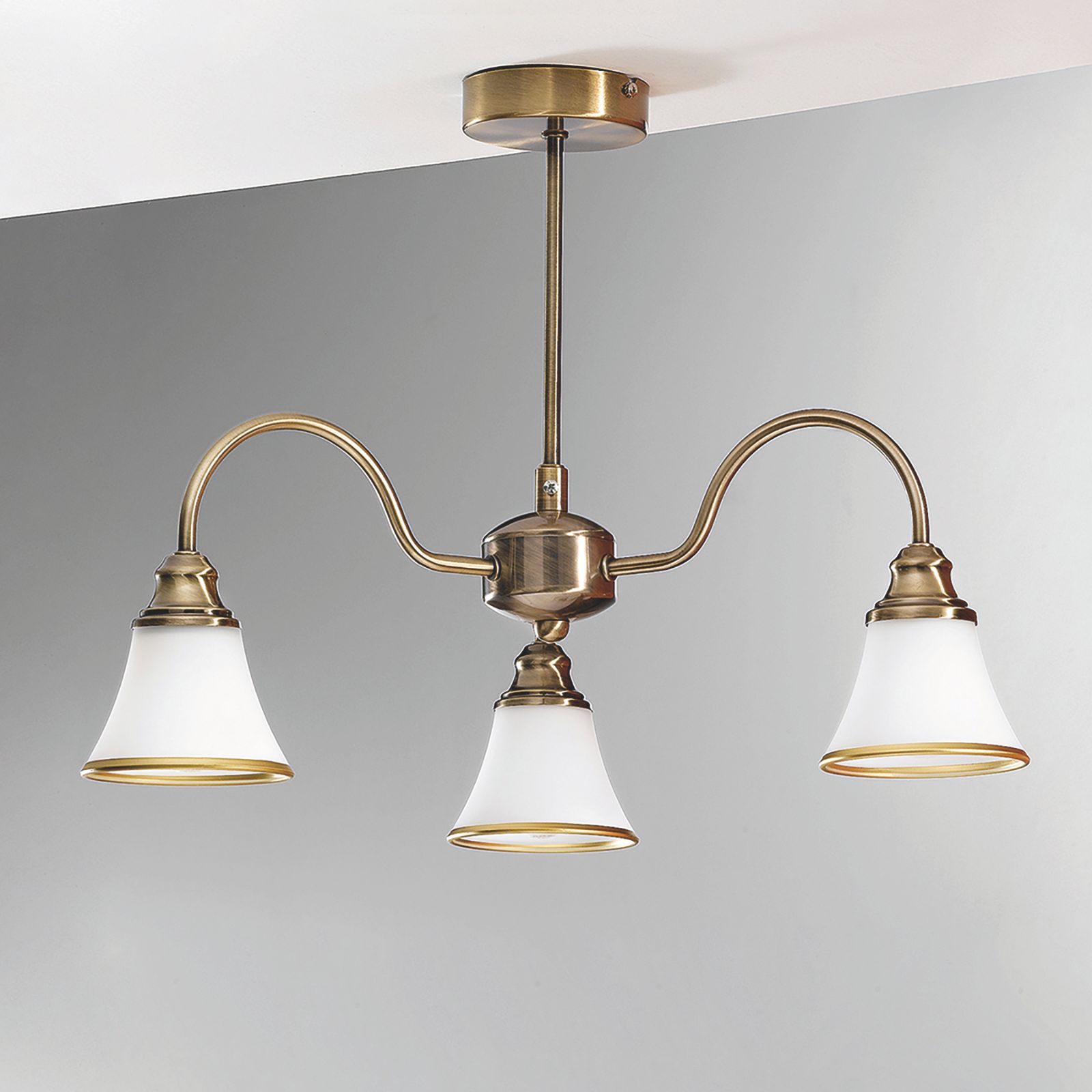 Der 3-flammige Kronleuchter MAJA sorgt für eine gute Ausleuchtung an jedem Platz. Die Schirme werden von gebogenen messing-matten Metallarmen getragen, die das Licht nach unten hin abgeben. Das opal-matte Glas der Schirme garantiert ein angenehmes und blendfreies Licht. Abgerundet wird das Design durch die patinaveredelte Oberfläche, welche auch den unteren Rand der Glasschirme schmückt.