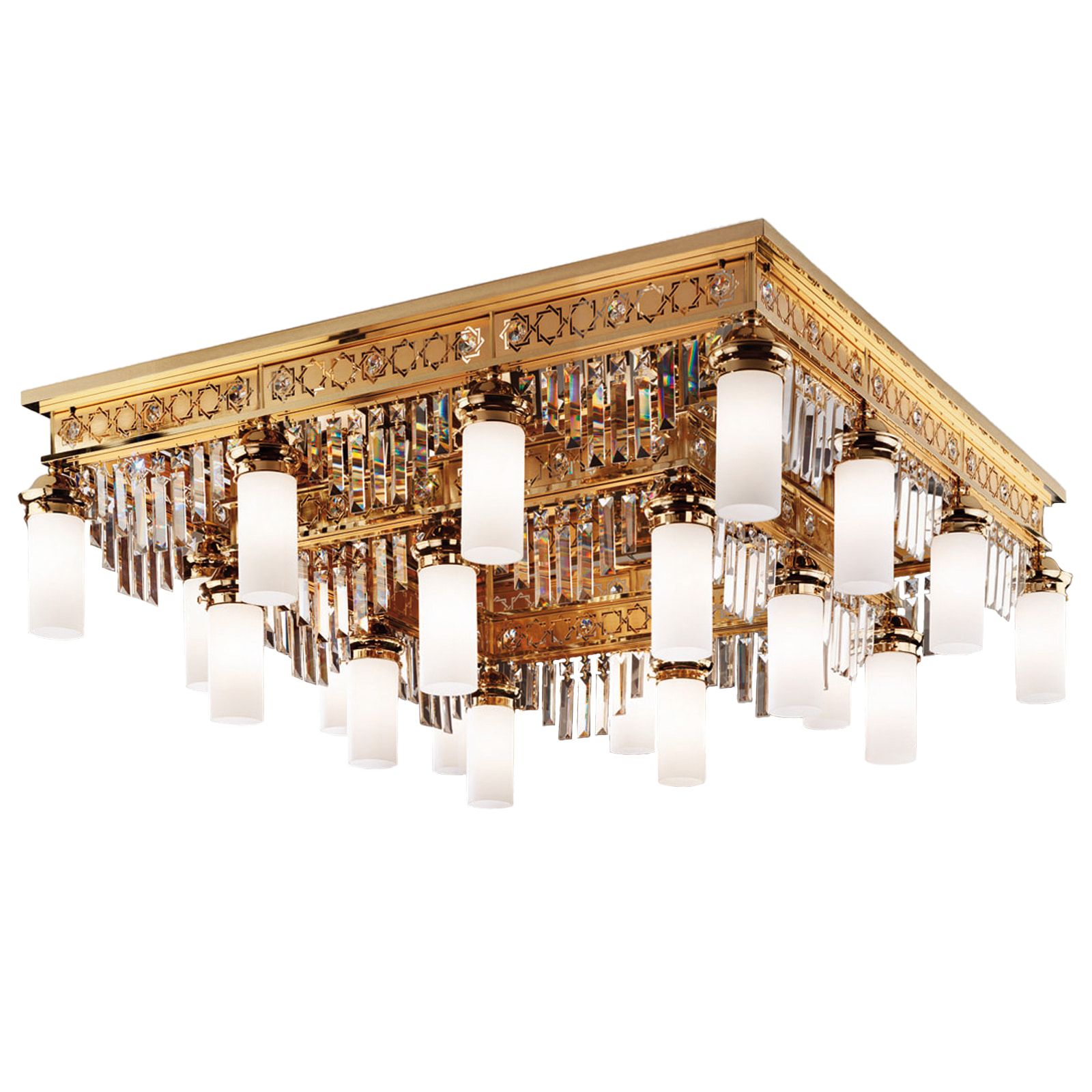 Mit der ORIONtal-Kollektion rückt ein Kulturkreis in den Mittelpunkt, der Schmuck und Verzierungsformen zu höchster Perfektion geführt hat. Der 20-flammige Deckenluster aus dieser Reihe spart nicht mit Superlativen: 24-Karat vergoldeter Deckenspiegel, Einlegearbeiten, Kristallprismen, Zierbänder enfalten eine himmlische Pracht. Das weiche, warme Licht der matten Gläser wetteifert mit dem schieren Glanz des Goldes, dem Widerschein des Deckenspiegels und dem Funkeln der Kristalle. Das sind erhabene und erhebende Eindrücke, die diesen Luster für Andachts- und Gebetsräume empfehlen. Foyers und Empfangsräume im orientalischen Stil werden durch diese Leuchte geadelt. Der Luster ist mit zwanzig E27-Fassungen zu je maximal 60 Watt versehen.