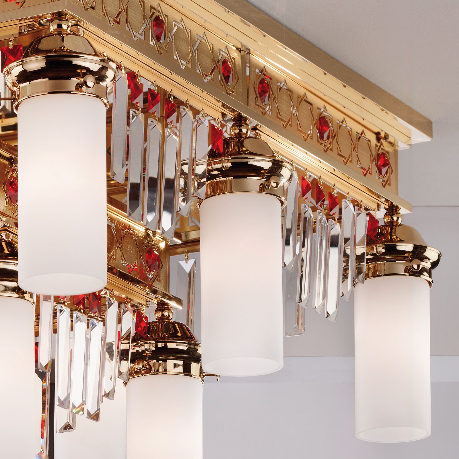 Der 8+4-flammige Deckenluster aus der Kollektion ORIONtal ist ein auf mannigfache Weise glänzender Lichtkörper. Der Korpus erstrahlt auf zwei Ebenen in Gold mit rundumlaufenden symmetrischen Achteckmustern. Kristallbehang in Prismenschliff mit roten Einsätzen bricht das Licht und erzeugt eine einzigartige Tiefe. Reflexionen und Spiegelungen blitzen am Plafond, an den Wänden und im ganzen Raum auf. Opal-matte Schirme verteilen das Licht ebenmäßig. Ein Empfangsraum im orientalischen Stil, ein Hotel mit Themenbereich und ebenso Gebetsräume erhalten mit diesem Luster einen prachtvollen Mittelpunkt. Der Deckenluster ist mit 12 E27-Fassungen für je maximal 60 Watt versehen.