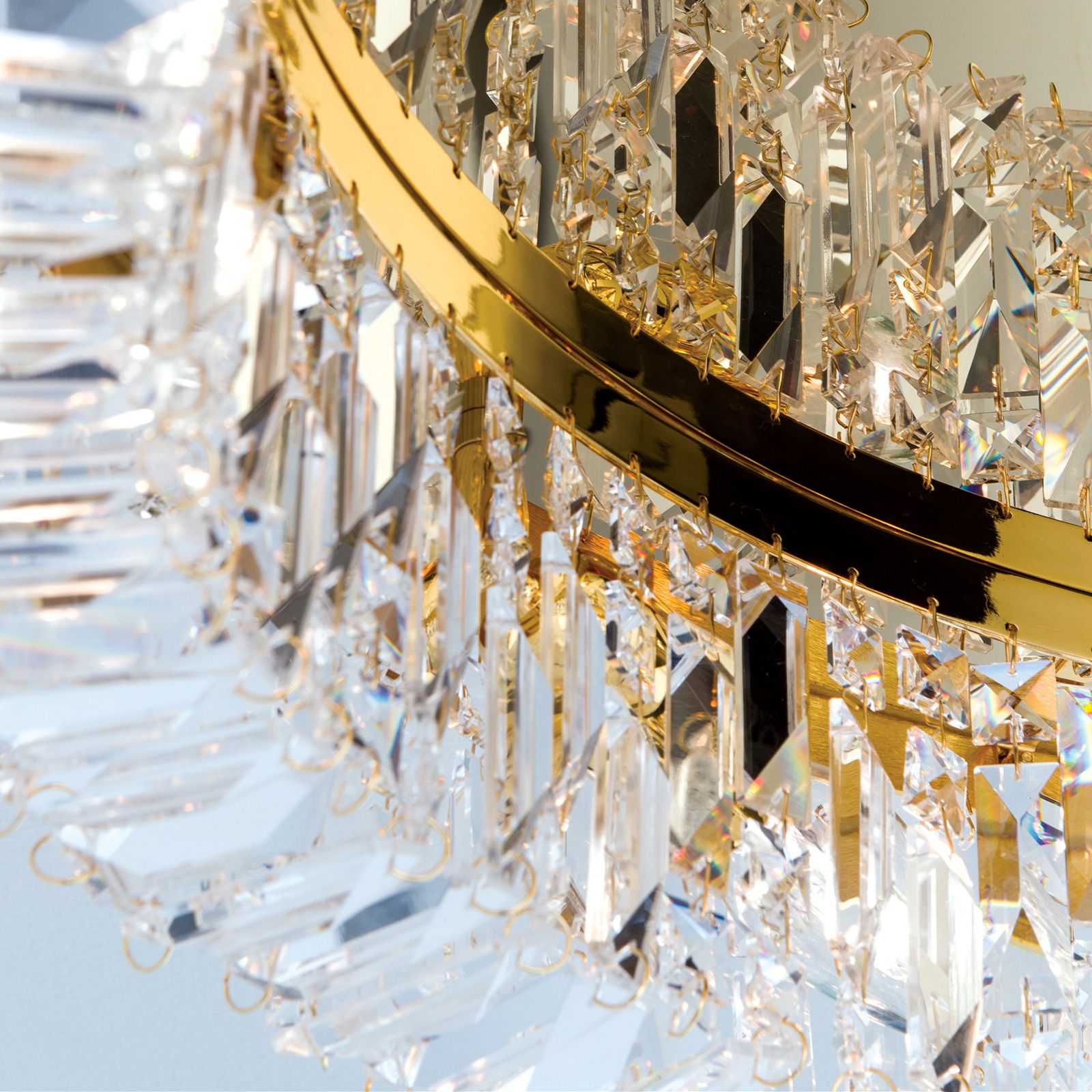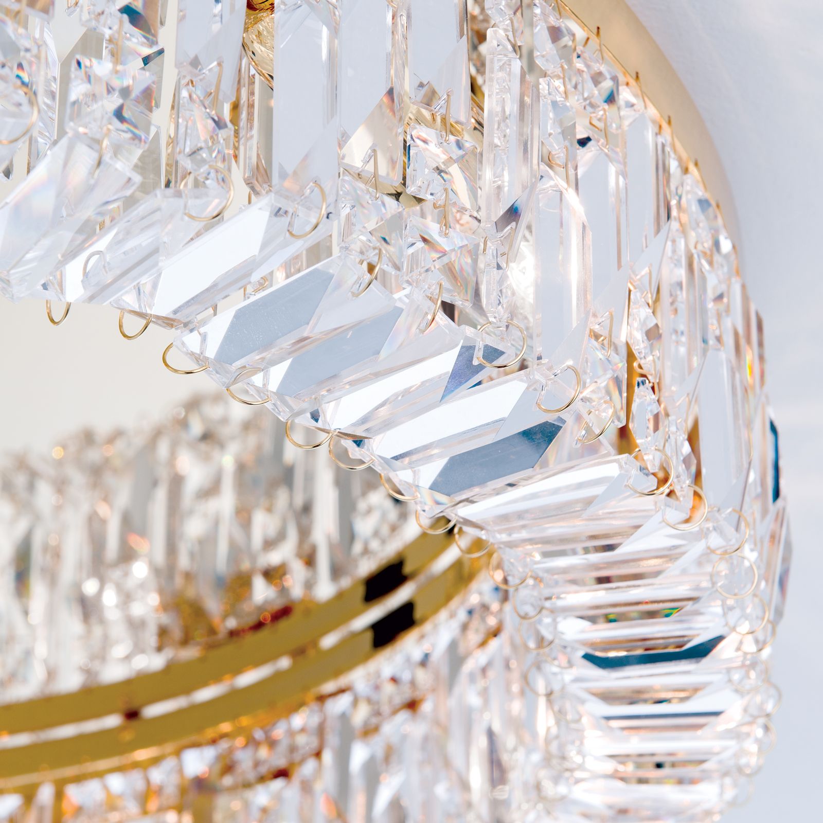 Der Kronleuchter RING besticht durch seine klare geometrische Form und seinen modernen Kristallbehang. Angebracht über einem Esstisch oder im Wohnzimmer leuchtet er den gewünschten Bereich wunderbar aus und sorgt zugleich für prachtvolle Lichtreflexionen, die durch das verspiegelte Innere gesteigert werden. Der Kronleuchter mit einem Durchmesser von 110 cm besteht aus einem runden verchromten Messinggestell, an dem einzelne klare aneinandergekettete Kristallprismen angebracht sind. Wie ein funkelnder Vorhang umgibt er die 12 Leuchtmittel mit E14-Sockel. Selbst im ausgeschalteten Zustand faszinieren die hochwertigen SCHÖLER CRYSTAL®-Kristalle, wodurch der Luster zum besonderen Wohnaccessoire wird. Die Gesamthöhe beträgt 30-160 cm mit einer Abhängung von 150 cm. Dieser Artikel ist in den Farben Chrom und Gold erhältlich und dimmbar.