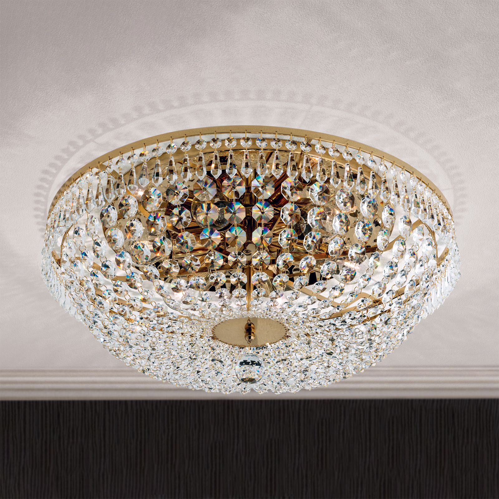 Hauptmerkmal der Serie SHERATON sind die zahlreich angebrachten Kristalle aus dem Hause SCHÖLER, die der Tradition des beliebten Korblüsters folgen. Der aus Messing gefertigte Leuchtenkörper ist mit einer Oberflächenveredelung in 24-Karat Gold oder Chrom erhältlich. Mit seinem klassischen Charakter fügt sich der edle Deckenkronleuchter wunder in klassisch eingerichtetes Ambiente. SHERATON mit einem beträchtlichen Durchmesser von 55 Zentimetern ist mit 6 E27-Fassungen versehen und kann mit maximal 60 Watt je Fassung bestückt werden. In Kombination mit sparsamen LED-Lampen kann der Deckenlüster auch zur energieeffizienten, ständigen Beleuchtung genutzt werden.