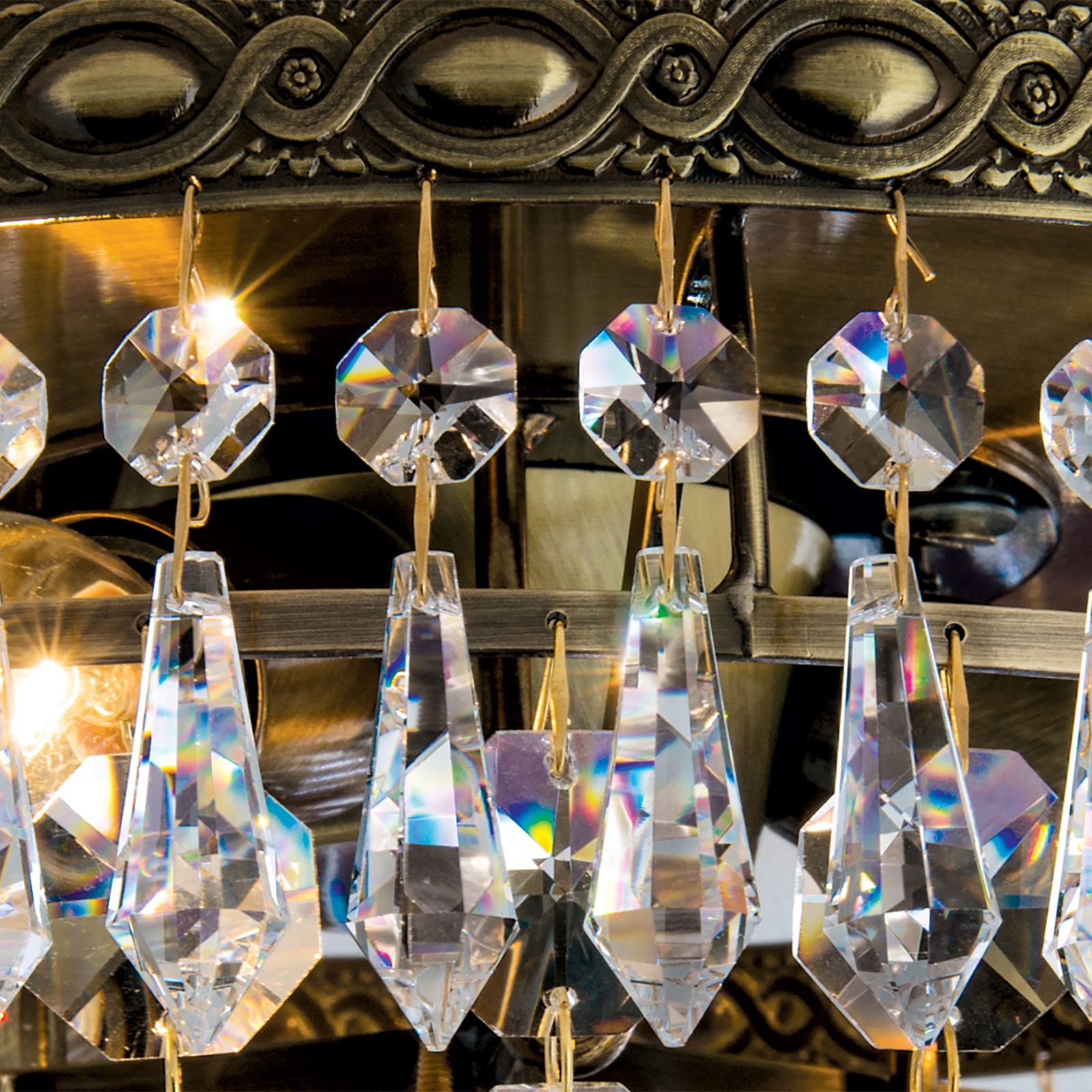 Das Leuchtengestell besteht aus Vollmessing und ist mit einer handschattierten Patina versehen. Ein kunstvoll verzierter Metallring trägt eine Vielzahl an Koppen und tropfenförmigen Kristallen. Zu Ketten verbundene Kristalle bilden ihren Schirm und werden in der Mitte durch eine verspiegelte Zierplatte zusammengeführt. Diese wird durch eine große herabhängende Kristallkugel geschmückt. Vereinzelt eingearbeitete bernsteinfarbene Kristalle verleihen ihr einen farbigen Akzent und sorgen gleichzeitig für eine farbliche Verbindung zur Montur. Mithilfe eines externen Dimmers kann die Leuchte in ihrer Helligkeit reguliert werden. Hinter dem Kristallbehang befinden sich die 3 E14-Fassungen, die mit maximal 40 Watt je Fassung bestückt werden können.