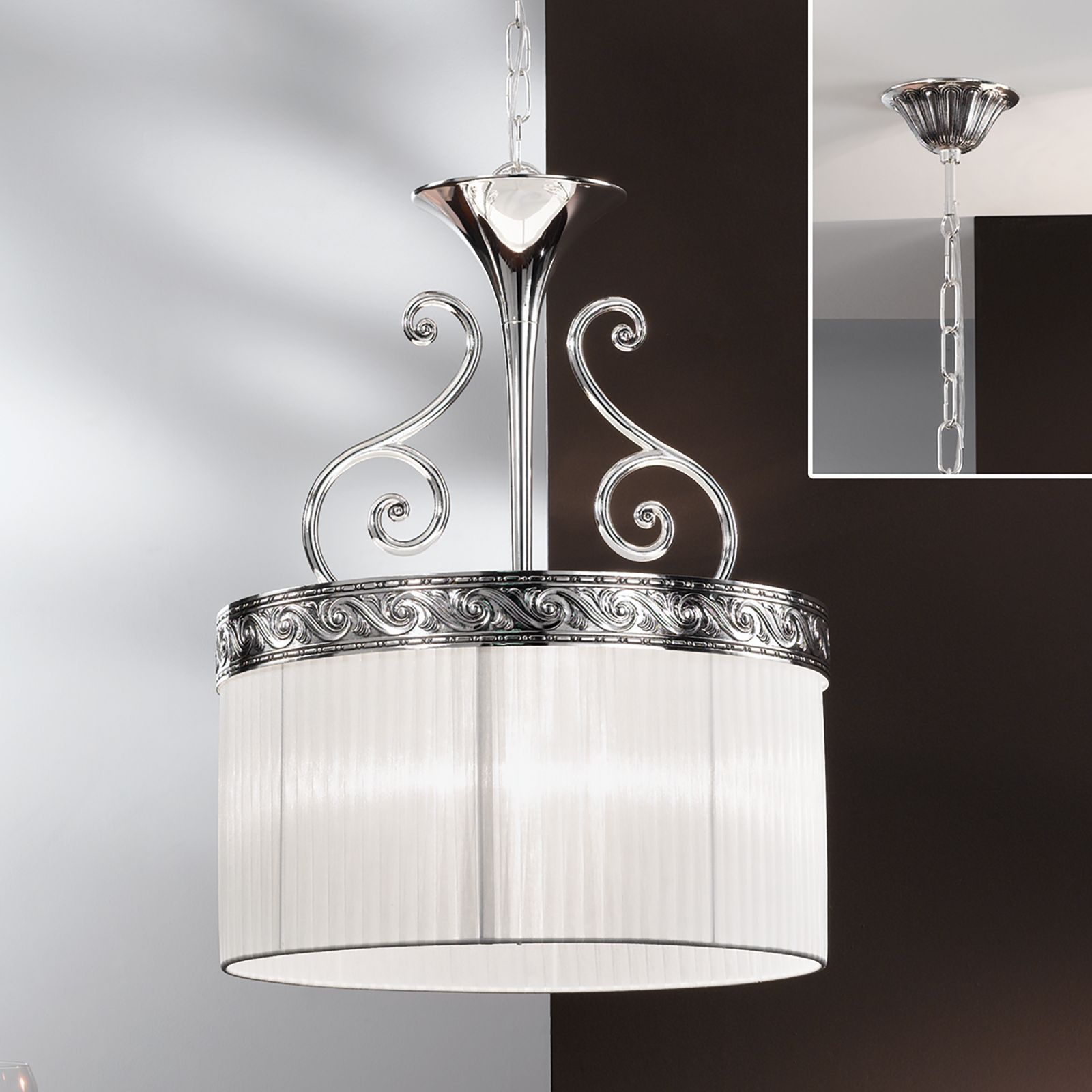 Wegen des bewährten Designs fügt sich die Hängeleuchte ANTONELLO harmonisch in klassische Interieurs. Das Leuchtengestell ist gefertigt aus Metall mit einem Finish in Antik-Silber und die Abdeckung besteht aus Organza.