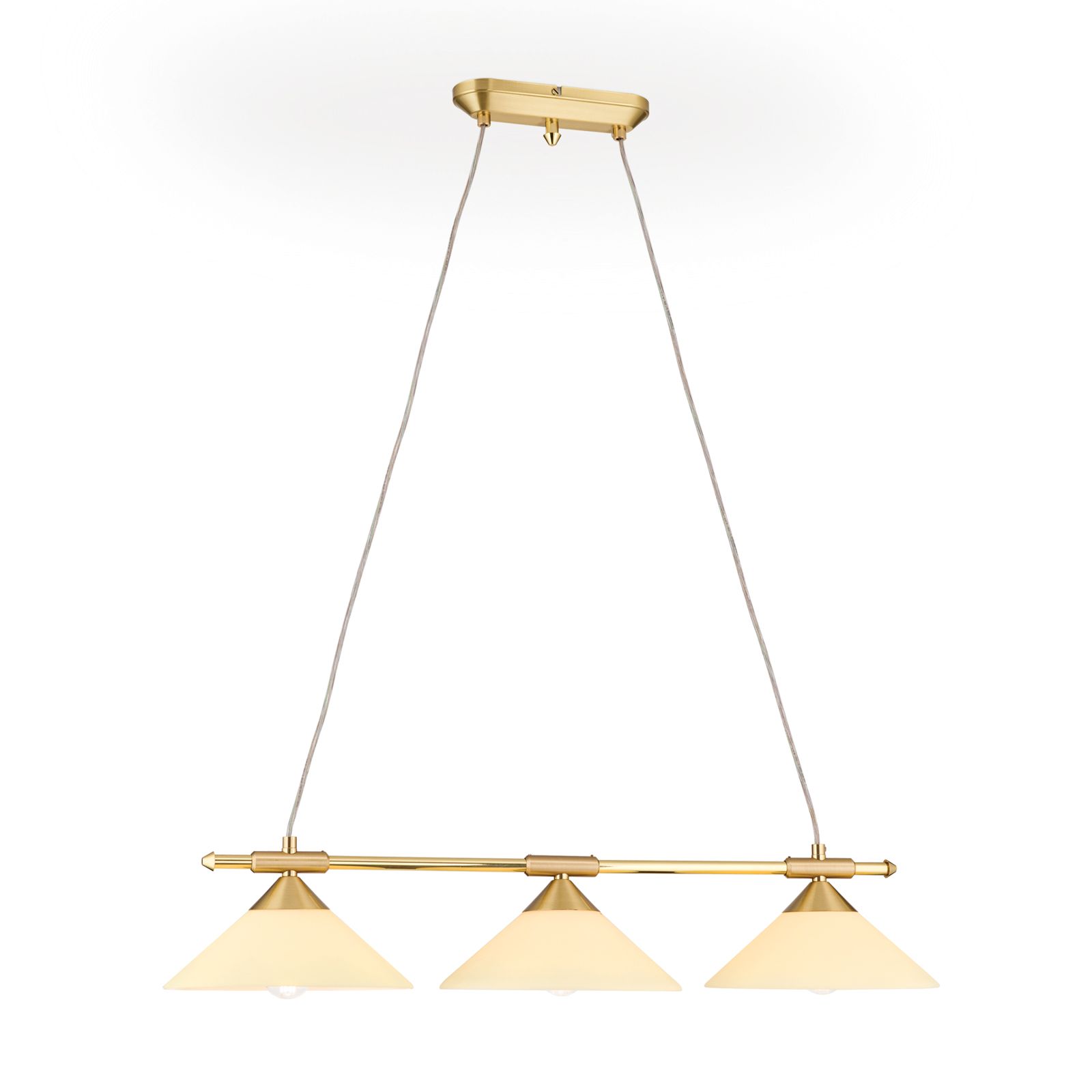 Die charakteristischen Kegelgläser der gleichnamigen Serie sind an einem horizontalen Messingrohr aufgereiht und verteilen das Licht gleichmäßig.