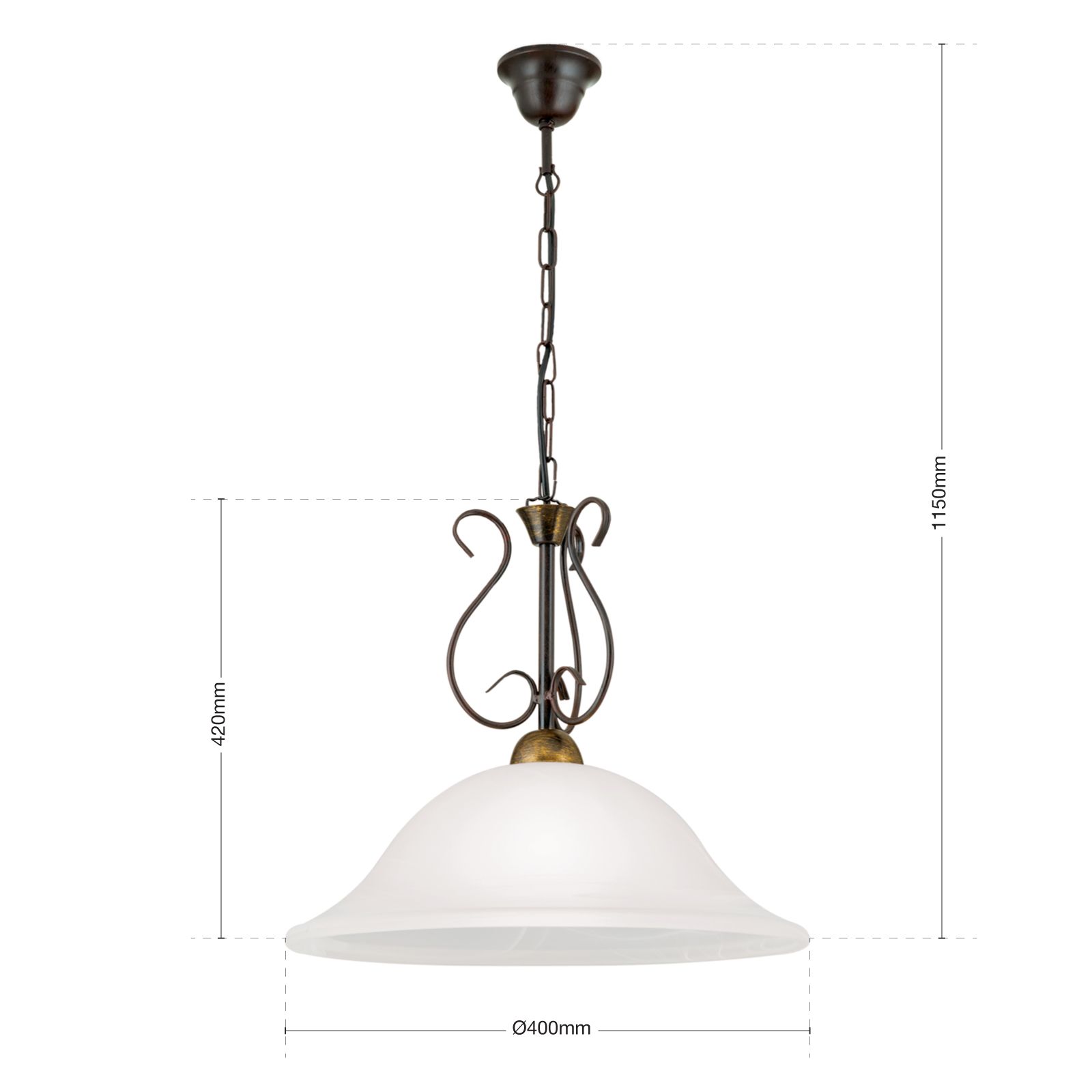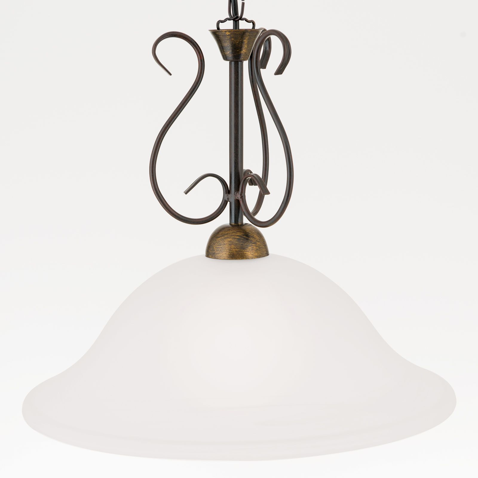 Das Stahlgestell präsentiert sich mit einer antik-goldenen Oberflächenveredelung und drei geschwungenen Zierelementen seitlich des Leuchtarms. Der opal matte Glasschirm mit einem Durchmesser von 40cm entblendet das Licht durch seine Satinierung und lässt nach unten gezielt seine Leuchtkraft strahlen. Diese Lichtwirkung ist optimal zum Beleuchten von Speisen und setzt sie somit gekonnt in Szene.