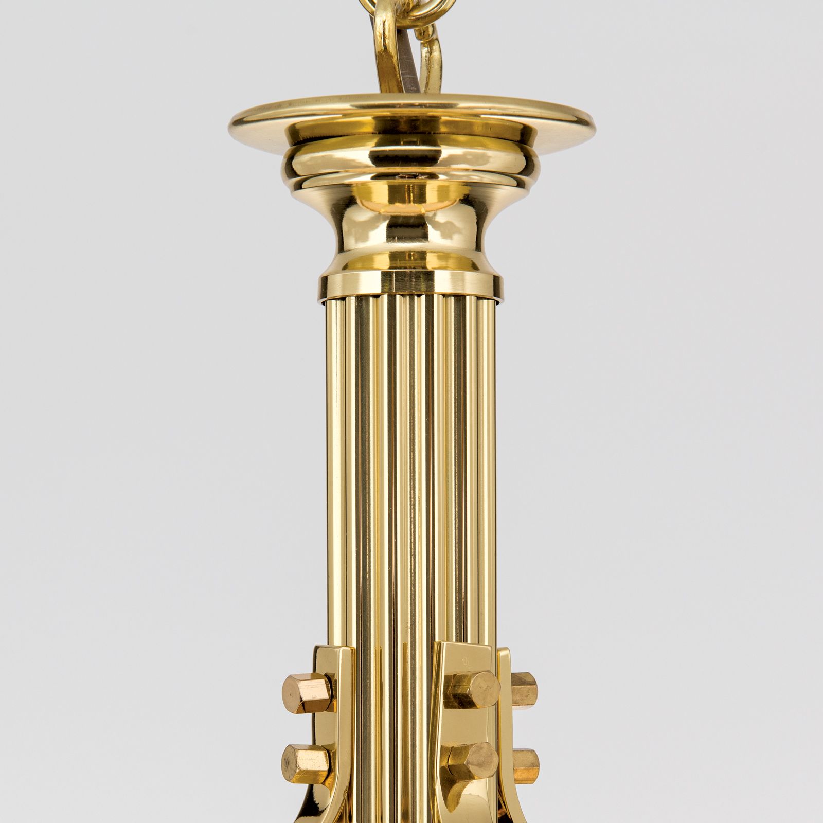 Die Hängeleuchte aus der WIENER NOSTALGIE-Leuchtenfamilie ist ein meisterhaftes Designjuwel im Geiste der Wiener Werkstätten. Formale Strenge, funktionale Effizienz treffen auf reine Gestaltungsfreude. Die Ringeinfassung des Lampenschirmes ist über schmale, elegant gebogene Messingbänder mit dem kannelierten Schaft verbunden. Die Kontaktpunkte werden nicht verblendet, sondern im Gegenteil durch kurze Stifte betont. Diese Stifte und die Fixierschrauben des Schirmes geben dem Leuchtkörper eine symmetrische, vierseitige Struktur bei einem runden Grundkörper. Die Quadratur des Kreises! Eine E27-Fassung versorgt die Leuchte mit bis zu 60 Watt Leistung.
