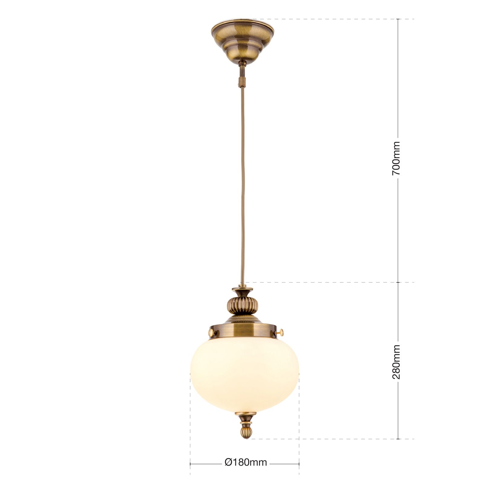 Die Hängeleuchte WIENER NOSTALGIE lässt Sie den Charme der Wiener Kaffeehauskultur in Ihren eigenen 4 Wänden erleben. Sie besticht durch ihren zeitlosen und eindrucksvollen Charakter und fügt sich ideal in klassisch eingerichtete Wohnräume ein. Das Leuchtengestell ist aus Messing gefertigt und bildet einen schönen Kontrast zum opal-matten Glasschirm, der für eine homogene und weiche Streuung des Lichts sorgt. Die Leuchte ist mit 1 E27-Fassung versehen und kann mit maximal 60 Watt betrieben werden. Falls gewünscht, kann sie mit einem Dimmer in der Helligkeit eingestellt werden und so für die passende Lichtstimmung gesorgt werden.