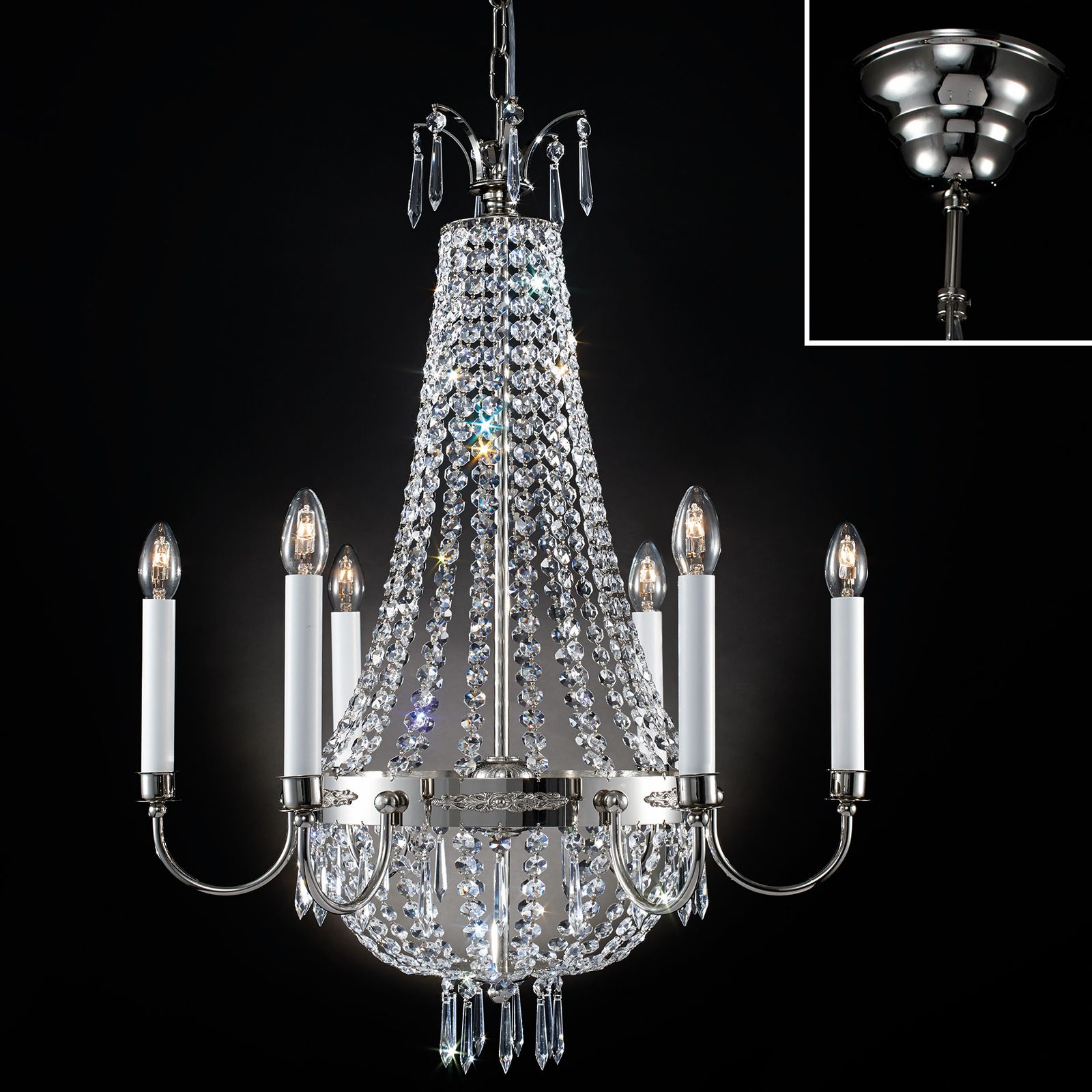 Prunkvoll und klassisch präsentiert sich der Kronleuchter EMPIRE CRYSTAL mit seinem beeindruckenden Kristallbehang aus exklusivem Asfour-Kristallglas. Besonders gut eignet er sich für repräsentative Wohn- oder Objekträume im klassischen Stil und sorgt dort für spektakuläre Lichtverhältnisse.