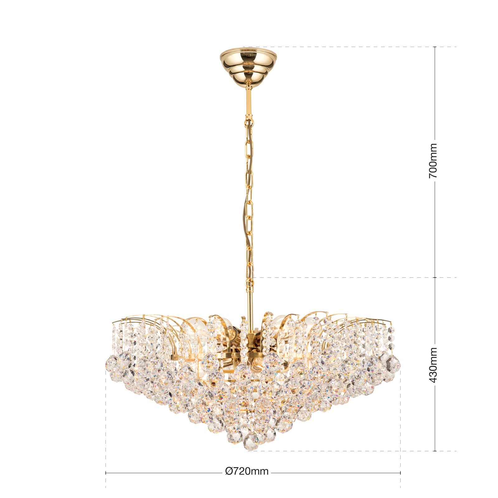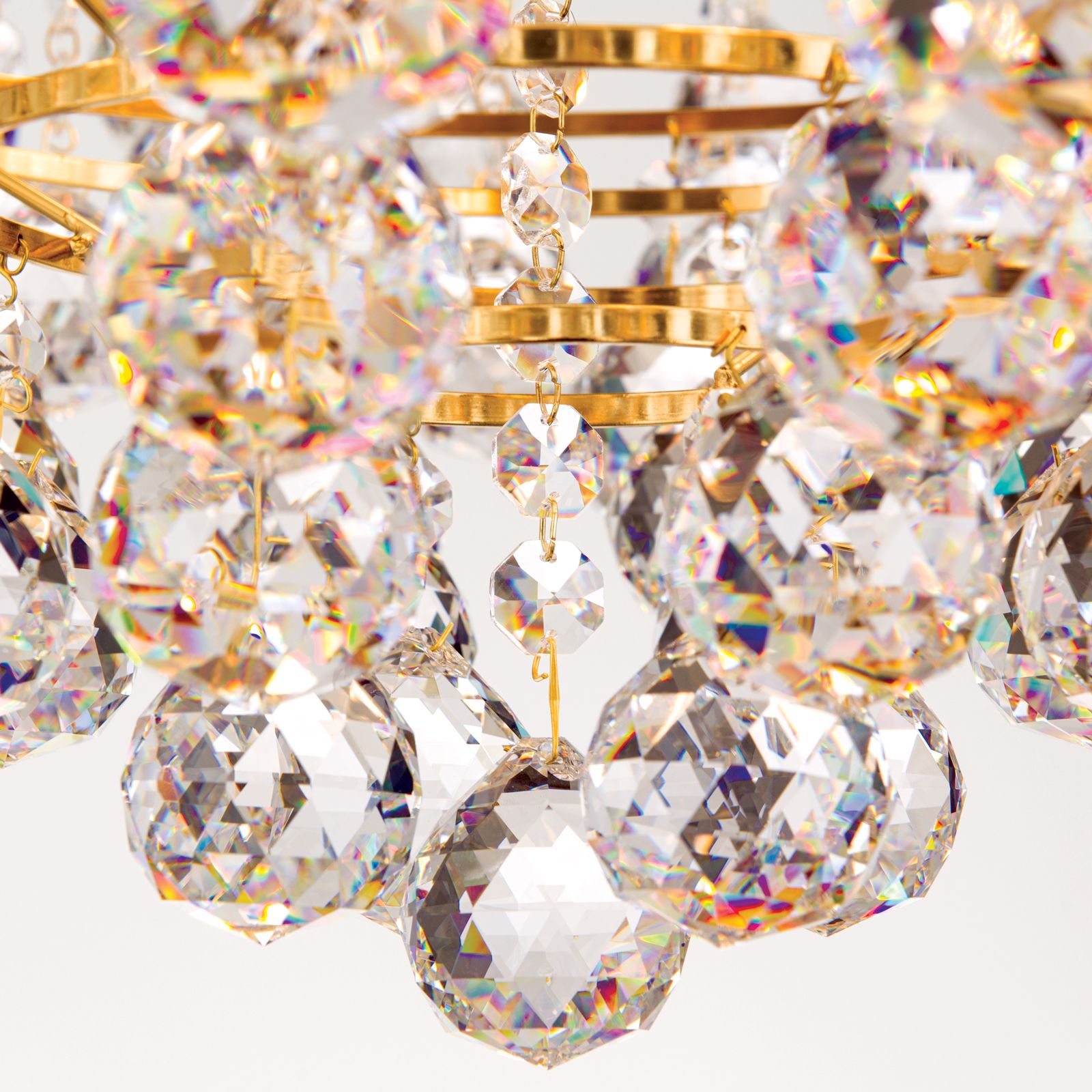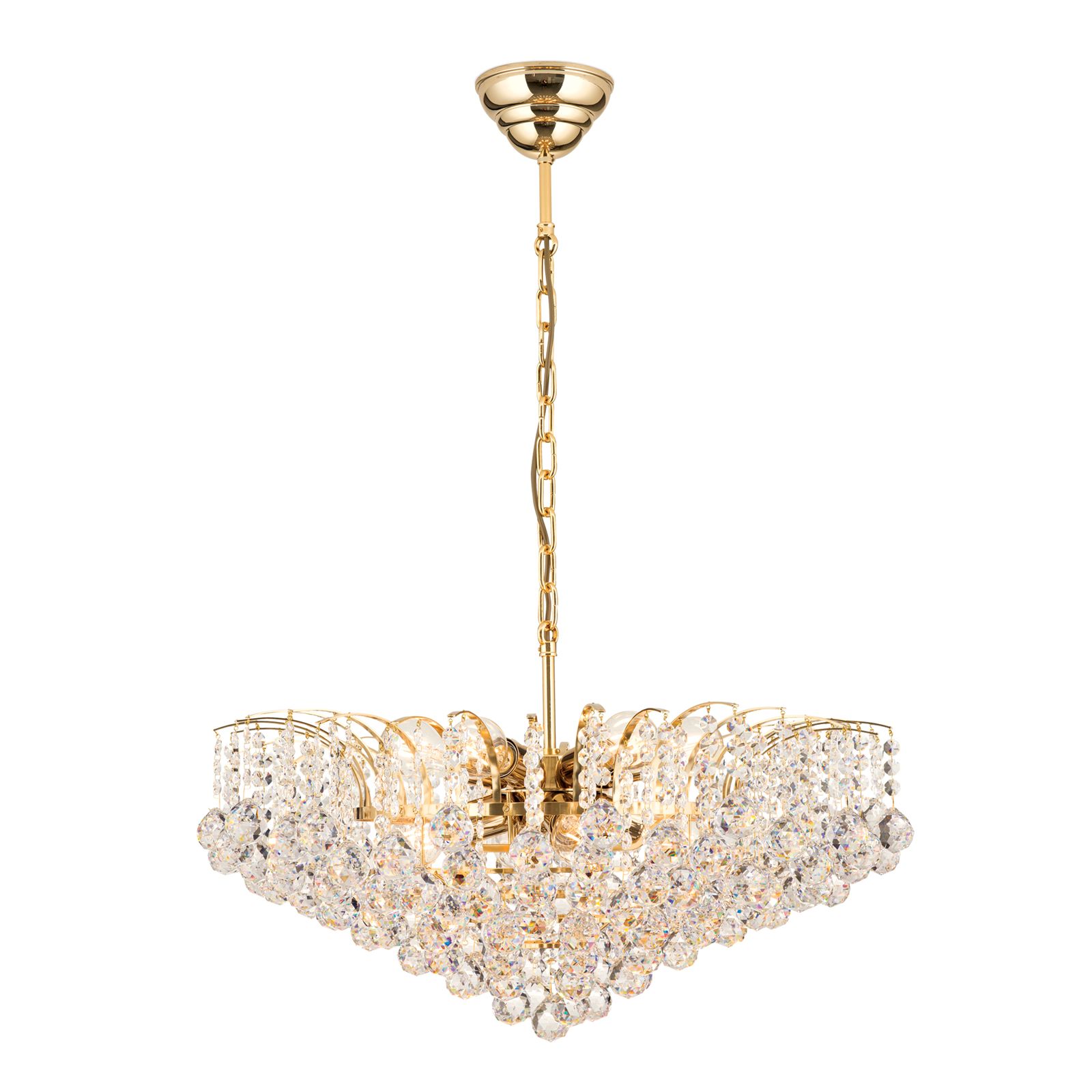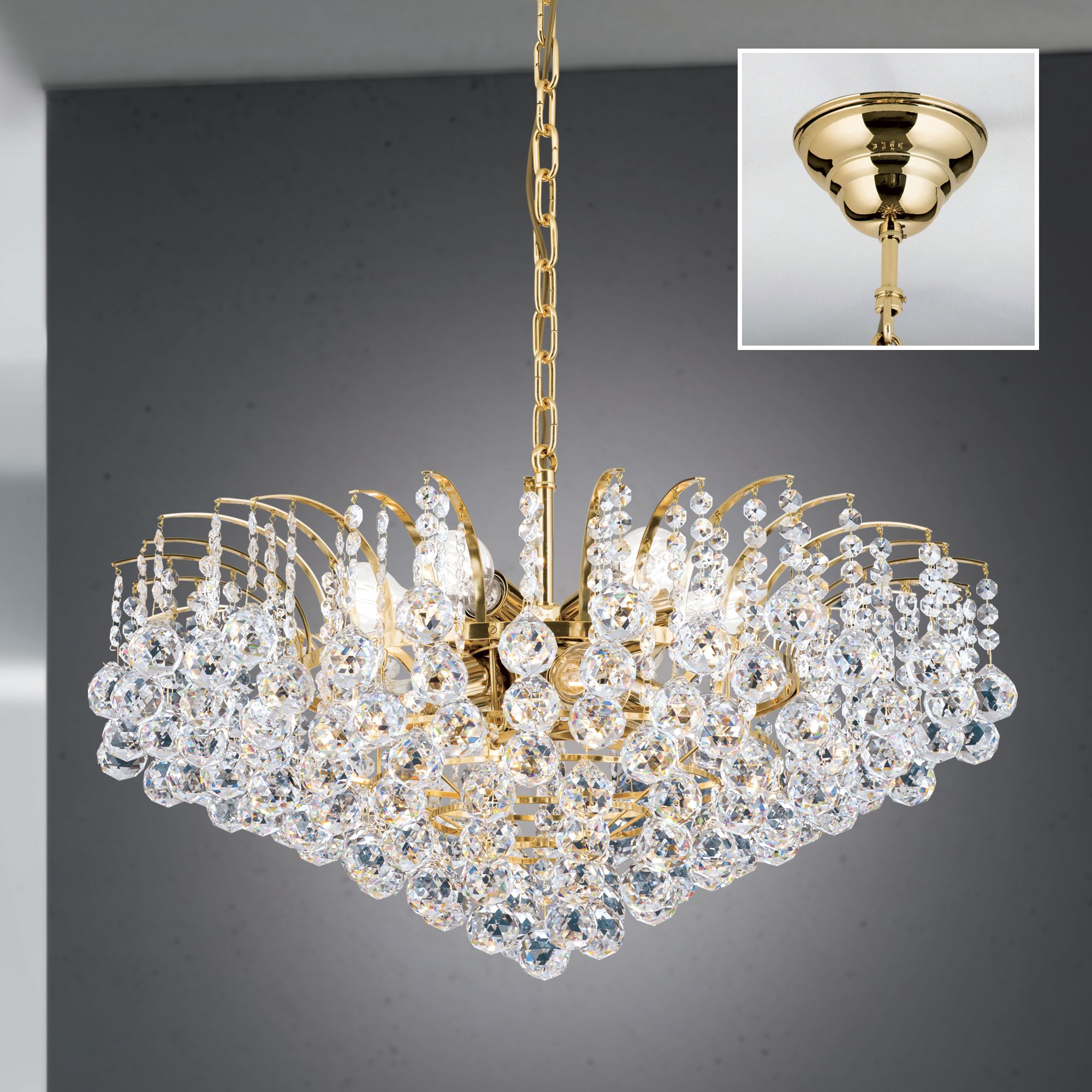 Wie zu Kristallen gefrorene Wassertropfen eines Springbrunnens wirkt der reiche Behang des Kronleuchter KRISTALL KLASSISCH. Das glänzende zarte Vollmessinggestell mit seinen 10 E27-Fassungen versteckt sich gekonnt hinter den vielen Kristallen aus der Manufaktur Asfour und verstärkt das Glitzern, welches bei Lichteinfall entsteht. Der Kristallbehang besteht aus zu Ketten verbundenen facettierten Kristallkugeln, welche mit Kristallkoppen kombiniert werden. Aufgrund seiner Größe eignet er sich für größere Räume, wo er seine volle Wirkung und Pracht entfalten kann. Das einer Fontäne ähnelnde Design des Kronleuchters eignet sich sowohl für klassische als auch moderne Interieurs.