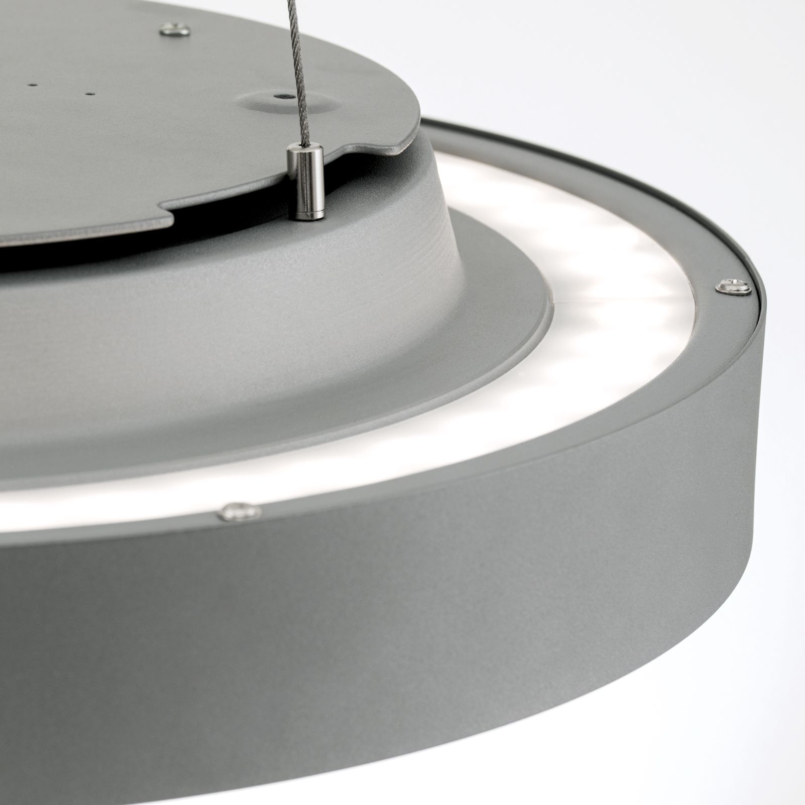 Das Aluminium-Gestell ist mit einem Titan-matten Oberflächenfinish versehen und umfasst einen Kunststoffdiffusor, welcher für eine homogene warmweiße (3000 Kelvin) Lichtverteilung sorgt, ohne zu blenden.