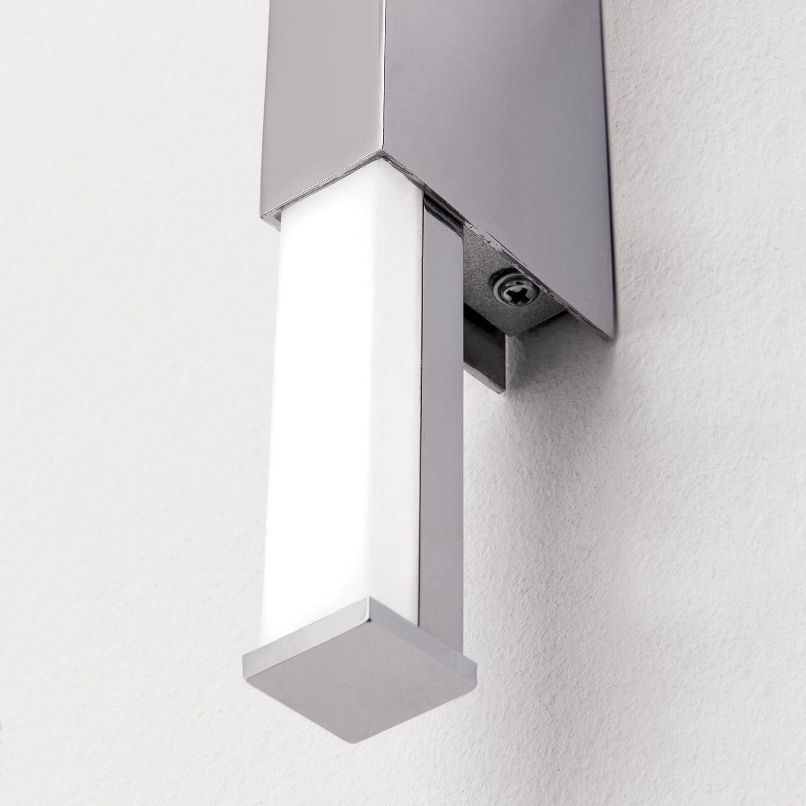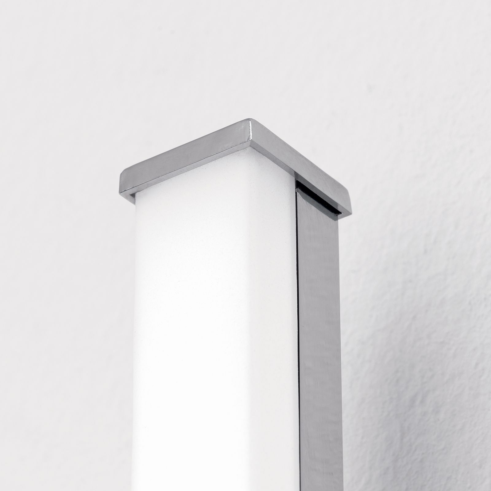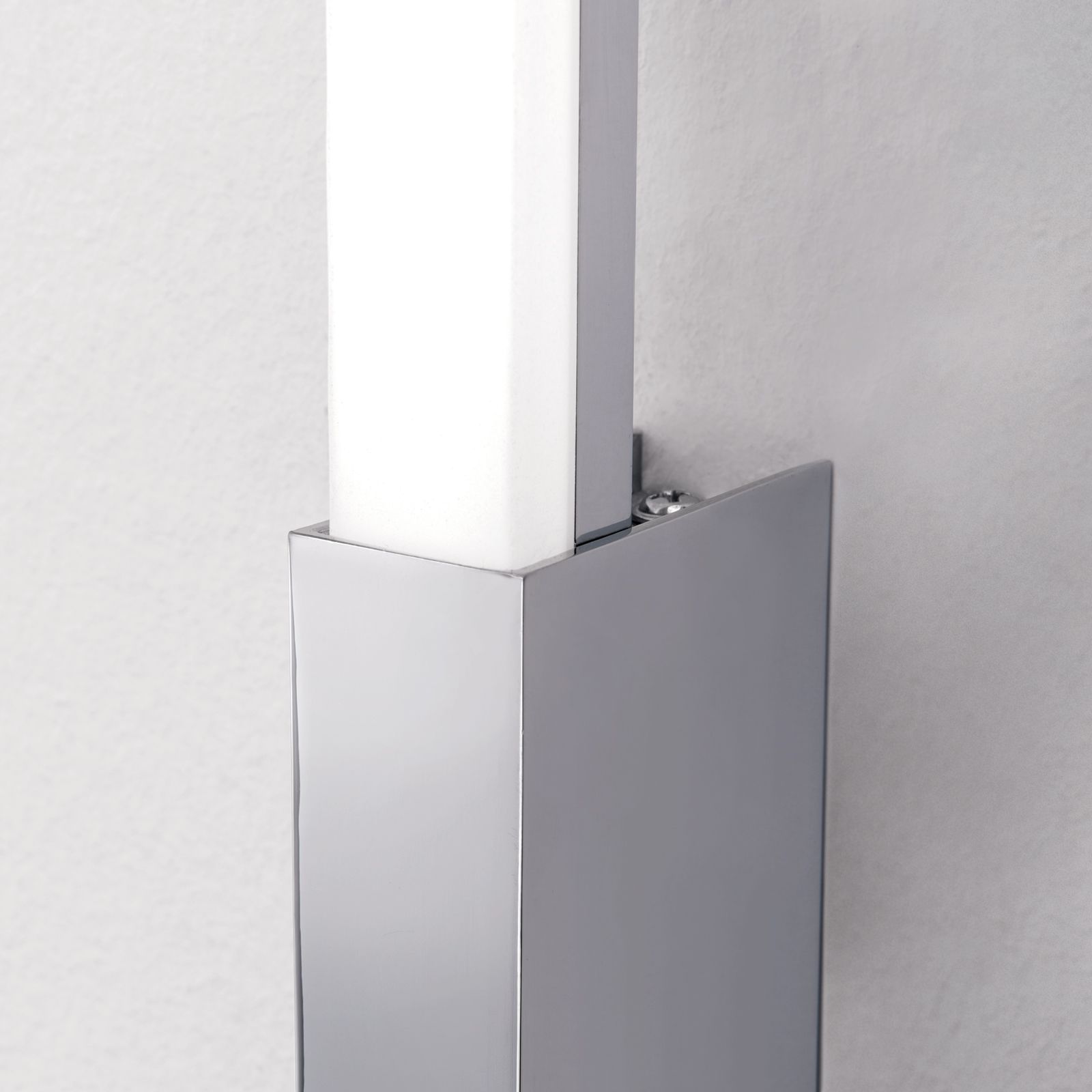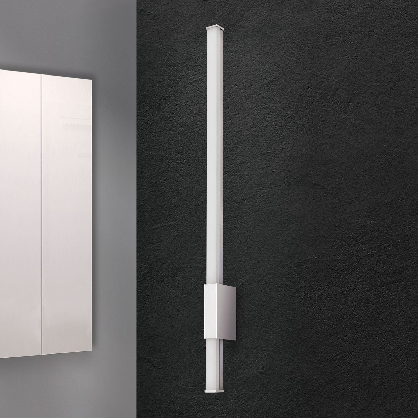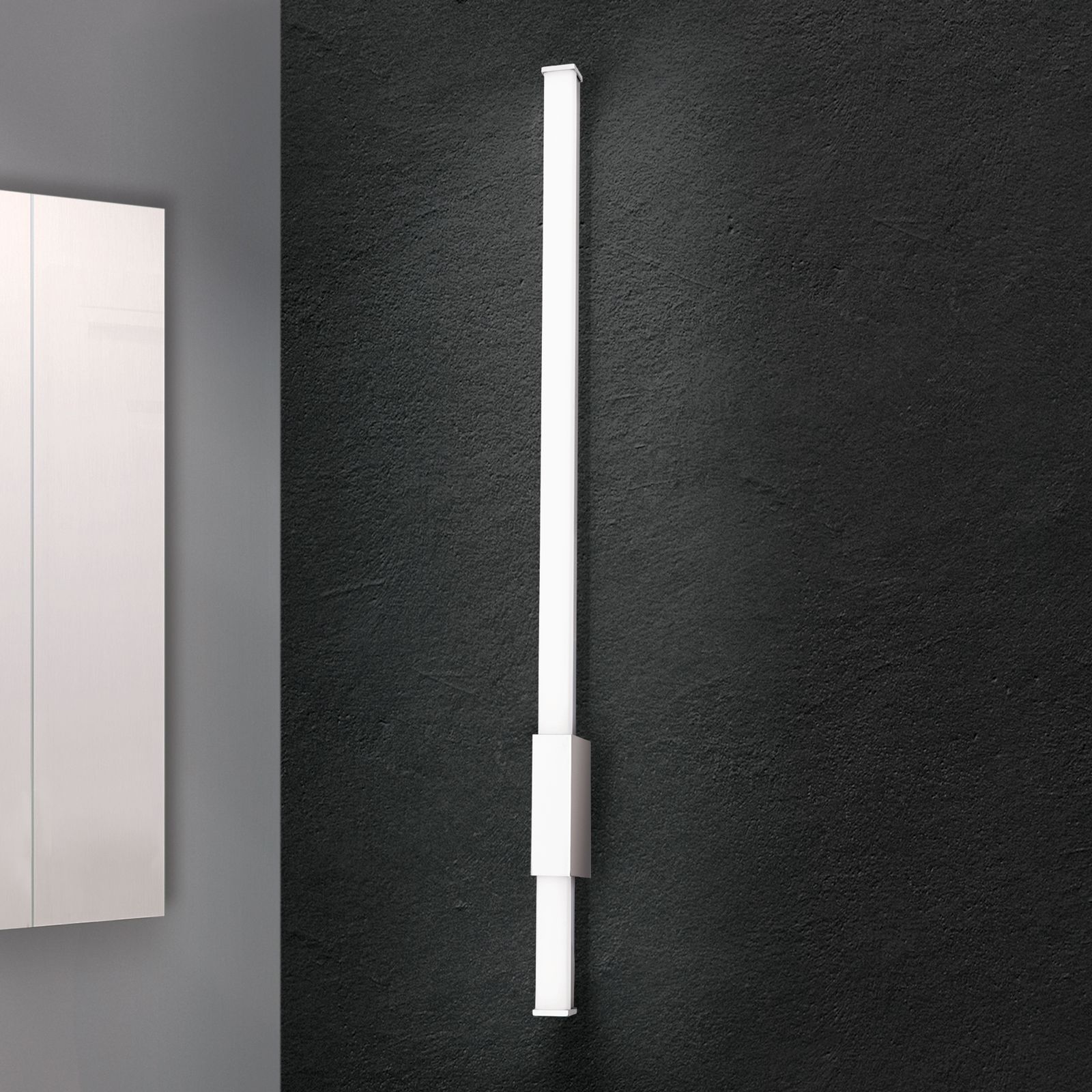 Mit einer senkrechten Montage an der Wand tritt sie nicht nur besonders schlicht auf, sondern glänzt auch durch ein modernes Design. Verchromte Stahlelemente machen sie zeitlos, während die LED Platinen ein angenehm warmweißes Licht abgeben - und das dank satinierter Kunststoffabdeckung ohne zu blenden.