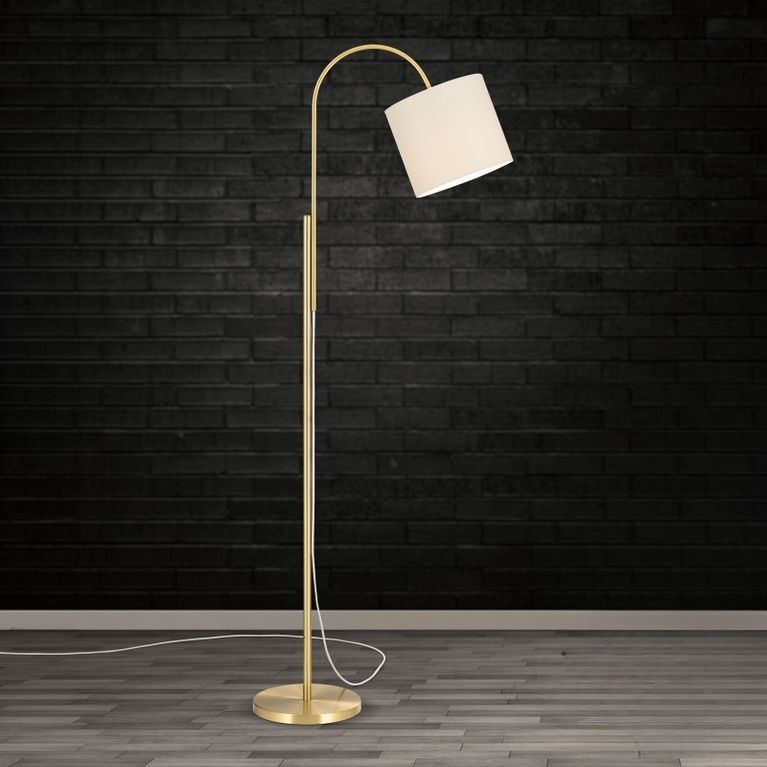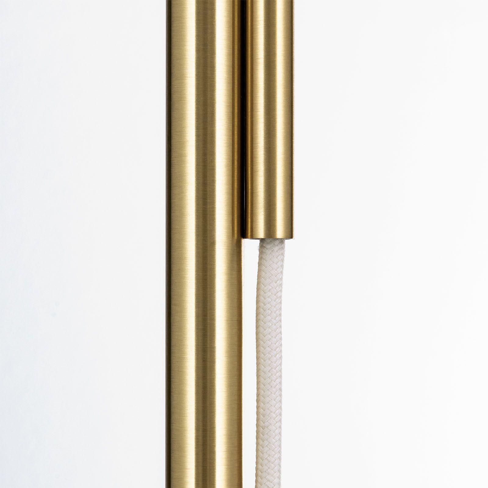 Hochwertige Materialien wie eine Montur aus Messing, ein matt glänzender weißer Textilschirm und ein farblich abgestimmtes Textilkabel mit Wippschalter verleihen der Leuchte eine schlichte Eleganz.