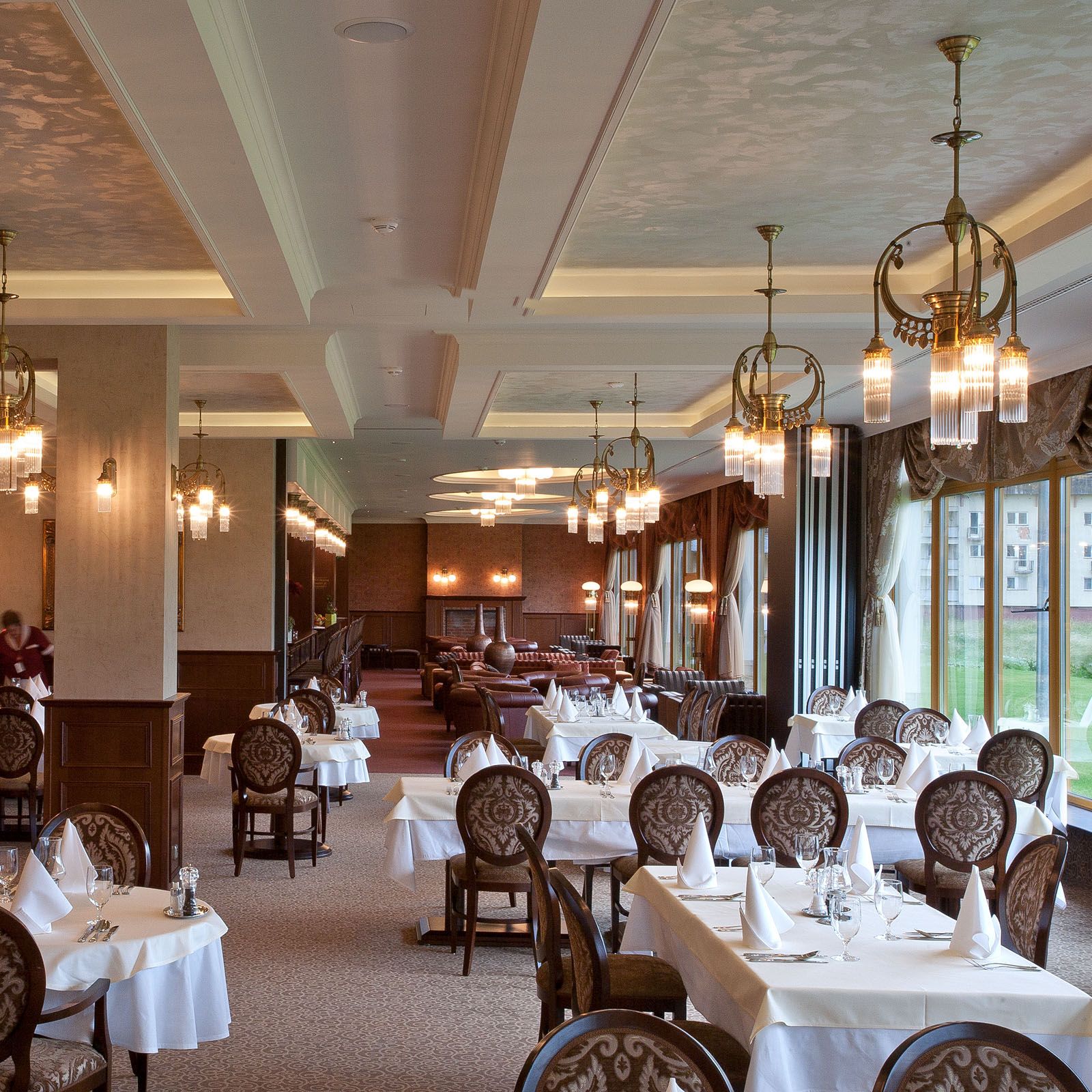 Der 4-flammige Luster aus der ADELE-Reihe ist ein Gesamtkunstwerk. Die drei Arme wirken wie blumenverzierte Französisch Hörner, die Bacchus zu Ehren erklingen. Messingenes Blattwerk umrankt stützend die Lampenbögen wie wilder Wein, der eine Laube liebevoll umfängt. Der mittlere Zylinder ist ein Quell, aus dem Licht sprudelt. Als Luster in einer Wohnzimmermitte oder über einem Esstisch erfährt man das erhabene Gefühl von Edlem umgeben zu sein. Auch einem Schlafzimmer wird ein besonderer Charakter von zeitloser Schönheit verliehen. Die Leuchte ist mit vier E14-Fassungen für je bis zu 40 Watt ausgestattet.