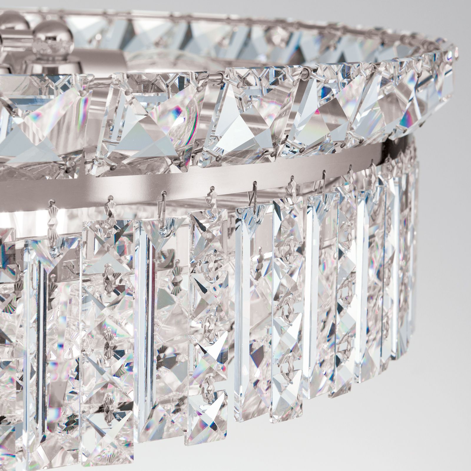 Das runde Gestell ist aus Vollmessing gefertigt und die Oberfläche verchromt. Zahlreiche STRASS® Swarovski® Crystal-Kristalle, die unterschiedlich geschliffen sind, sorgen durch die Lichtreflexionen der besonderen Art. Prismen und Quadratsteine werden gekonnt auf verschiedenen Ebenen miteinander kombiniert und den Abschluss bildet dabei eine große Kristallkugel, die mittig eines Rings aus Kristallen platziert ist.