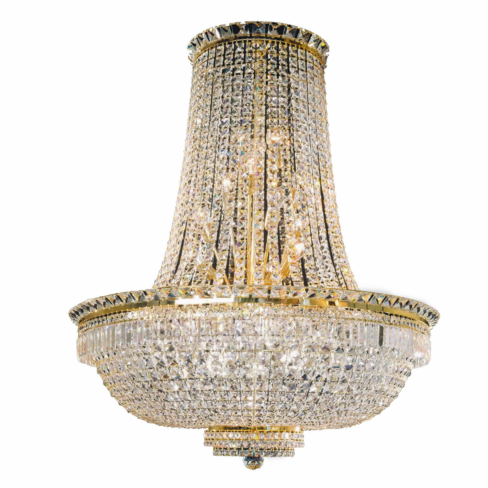 Für das imposante Erscheinungsbild des 32-flammigen Korblüsters AMBASSADOR sind die unzähligen STRASS® Swarovski® Kristalle in Kombination mit 24-Karat vergoldeten Vollmessingteilen verantwortlich und machen die Großleuchte zu einem extravaganten Gestaltungselement. Mit einer bemerkenswerten Gesamthöhe von 270 Zentimetern und einem Durchmesser von 120 Zentimetern eignet er sich ausschließlich für groß dimensionierte Räumlichkeiten, wie Festsäle, Konferenzräume oder Hallen. Die Kristallketten aus Koppen- und Prismenform erzeugen bei Lichteinfall wunderbare Lichtreflexionen im Raum, die zum Stauen einladen.