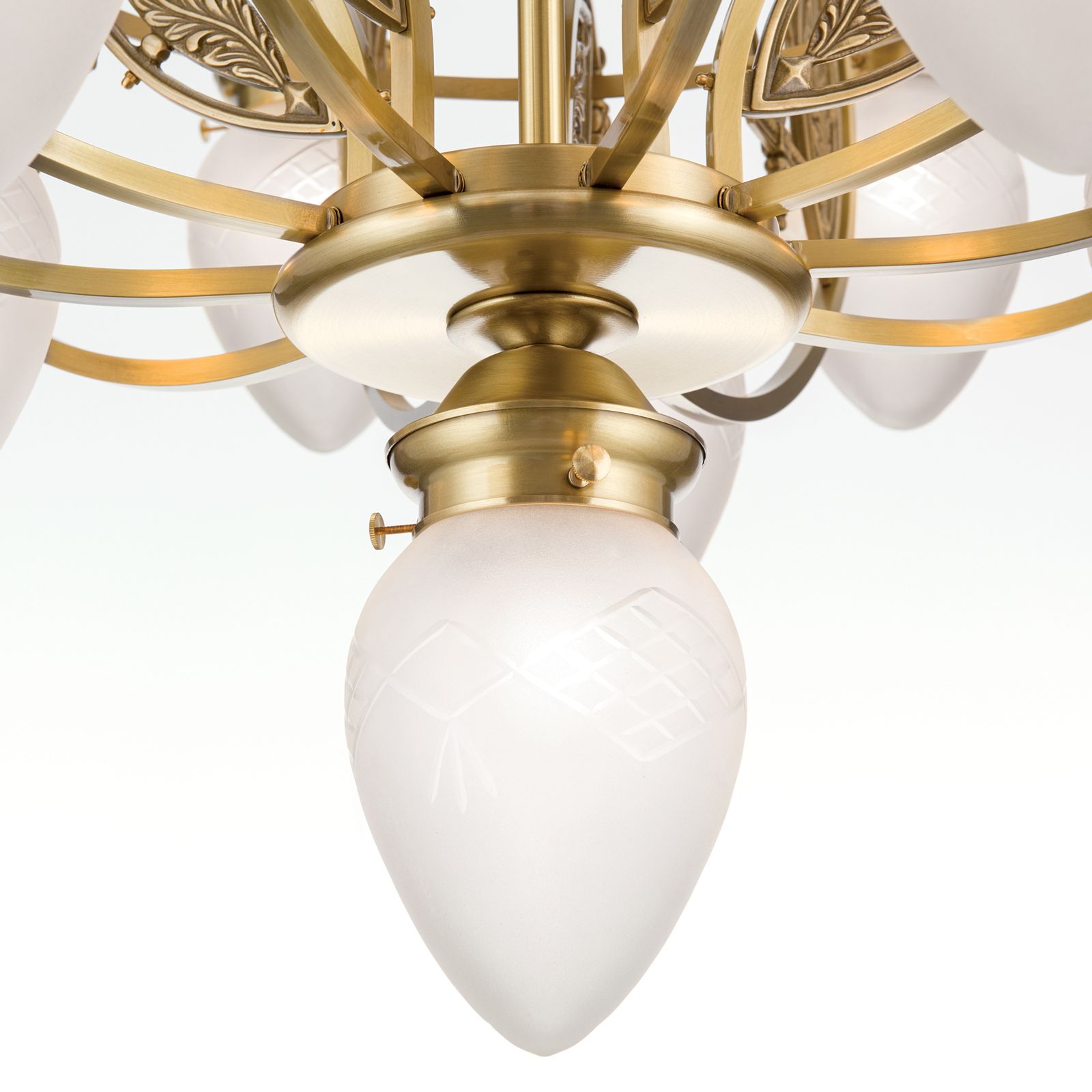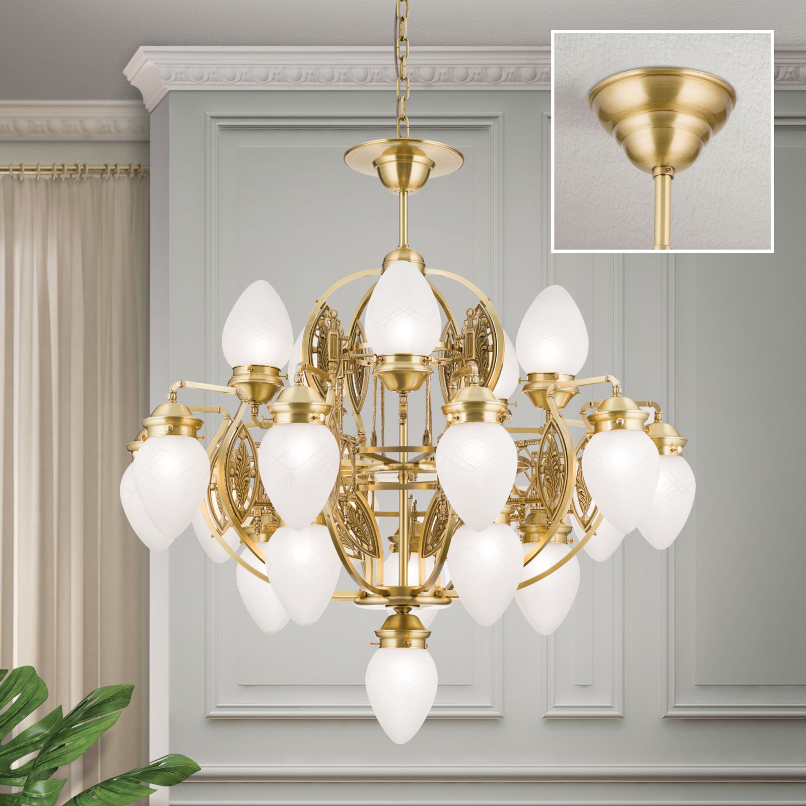 Die Jugendstil-typische spielerische Experimentierfreude manifestiert sich in der Verschlungenheit der Arme, die gleichzeitig die Konstruktion stützen und das Wesen des Designs ausmachen. Wie eine dichte Brombeerhecke ranken sich die aufwärts und abwärts gerichteten Glasschirme um den zentralen Schaft. Die Zierelemente sind aufgrund ihrer Originalität kaum zuordenbar und bieten daher die Möglichkeit, sich in historistische, barocke oder Jugendstil-Interieurs einzugliedern.