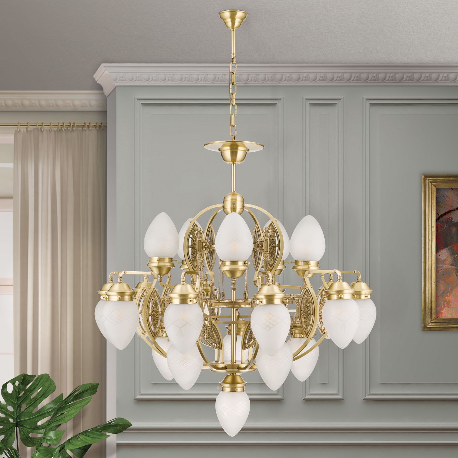 Mit einer Gesamthöhe von 178 Zentimetern stellt der 21-flammige Kronleuchter aus der BUDAPEST-Kollektion ein zentrales Einrichtungs- und somit Gestaltungselement dar.