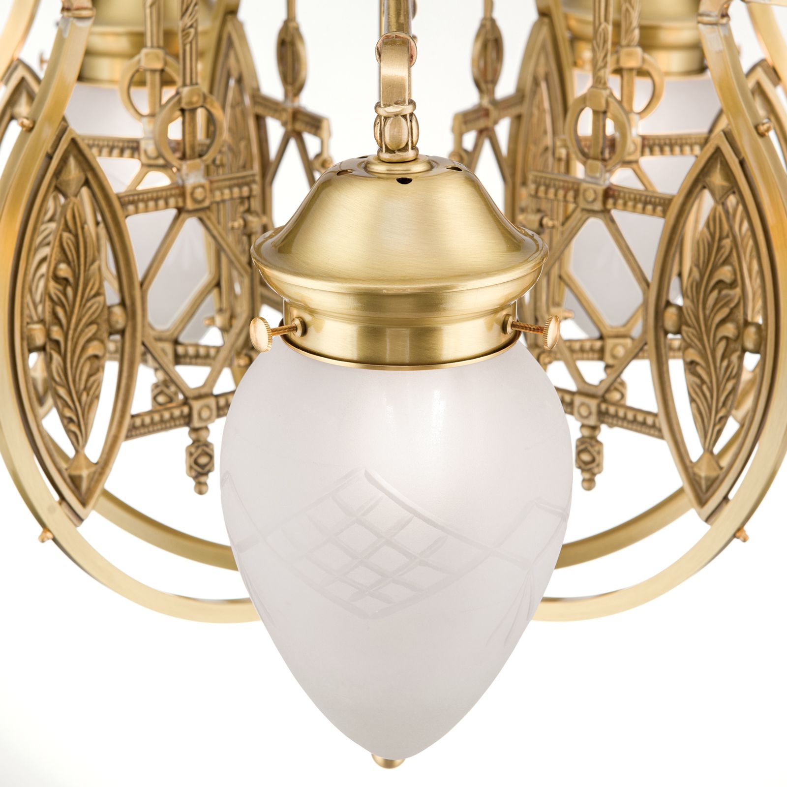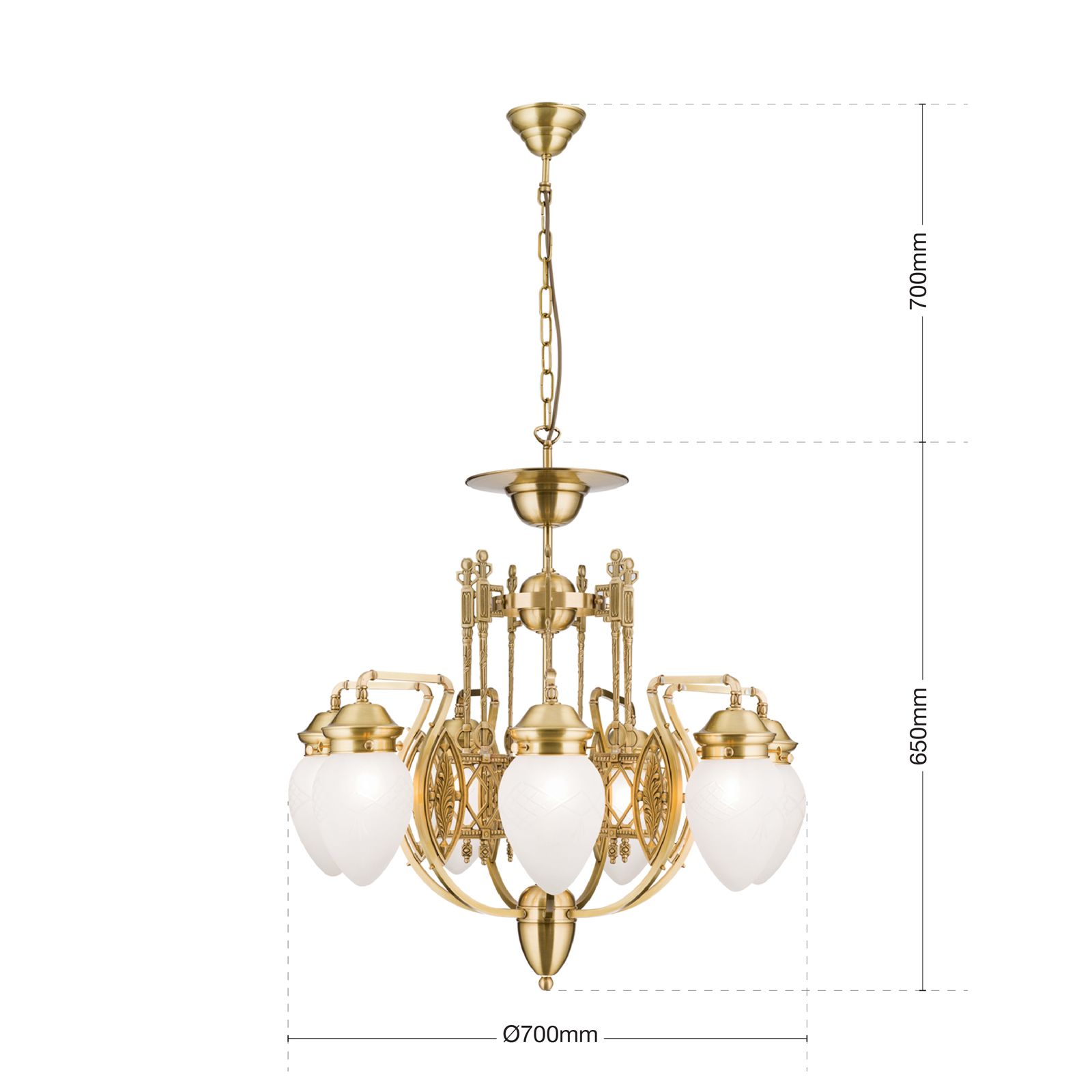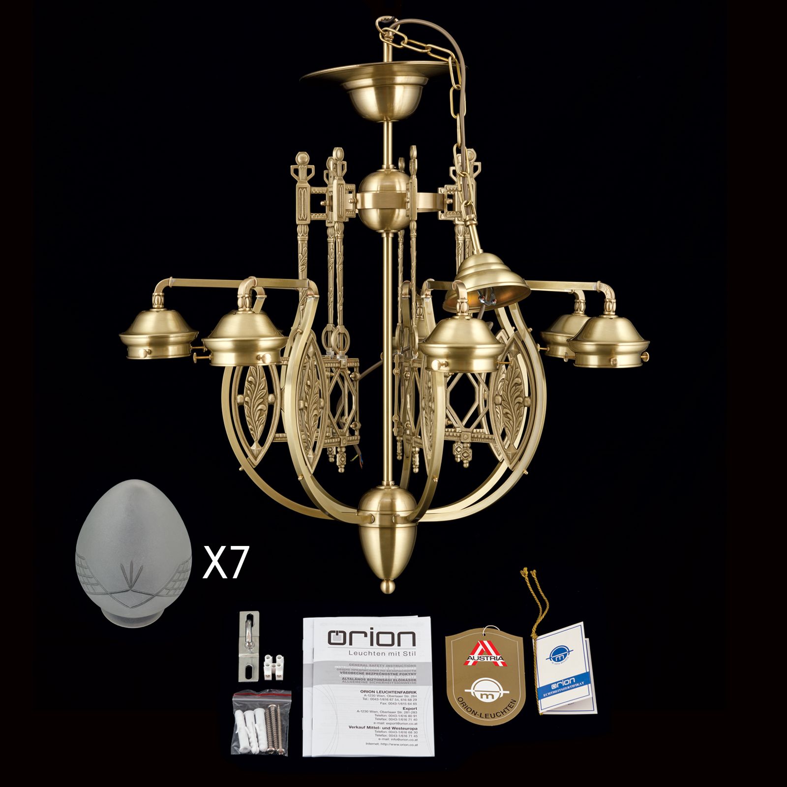 Der Luster aus der BUDAPEST-Reihe ist ein wahrhaft „königliches“ Einrichtungsobjekt. Die Anordnung der sieben Arme um eine zentrale Säule erinnert in der Tat an eine Krone. Die Säule ziert gleichsam ein Reichsapfel, um den sich Schäfte gruppieren, die die Leuchtenarme tragen. Kunstfertig geformte Bogen gehen in helmförmige Lampeneinfassungen über. Unverkennbar vom Jugendstil inspirierte Ornamente - Kränze, Rauten - und historisierendes Blattwerk runden die erfindungsreiche Komposition ab.