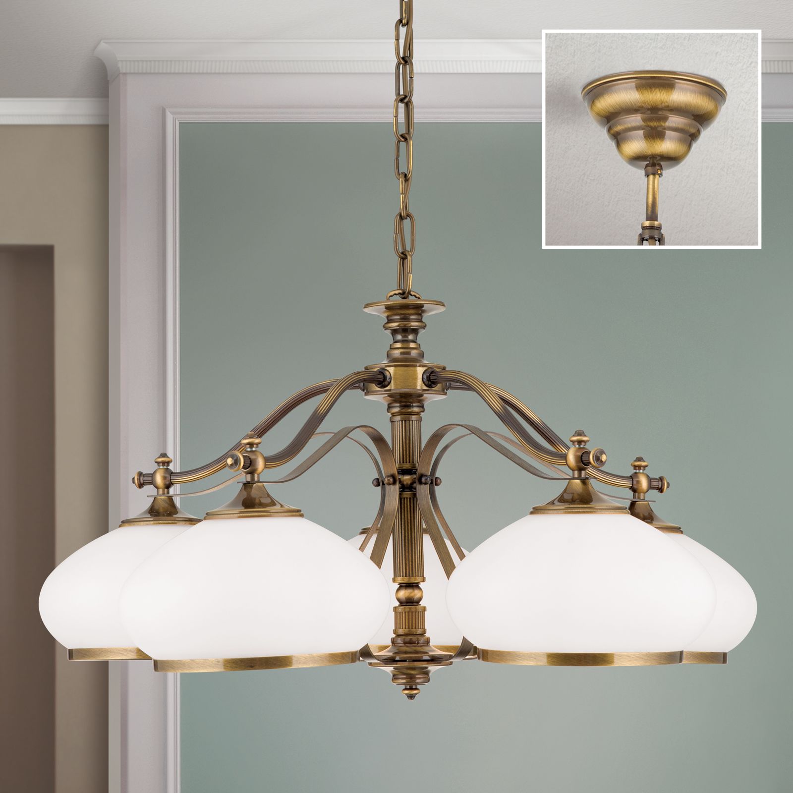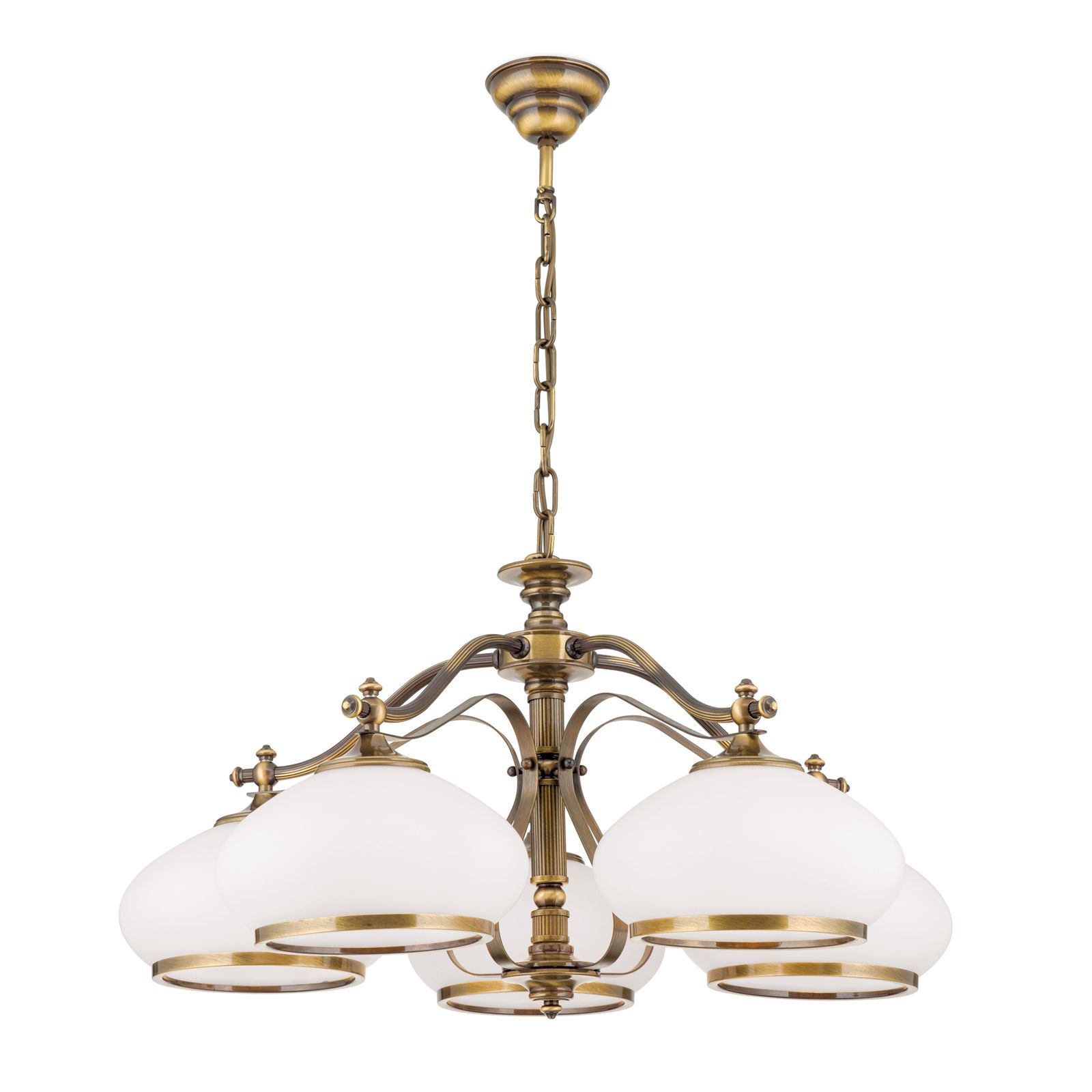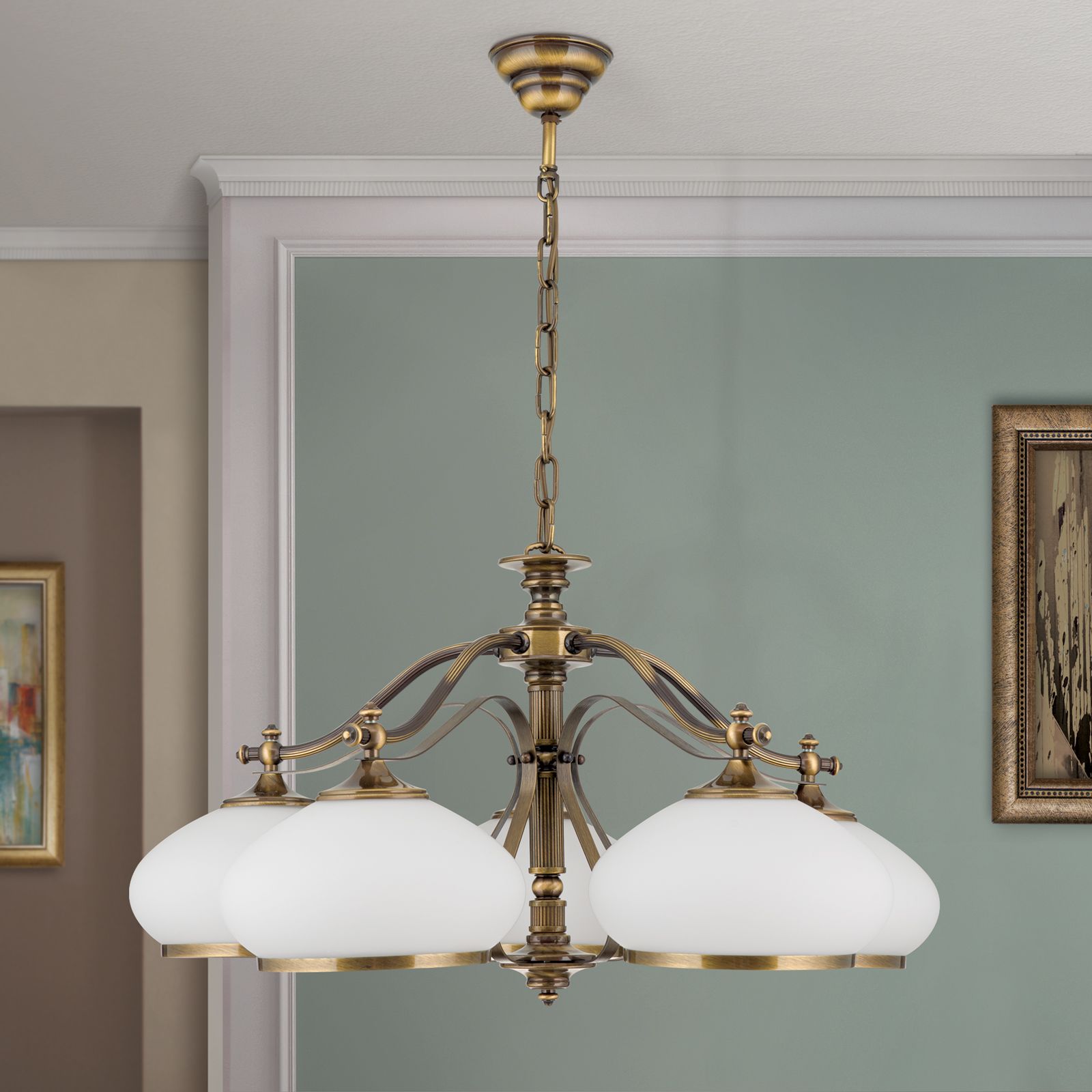 Luster EMPIRE, 5-flammig, Patina, mit opal patinierten Gläsern