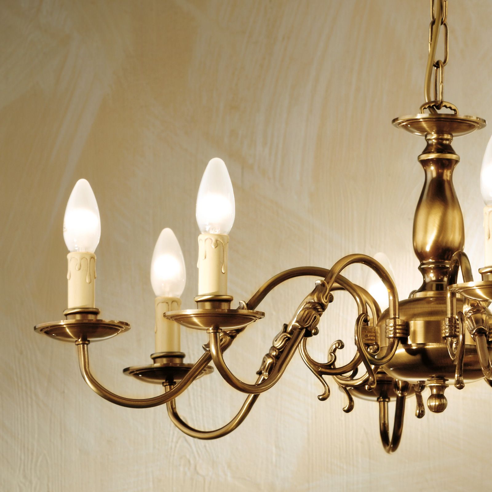 Der Leuchter verfügt über fünf E14-Fassungen für je bis zu 40 Watt und ist auch in einer 3-flammigen und 5-flammigen Version erhältlich.