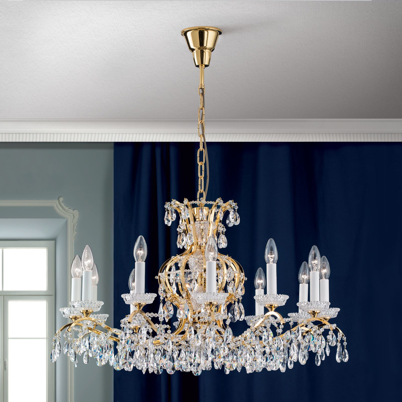 Der 12-flammige Luster aus der Kollektion HIROHITO gesellt sich mit strahlender Erhabenheit zu stilvollen Ensembles mit wertvollen Stoffen und warmen Farben. Schwungvolle Spangen reihen sich rund um den zentralen balusterförmigen Schaft aus Kristall. Dadurch entsteht eine bauchige Vasenform, die an die Grundstruktur flämischer Barockluster erinnert. Die Lusterarme tragen Bleikristallkerzentassen und Fassungen in Kerzenoptik. Der dichte Kristallbehang erzeugt ein funkelndes Meer aus glitzernden Lichtspielen. Für festliche Beleuchtung sorgen zwölf E14-Fassungen für je bis zu 40 Watt. Damit lassen sich elegante Soireen begehen, feierliche Speisetafeln erhellen oder Kunden in eleganten Eingangsbereichen empfangen.