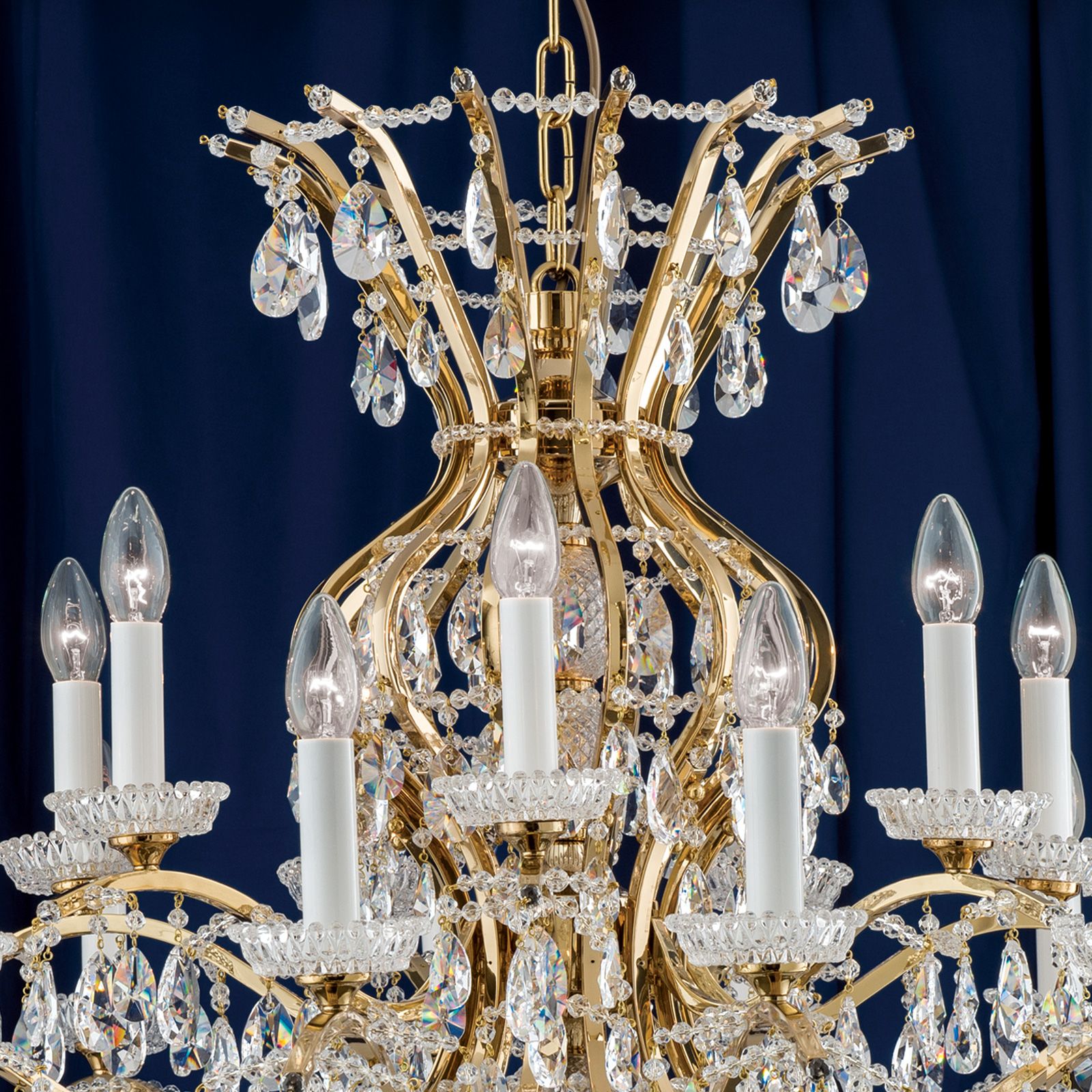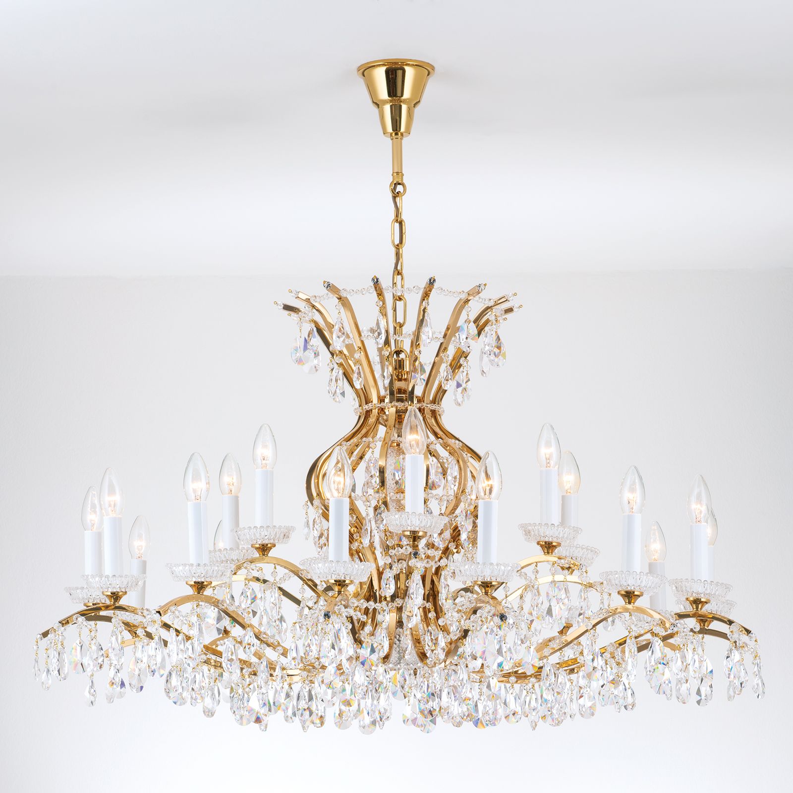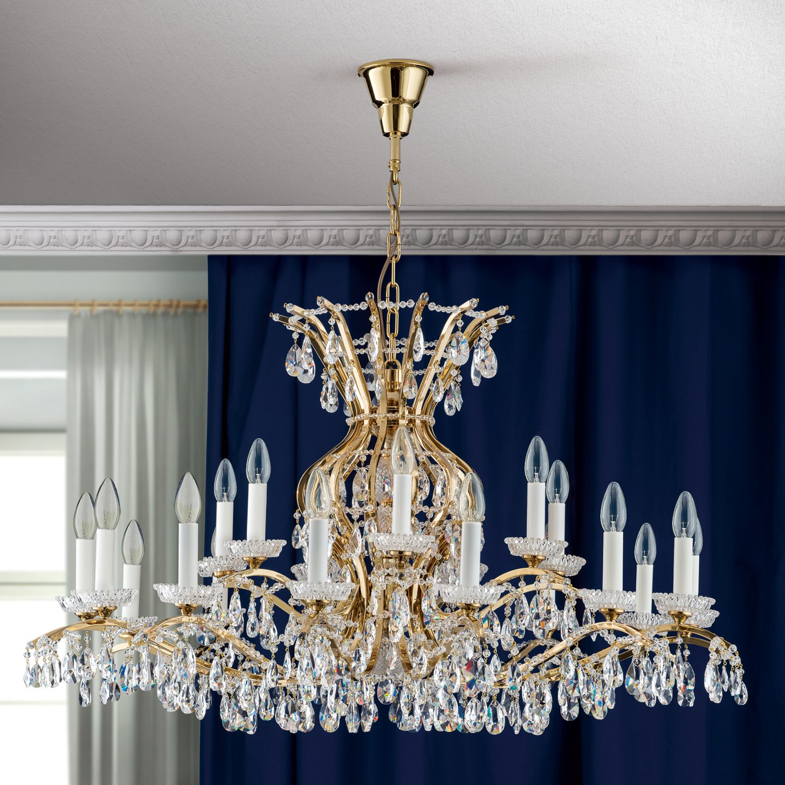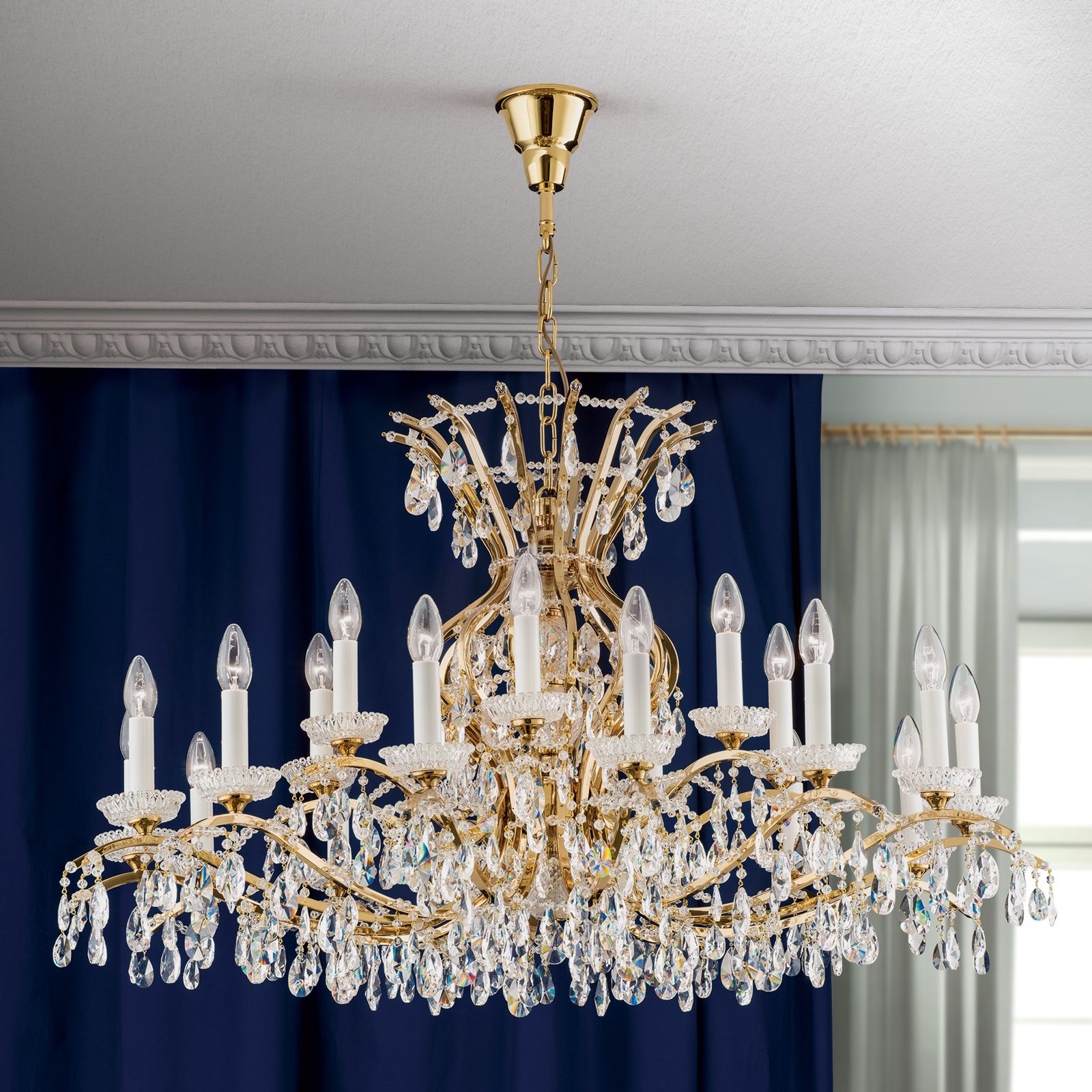 Der 21-flammige Luster aus der HIROHITO-Reihe geizt nicht mit seinen Reizen: Ein vergoldeter Korpus aus Vollmessing mit üppigem Kristallbehang gleißt wie ein sommerlicher Sonnenstrahl in der Raummitte. Aufwendig geformte Spangen umkreisen den kristallenen Mittelschaft und gehen über in schwungvolle, weit ausladende Arme. Zwei Kerzenstöcke bilden einen hell leuchtenden Lichterreigen. Hohe Räume mit großzügigen Dimensionen geben diesem Kronleuchter den Platz, den er verdient. Warme Farbtöne, samtene Vorhänge, fließende Stoffe in einem stilvollen Dekor bilden in Verbindung mit dieser Lichtinstallation ein harmonisches Ganzes. Der Kronleuchter verfügt über 21 E14-Fassungen zu je bis zu 40 Watt.
