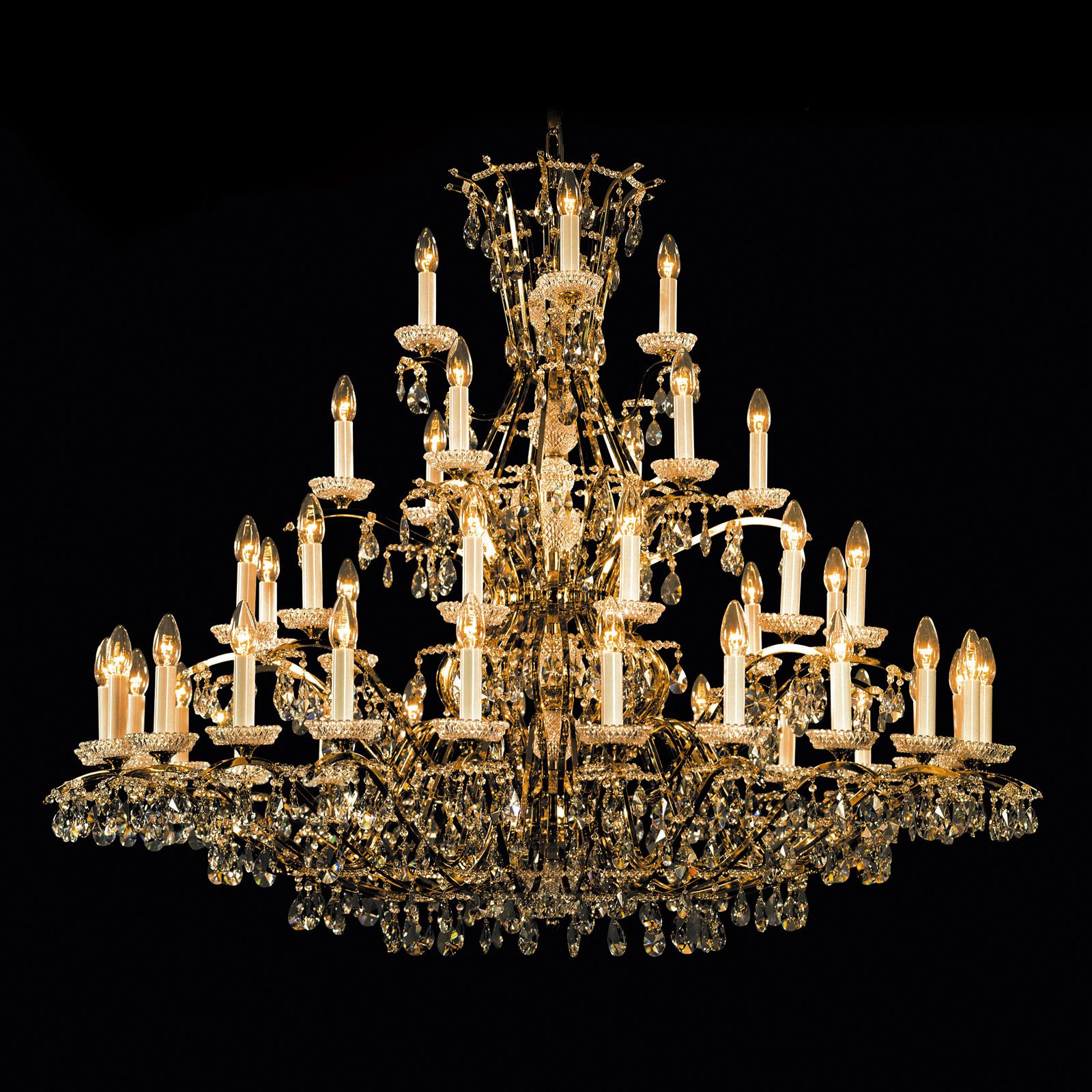 Der 45-flammige Kronleuchter aus der HIROHITO-Kollektion ist fraglos der König unter den royalen Lustern dieser Serie. Vier sich nach unten verbreiternde Flammenkränze winden sich um die mit Kristall verblendete Mittelsäule. Ein mit Goldveredelung nicht geizendes Vollmessingkorsett trägt die gewaltige Konstruktion dieses Lusters. Ausladende Arme im Stile der Maria-Theresien-Kronleuchter tragen das vielflammige Licht weit in den Raum. An der Unterseite bietet sich den Betrachtenden ein funkelndes Meer aus Myriaden von Kristallen. Die Lichtwirkung ist ob der schieren Lampenmenge überwältigend. Die unzähligen Glanz- und Reflexkörper bereichern dieses Erlebnis um endlose Lichtbrechungen in allen Farben des Regenbogens.