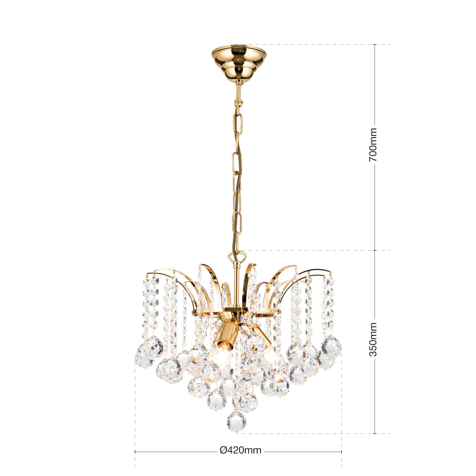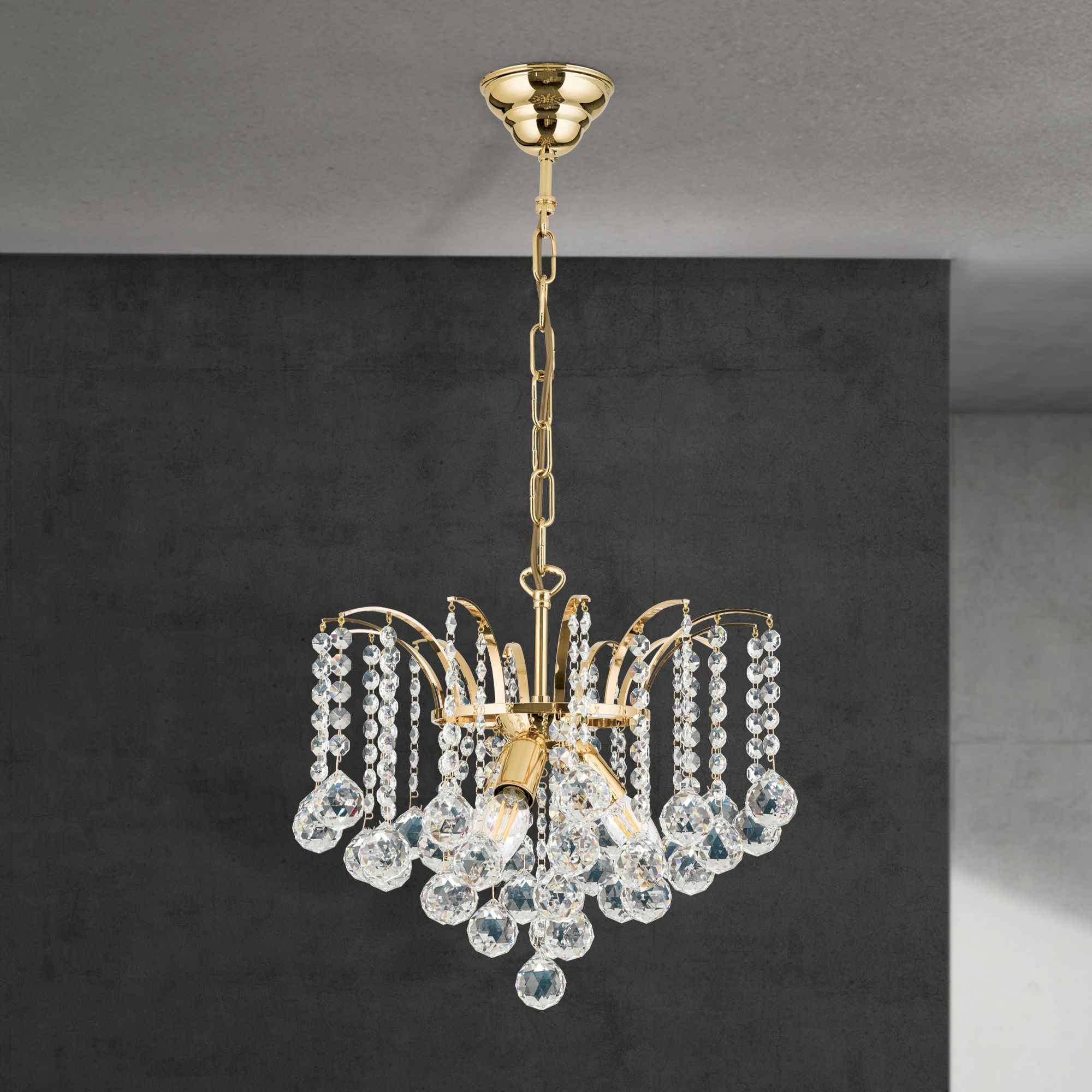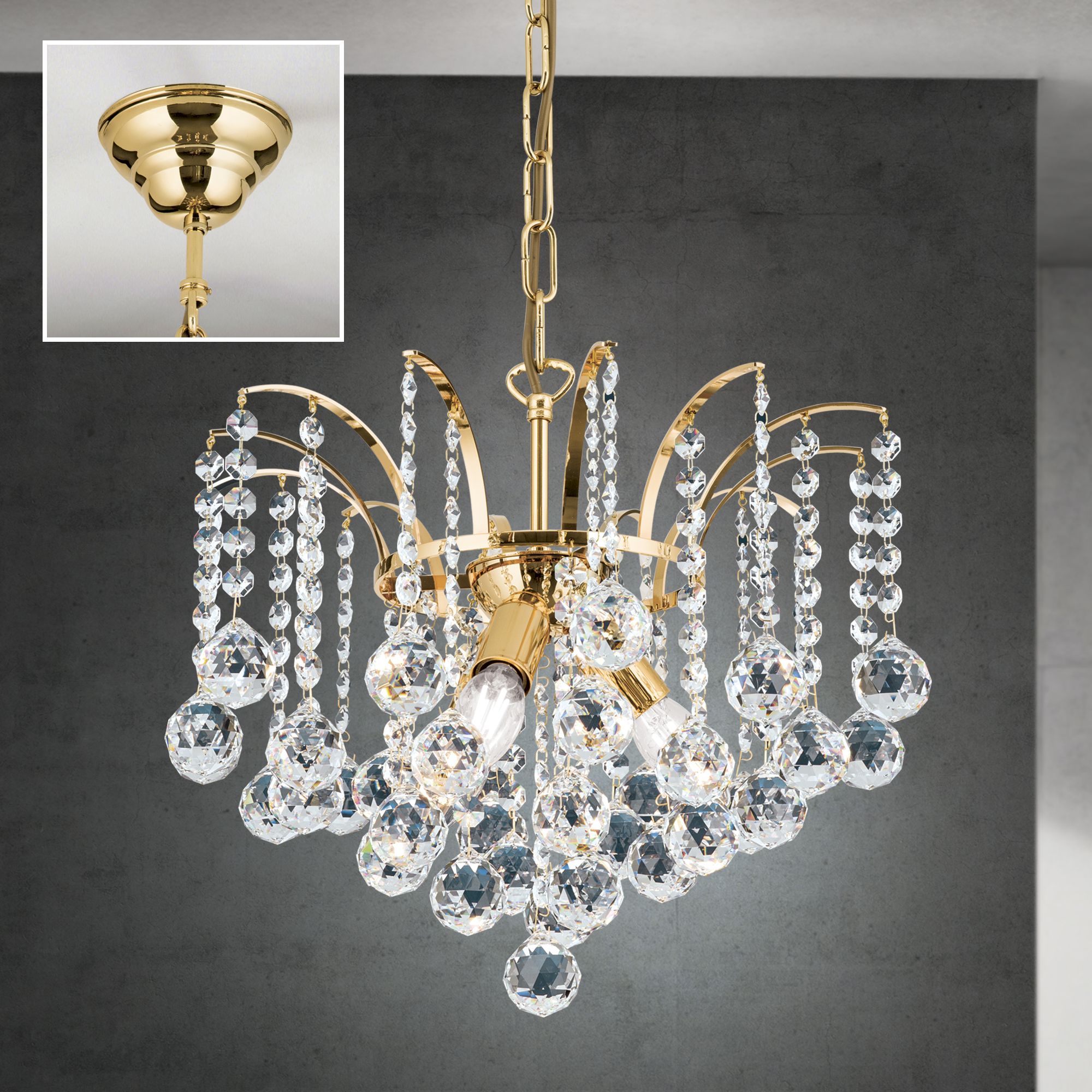 Einem Springbrunnen gleich ergießen sich die klaren Kristallketten des 3-flammigen Kronleuchters KRISTALL KLASSISCH wie Fontänen über das filigrane Messinggestell und in den Raum, wo sie ein spektakuläres Lichtspiel entfalten. Der Leuchtenkörper ist mit einem Finish in Chrom oder 24-Karat Gold erhältlich und verfügt über einen klaren Lüsterbehang aus unzähligen Asfour-Kristallen. Sein Design eignet sich sowohl für klassische als auch moderne Innenausstattungen und ist vielseitig einsetzbar. Er misst 42 Zentimetern im Durchmesser und ist mit 3 E14-Fassungen ausgestattet, die mit maximal 40 Watt je Fassung betrieben werden.