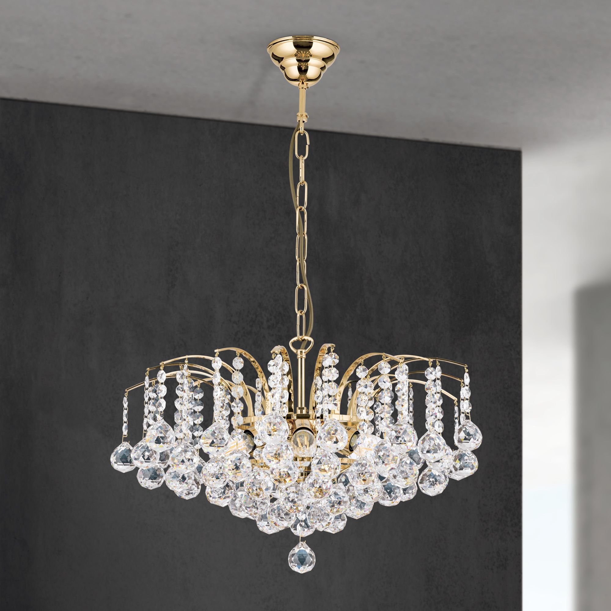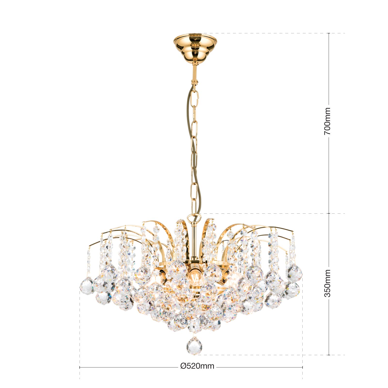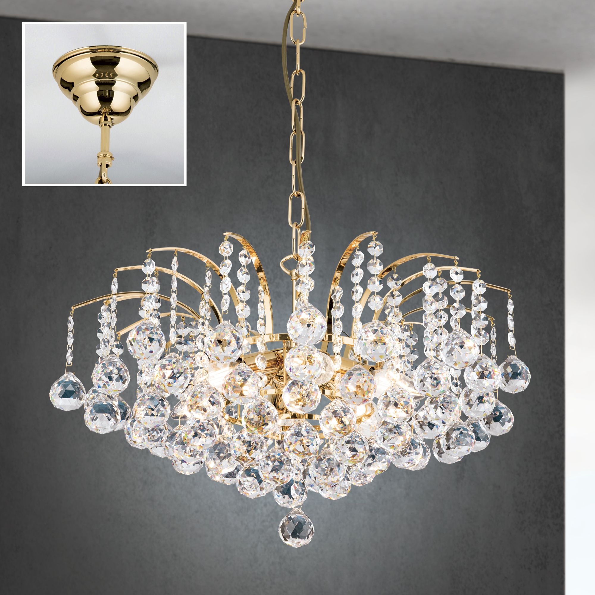 Ein prächtiger Lüsterbehang aus dem Hause Asfour schmückt den 6-flammigen Kronleuchter der Serie KRISTALL KLASSISCH. Fächerartig entfaltet sich das Messinggestell in zarte Streben, die Ketten aus feinen Koppen und Kristallkugeln tragen. Trifft Licht auf sie, entwickeln sie ein lebendinges Licht- und Farbspiel, dem man sich kaum entziehen kann. Mit einem Durchmesser von 52 Zentimetern eigent sich der Kronleuchter als edle Leuchte über einem Esstisch und verleiht dem Esszimmer eine feierlich elegante Stimmung. Ein Finish in wahlweise Gold oder Chrom veredelt den Leuchtenkörper aus Messing und wird mit einem Behang aus klarem Kristall kombiniert. Der dimmabre Luster ist mit 6 E14-Fassungen ausgestattet und kann mit maximal 40 Watt je Fassung bestückt werden. Die Ketteabhängung hat eine Länge von 70 Zentimetern und kann bedarfsgerecht gekürzt werden.