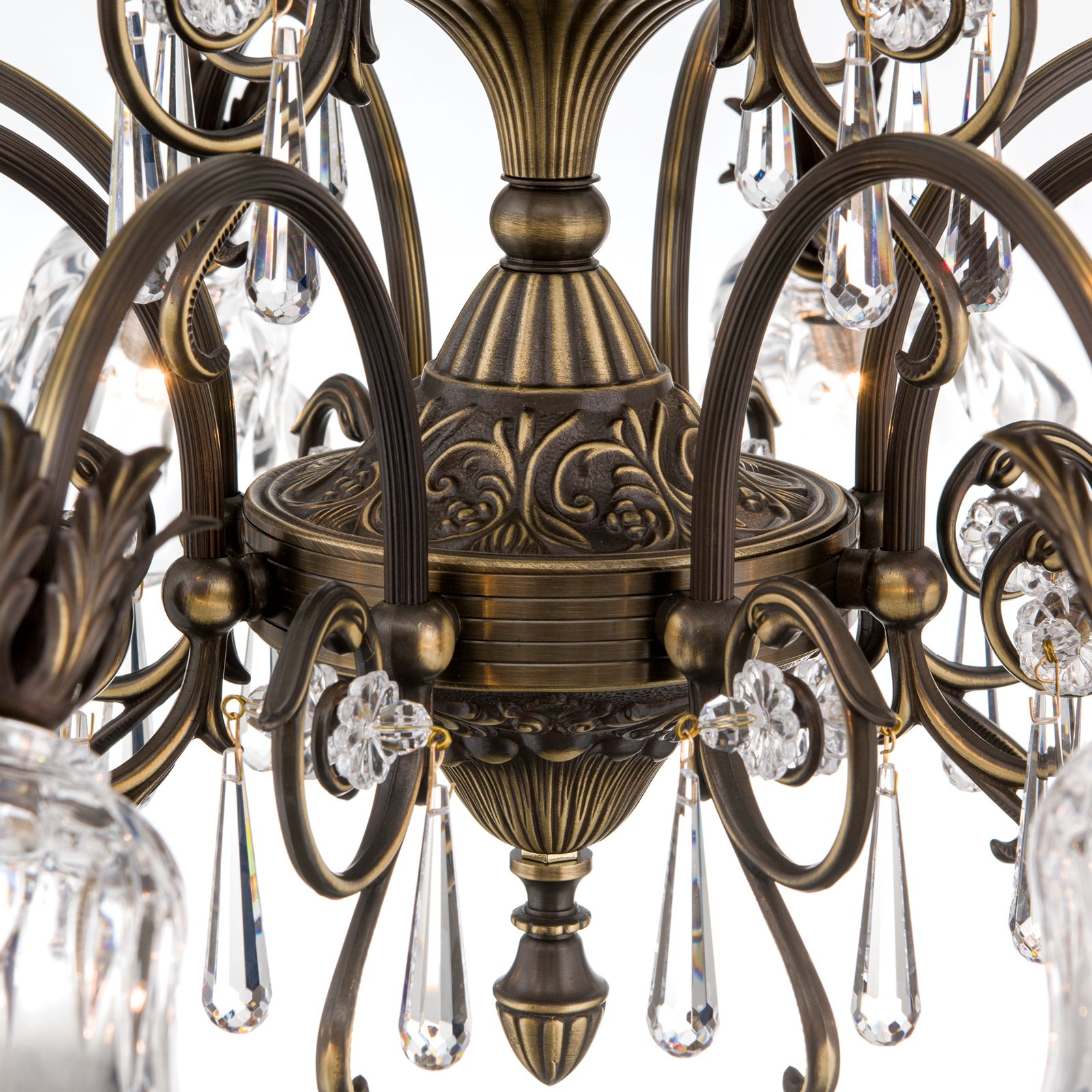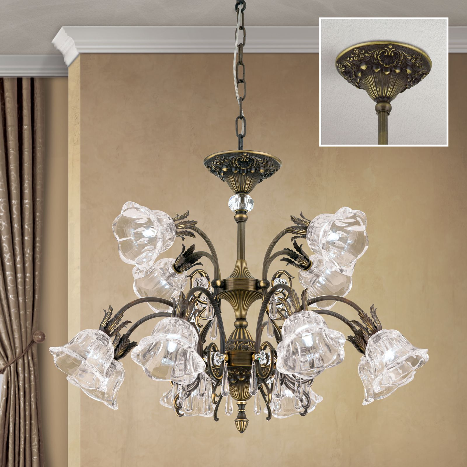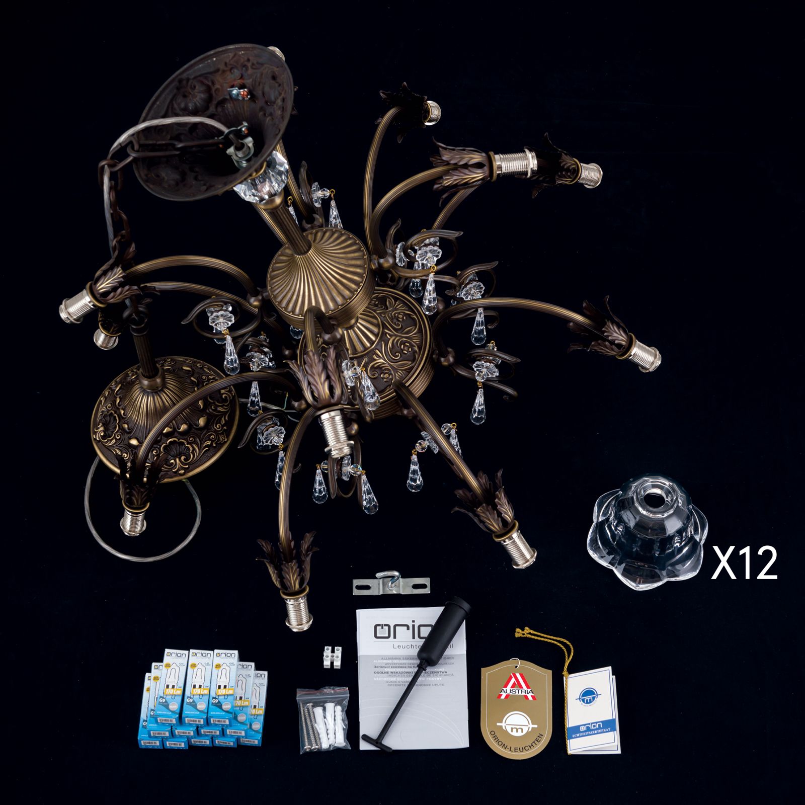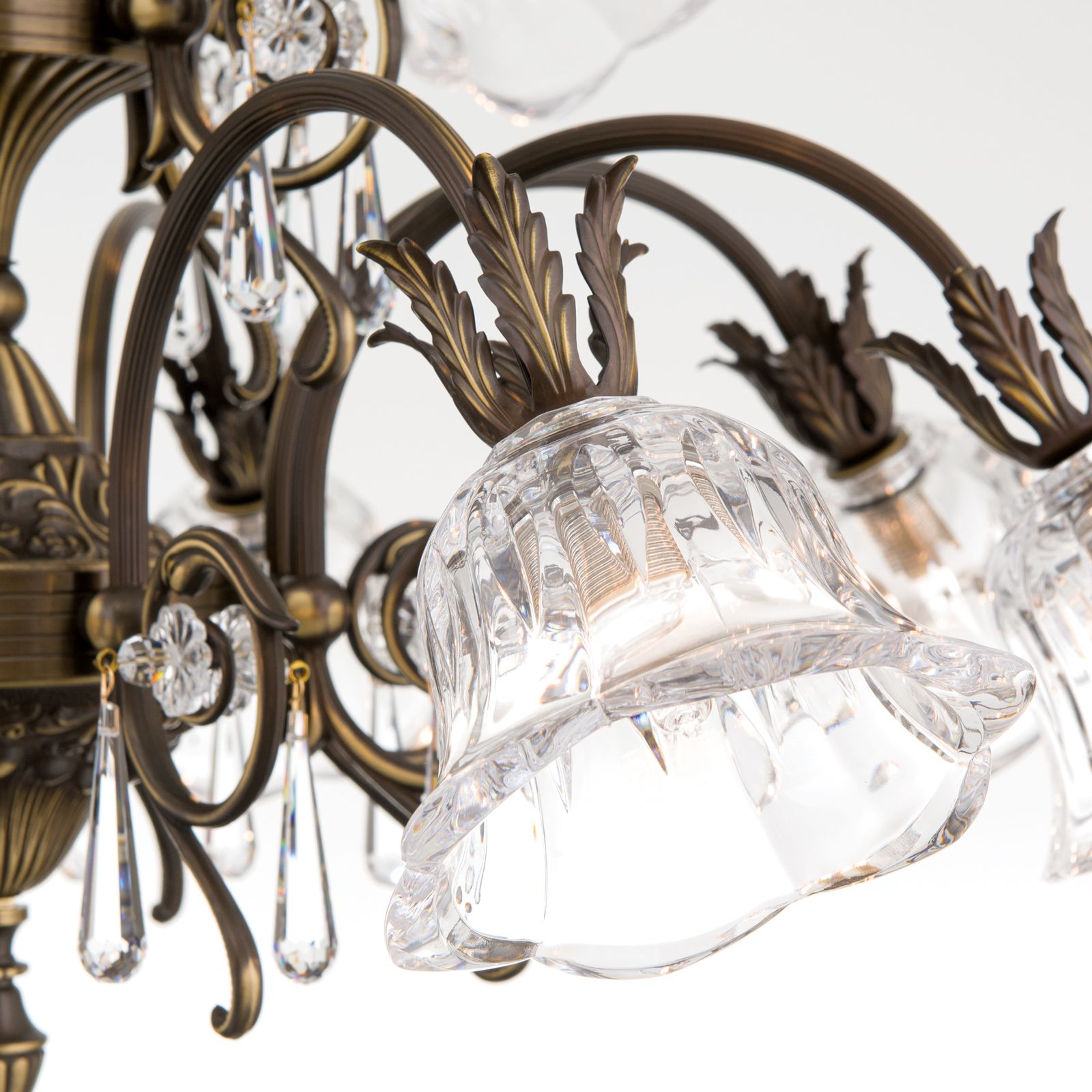 Das Gestell aus Vollmessing aus einer schönen Deckenrosette, einer kunstvoll verzierten Schale und einer beeindruckenden Säule, die 12 kannelierte Arme mit ihren prächtigen Schirmen trägt. Die Schirme bestehen aus klarem Kristall und streuen das Licht in alle Richtungen ab, wodurch der Kronleuchter zur Grundbeleuchtung eingesetzt werden kann. Dabei ist die Form der Kristallschirme besonders reizend, denn sie erinnern an Blütenköpfe und werden durch die Akanthusblätter komplettiert. Für zusätzliches Funkeln sorgen einzelne am Luster angebrachte 1A Vollschliff Kristalle.