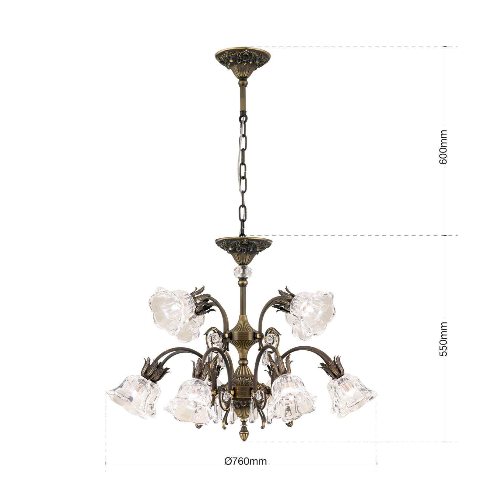 Die Gesamthöhe des Kronleuchters beträgt 115 cm mit einer Abhängung von 60 cm und einem Durchmesser von 76 cm. Ausgestattet mit 12 G9-Fassungen können diese mit maximal 40 Watt bestückt werden. Mithilfe eines Dimmers wird für das passende Licht gesorgt. LA BOHEME gibt es in den Oberflächen handschattierter Altpatina, Altsilber und Gold.