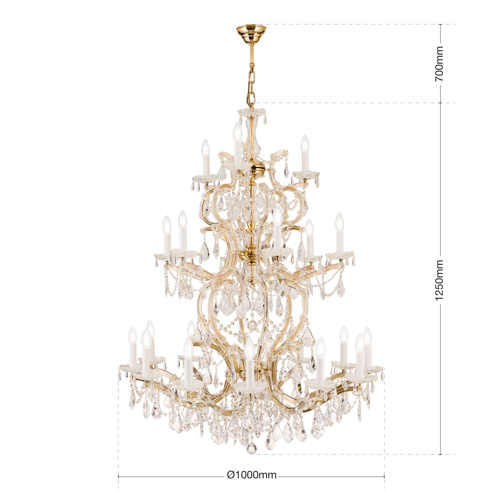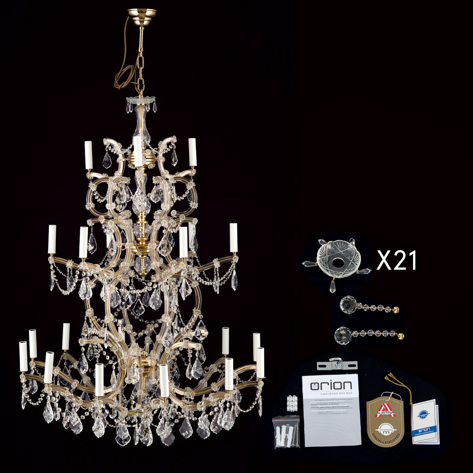 Der 21-flammige Kronleuchter aus der MARIA THERESIA-Kollektion ist ein spektakulärer Blickfang und die Krönung jedes Raumes. Hoch aufragend, weit auskragend, reich geschmückt und hochwertigst gefertigt, adelt er jedes Interieur mit Antikmöbeln und stilvollem Dekor. Spangen, die wie Blütenranken aufragen, umfangen den prachtvollen Schaft. Elegant geschwungene Bogen der Arme tragen auf drei Etagen die in Summe 21 Flammen samt Tropfschalen. Kristallbehang aus österreichischer Qualitätsfertigung sorgen für ein funkelndes Meer an durch den Raum tanzendem Licht. Sehr hohe Räume in Hotelfoyers, Luxusrestaurants oder auch Konferenzsälen bieten sich für diese herausragende Lichtkomposition an. Der Kronleuchter ist mit achtzehn E14-Fassungen für je maximal 40 Watt ausgestattet.