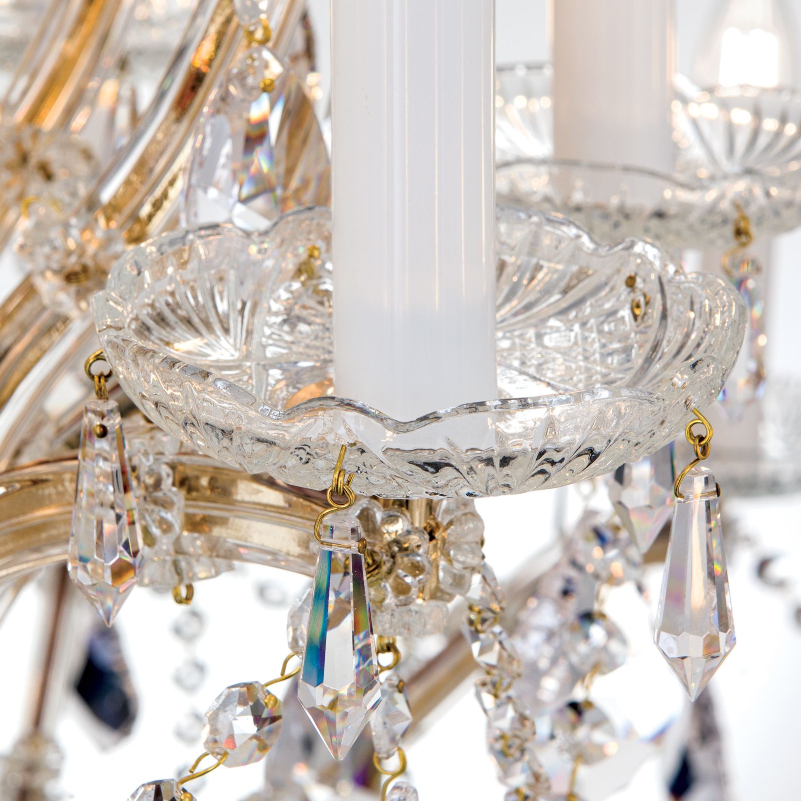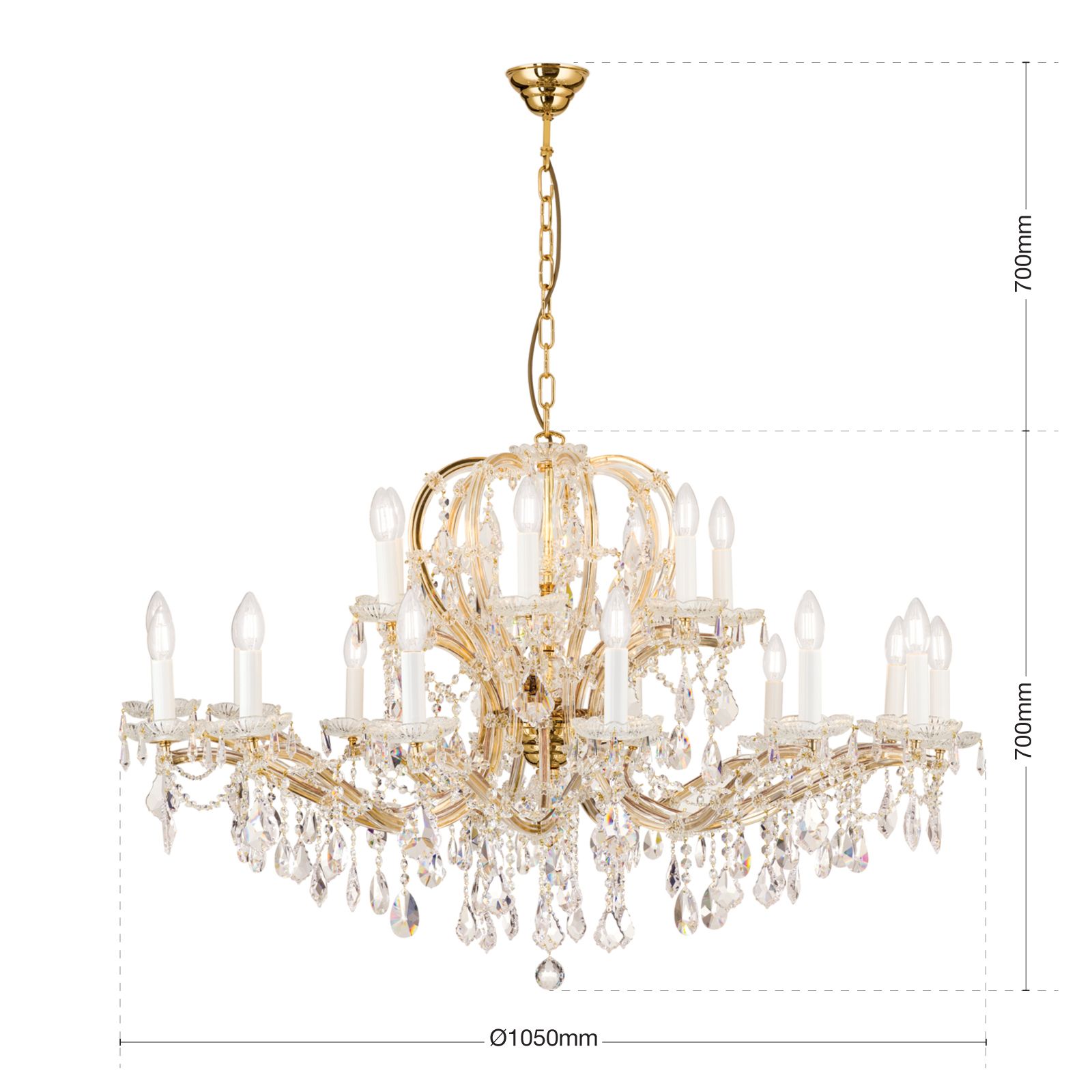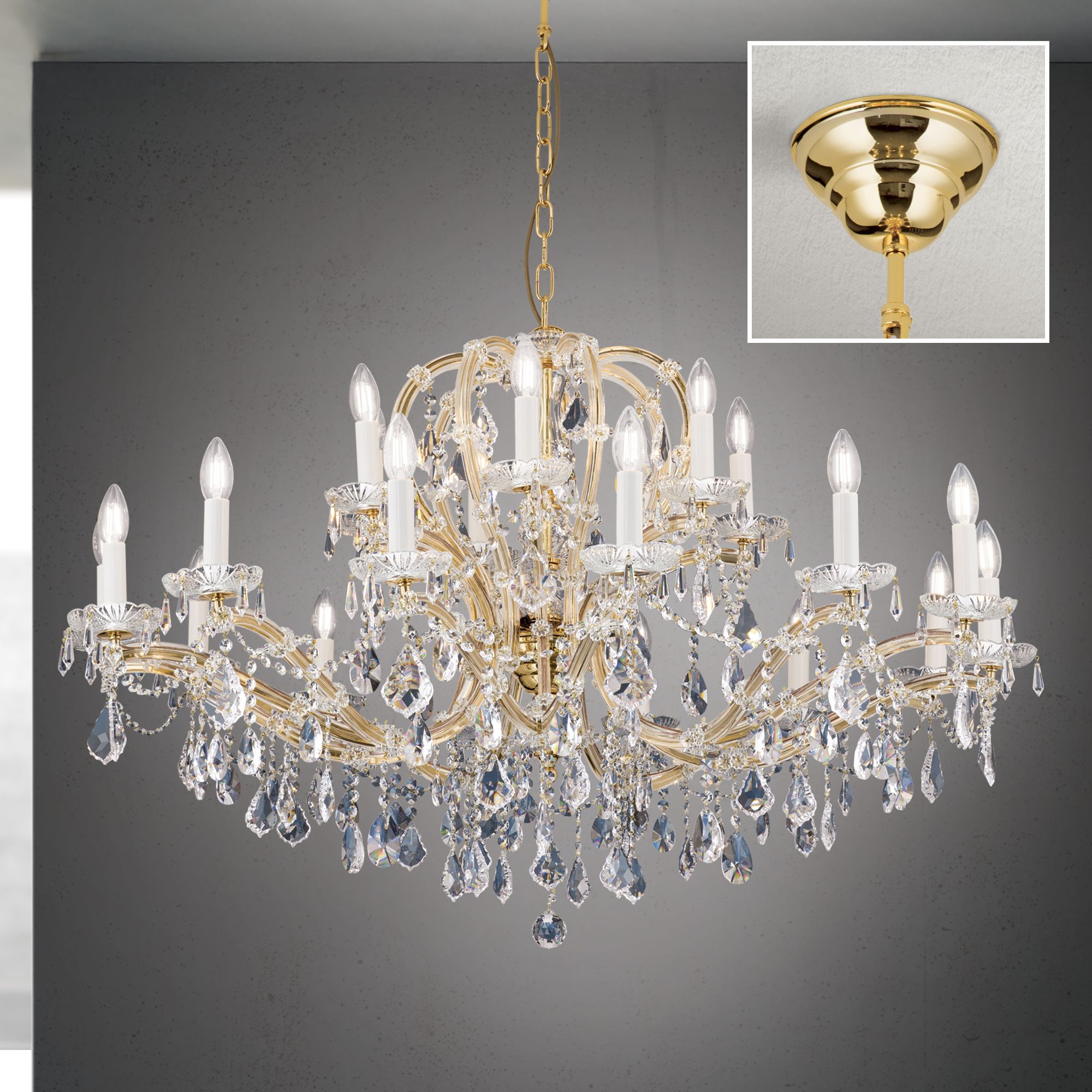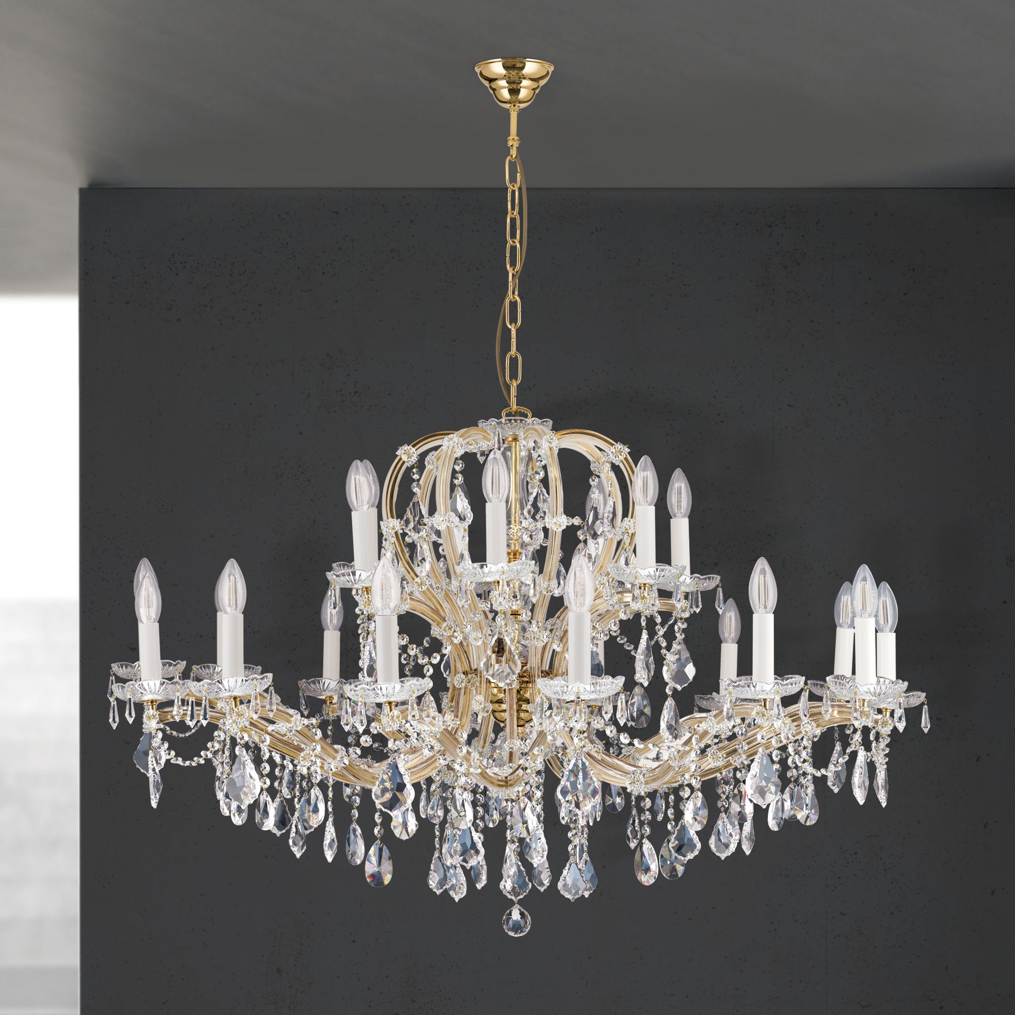 Die MARIA THERESIA-Kollektion bietet mit dem 21-flammigen Kronleuchter ein besonders eindrucksvolles Exemplar würdevoller Beleuchtung. Zwei breit ausgelegte Lichterkreise umrunden den balusterförmigen Mittelschaft. Die Flammen werden von vergoldeten und verglasten Armen getragen, die in einem großzügigen Schwung gemeinsam mit den mittleren Spangen die Kronenform bilden. Begleitet wird dieser imperiale Prunk von einer Vielzahl an brindl- und wachtelförmigen Kristallen, die das in ihren Prismen gebrochene Licht durch den Raum tanzen lassen. Konferenzräume, Empfangsräume, Hotelfoyers oder große Säle lassen sich mit dieser „Krönung“ der Luster prächtig beleuchten. Der Luster verfügt über einundzwanzig E14-Fassungen für je bis zu 40 Watt.