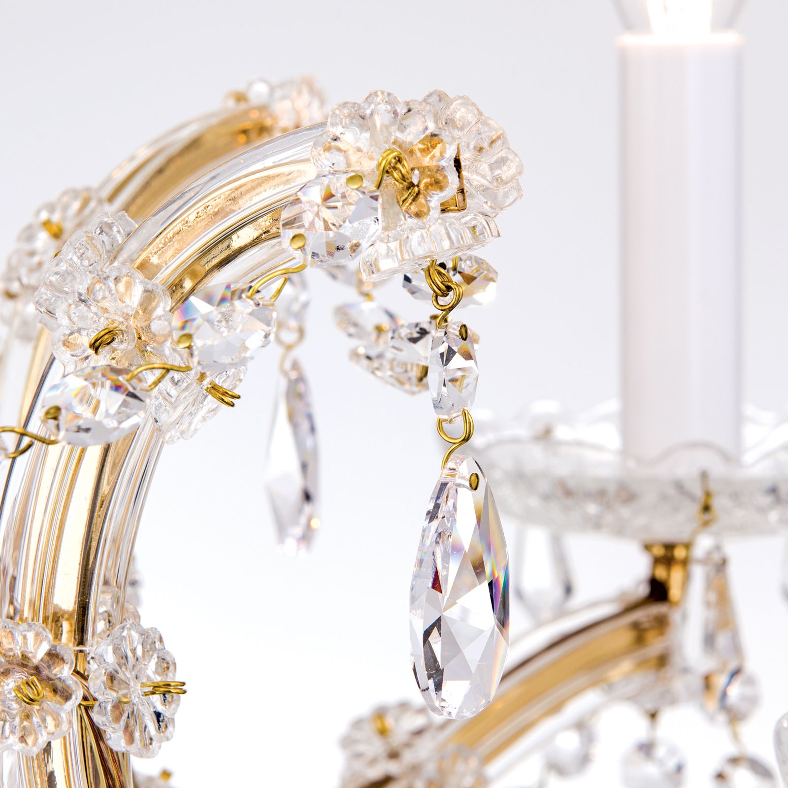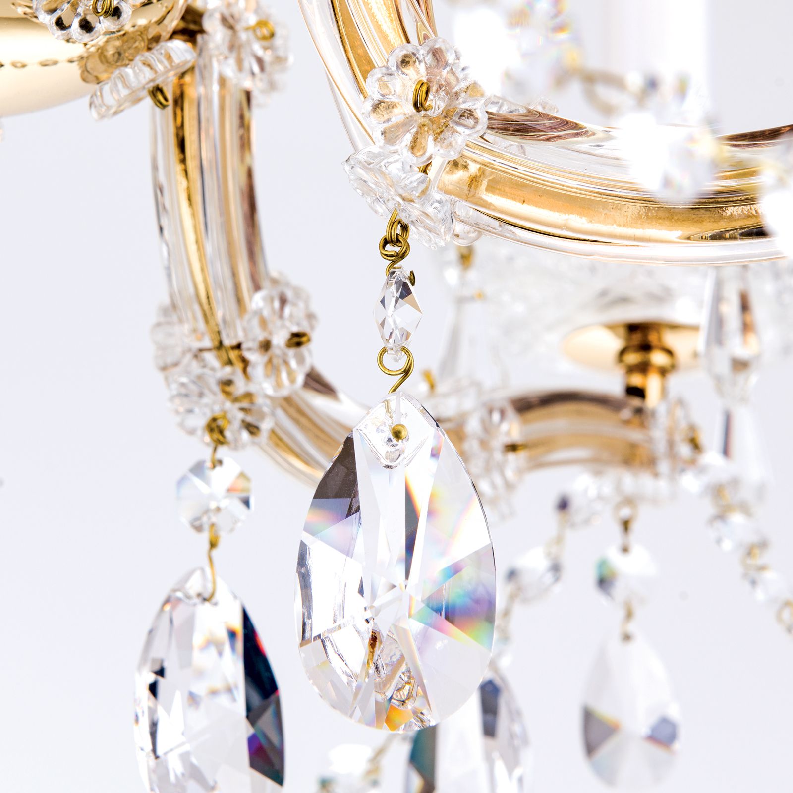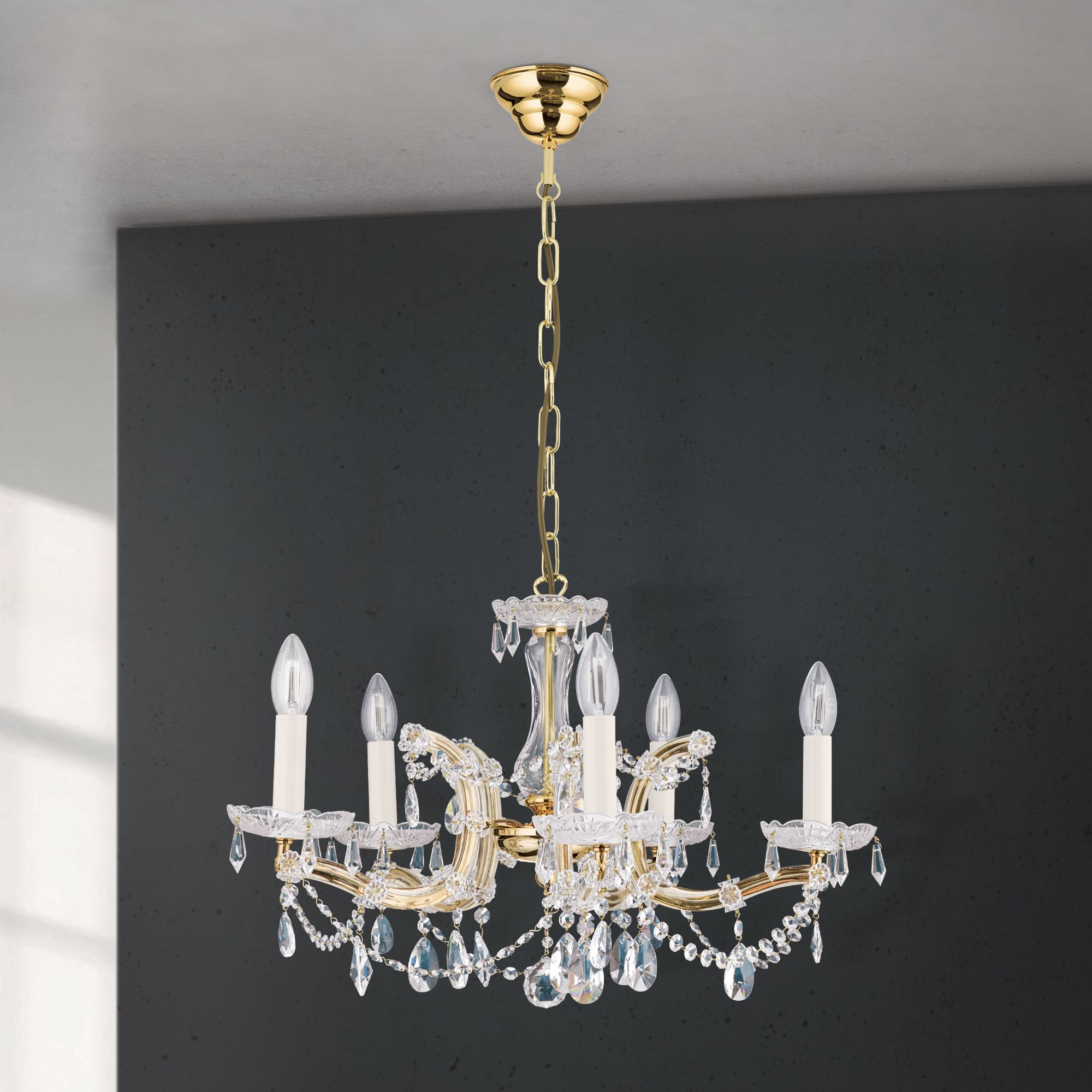 Die Kollektion MARIA THERESIA ist die strahlende Renaissance dieses stilbildenden Lusterklassikers. Um Licht besonders effektvoll zu inszenieren, verwendete man von alters her Materialien, die Glanz und Strahlen möglichst intensiv verstärken. Der Einsatz von geschliffenen Kristallen in Verbindung mit Goldveredelung ist zu diesem Zweck eine unschlagbare Kombination. Die Facetten des Kristallbehangs geben das Licht in allen Farben des Spektrums wieder. Das Gold liefert die strahlende Wärme. Ein Esszimmer mit stilvollem Interieur wird durch diesen Kronleuchter fraglos geadelt. Auch ein Empfangsraum wird den Eintretenden in wohlwollendes Staunen versetzen. Fünf E14-Fassungen leisten jeweils maximal 40 Watt.