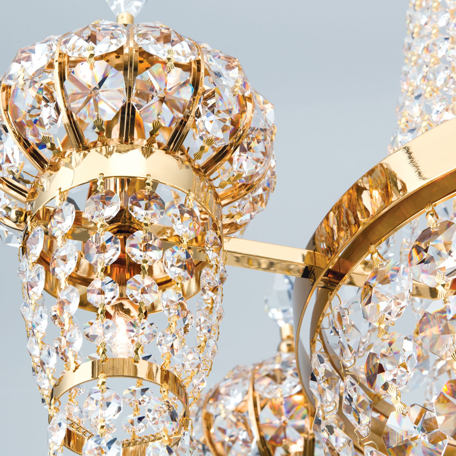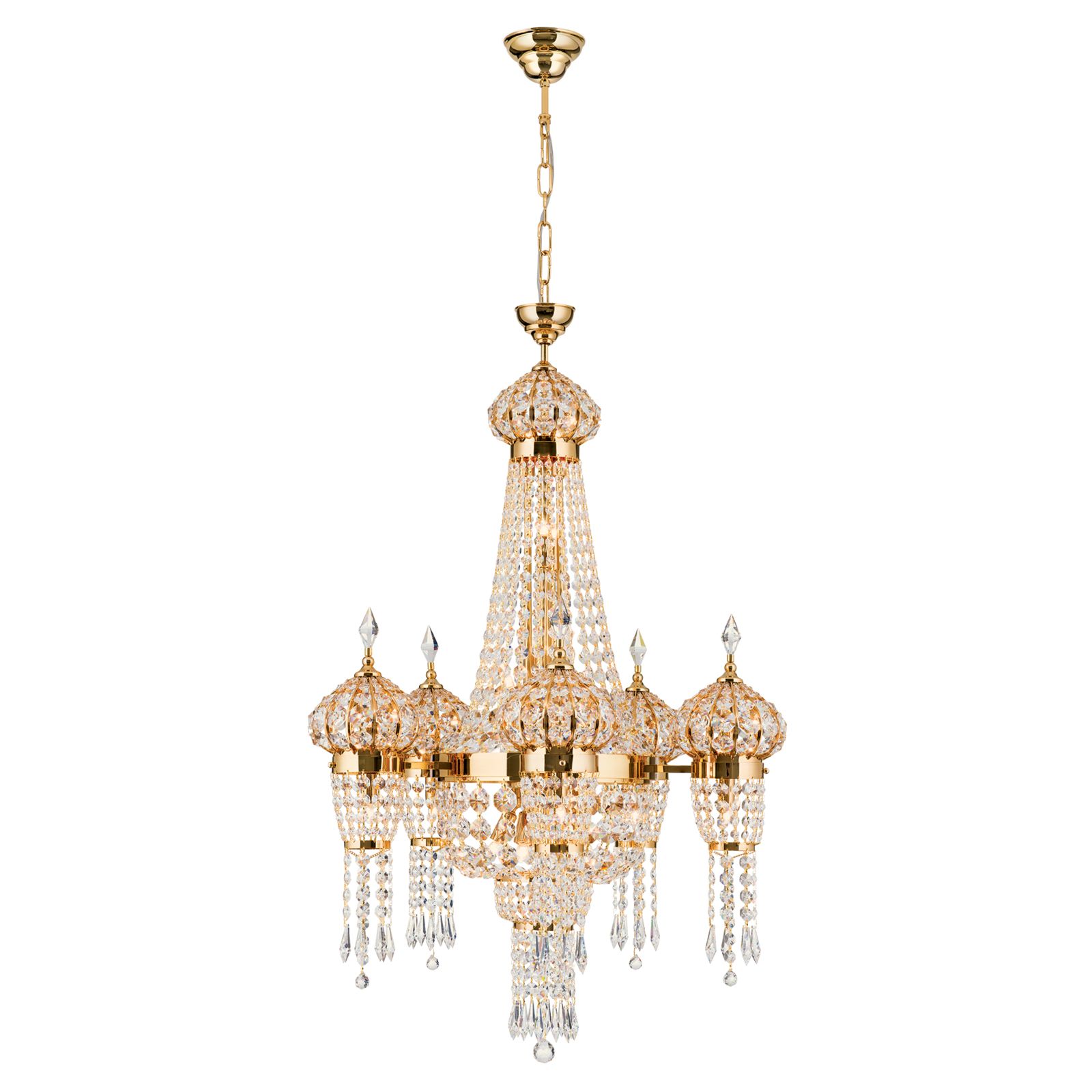 Beim Anblick des Kronleuchters ORIENTAL fühlt man sich wie in ein Märchen aus 1001 Nacht versetzt. Die aufwendige Gestaltung des 24 Karat vergoldeten Vollmessinggestell und der SCHÖLER CRYSTAL®-Kristallbehang wirken verspielt und verträumt. Beim Betreten eines Wohnzimmers oder großen Eingangsbereichs wird der Kronleuchter zum Blickfang und zieht Sie in seinen Bann.