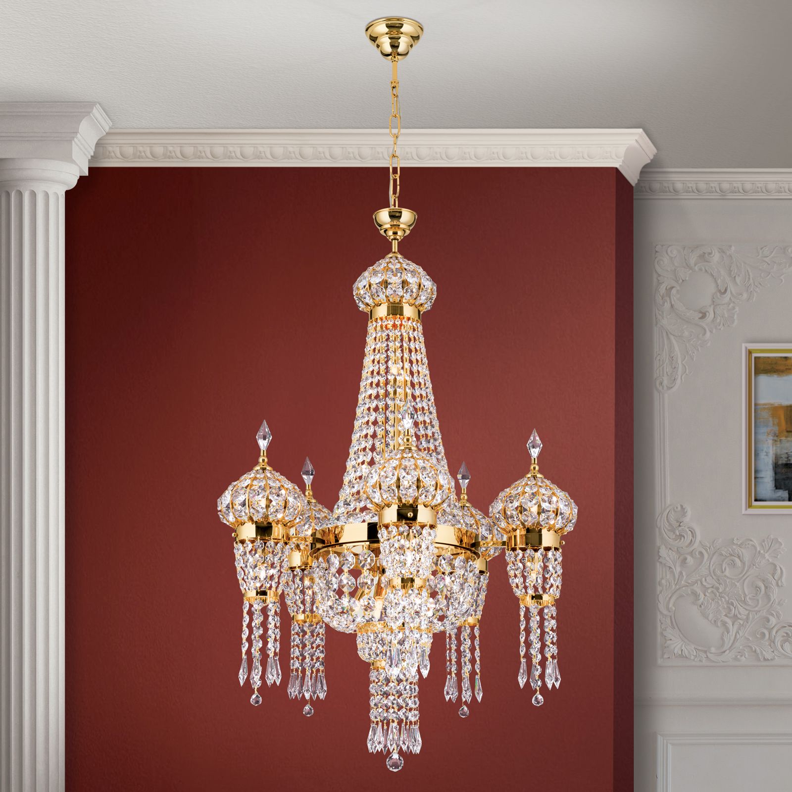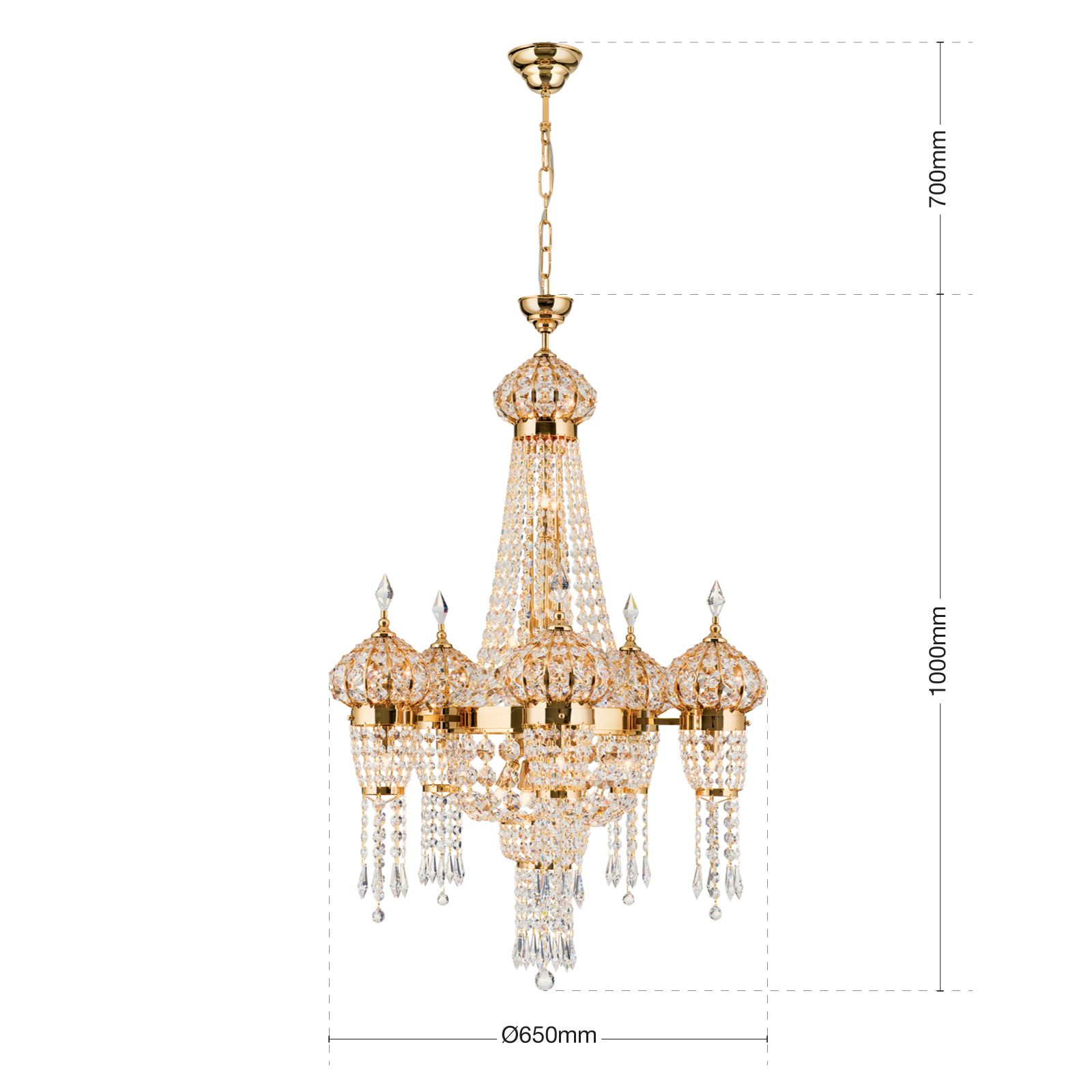 Die eindrucksvolle Hauptflamme sowie die fünf kleineren Nebenflammen bestehen aus einer Kuppel, geformt aus Kristallketten und einem Kristallbehang aus unterschiedlich geschliffenen Kristallen. Abgerundet wird das Design mit tropfenförmigen Kristallen, welche die Kuppeln bekrönen. Die 24 G9-Fassungen werden mit maximal 40 Watt bestückt und die Leuchtmittel sind im Lieferumfang enthalten. Bei Bedarf kann der Kronleuchter auch gedimmt werden.