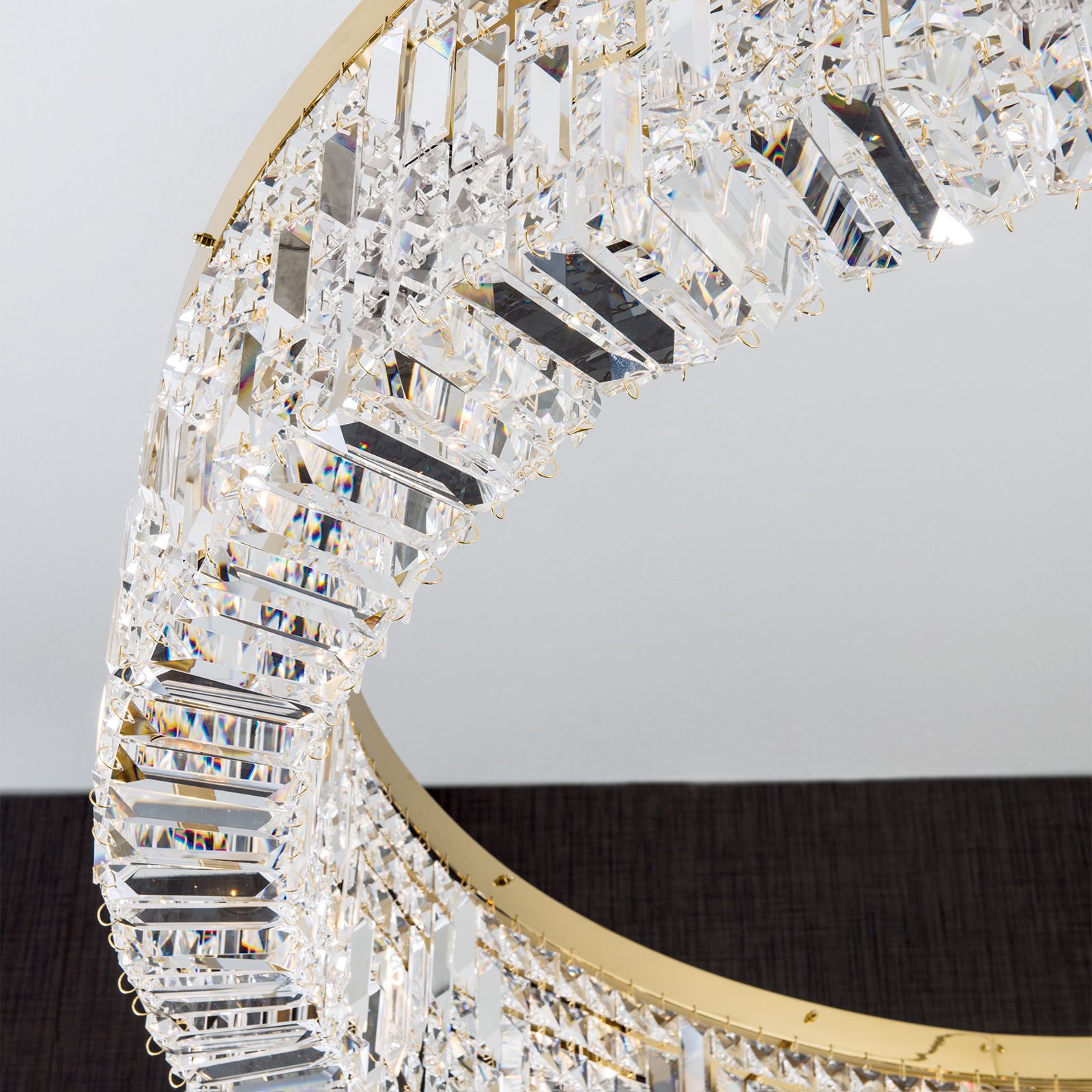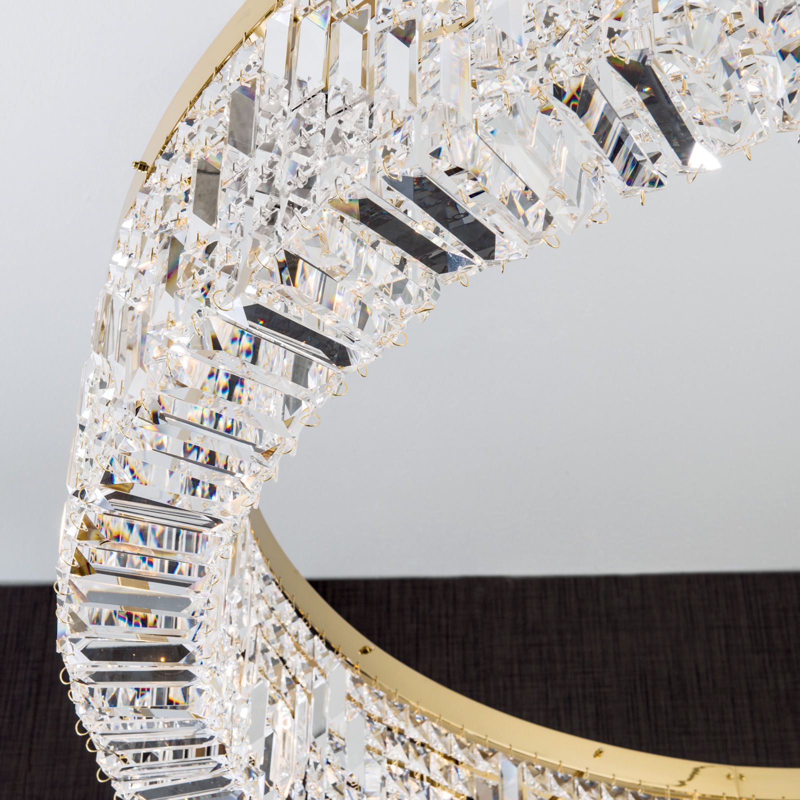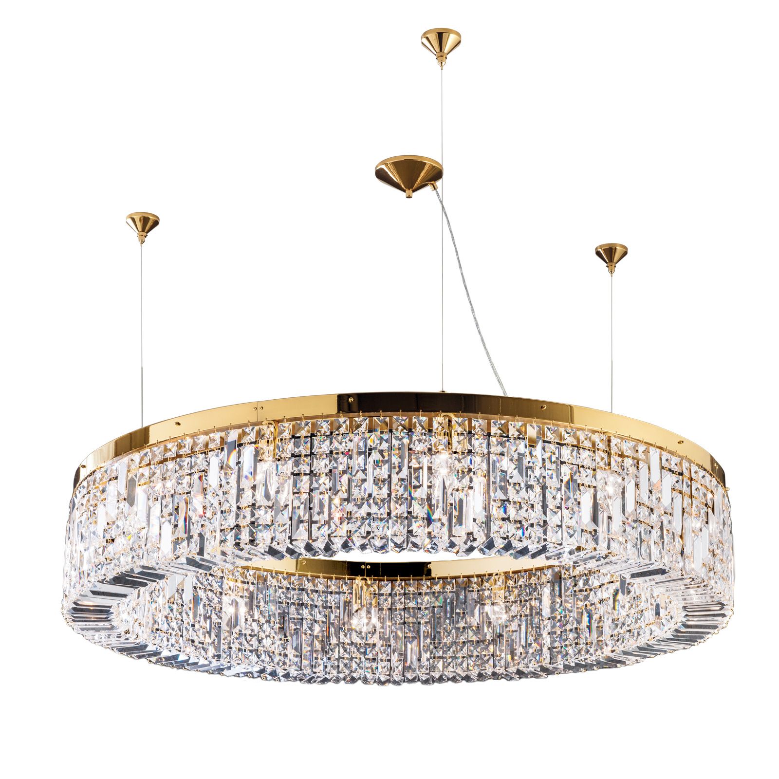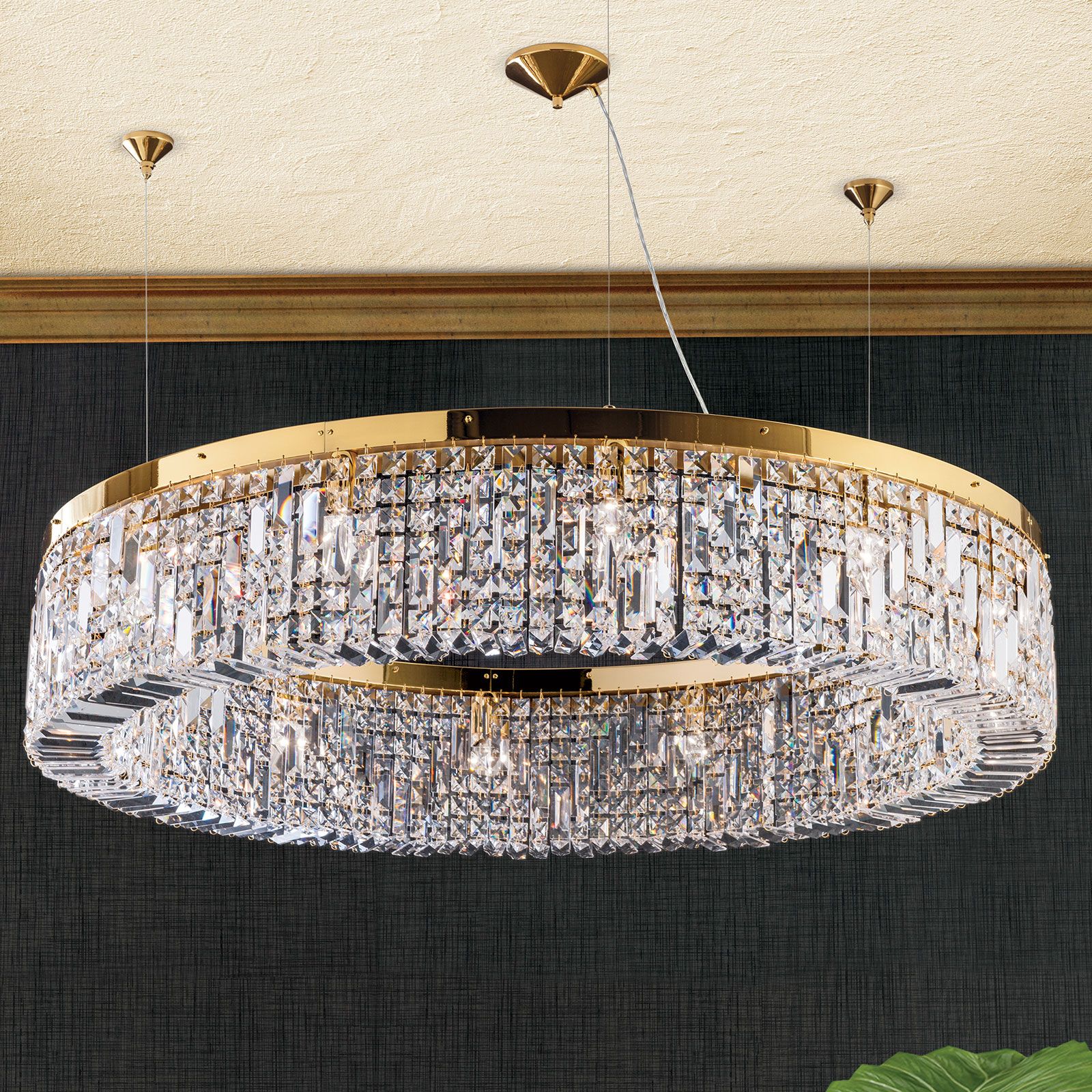 Mit dem Kronleuchter RING bringen Sie eine imposante Lichtquelle in Ihren Wohnraum, welcher sowohl klassisch als auch modern eingerichtet sein kann. Für eine ausreichende als auch stilvolle Beleuchtung eignet er sich besonders gut über Esstischen oder zentral in Wohnzimmern. Aber auch in Entrees versprüht er glanzvollen Charme und taucht den Raum in ein angenehmes Licht. Der Asfour Kristallbehang in Prismenform verleiht der Leuchte einzigartiges Funkeln, welche durch die glänzende Oberfläche des Gestells intensiviert wird. Ausgestattet mit beachtlichen 12 Leuchtmitteln in den E14-Fassungen kann er mit maximal je 40 Watt bestückt werden. Der Kronleuchter mit einem Durchmesser von 110 cm und einer Höhe von 30-160 cm ist in den Oberflächen Chrom und Gold verfügbar. Wir weisen Sie darauf hin, dass es sich bei diesem Produkt um einen Artikel mit Speditionslieferung handelt.