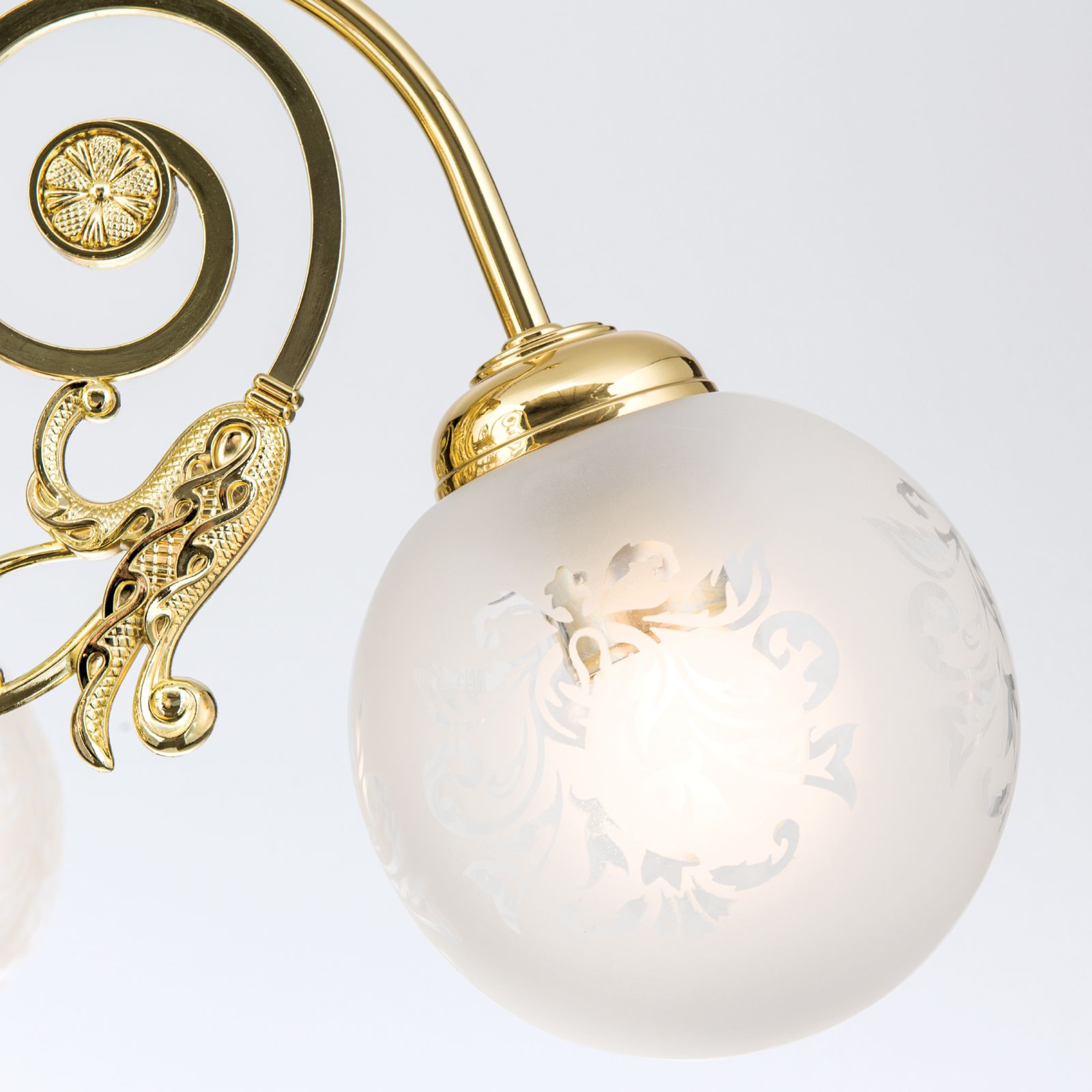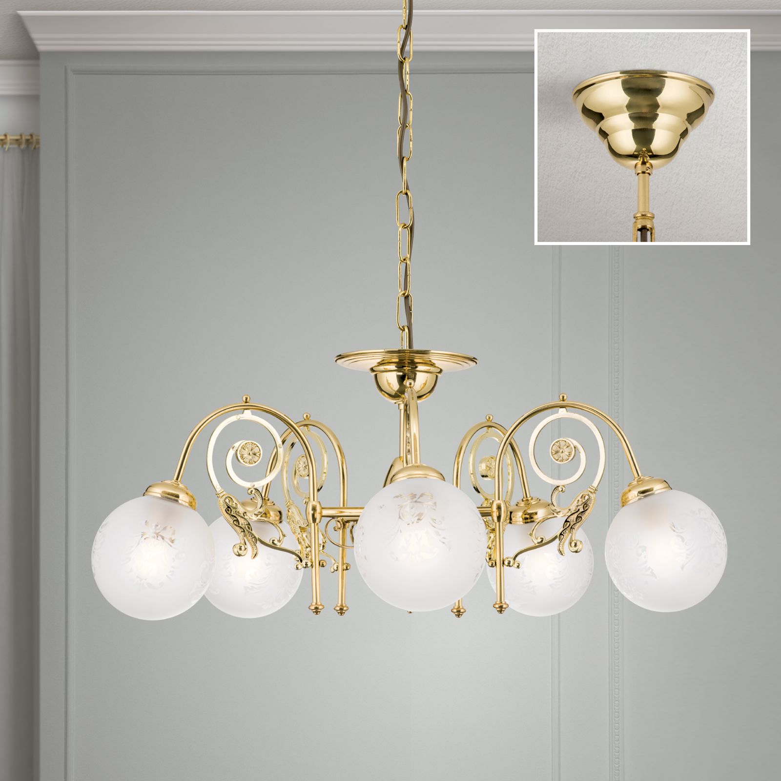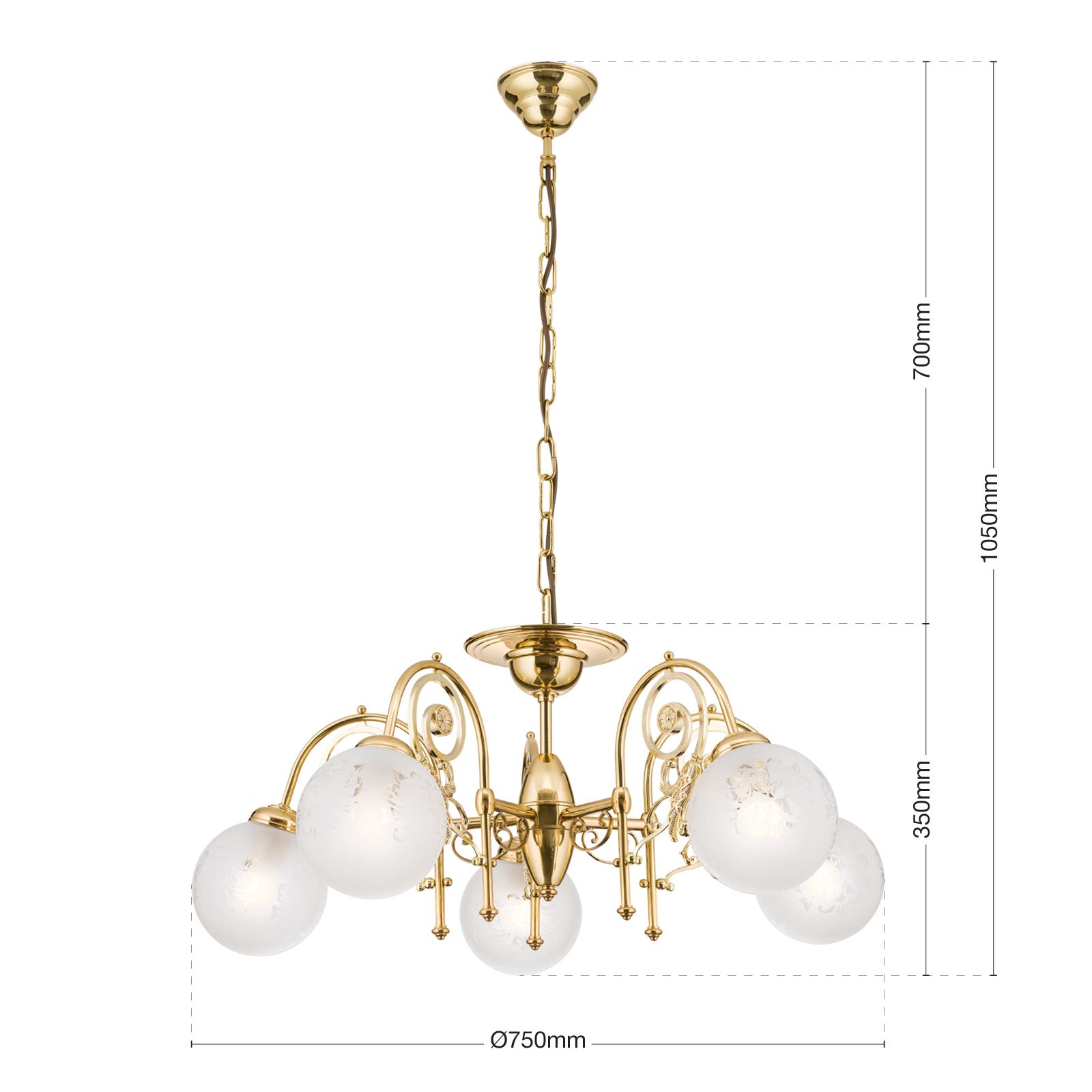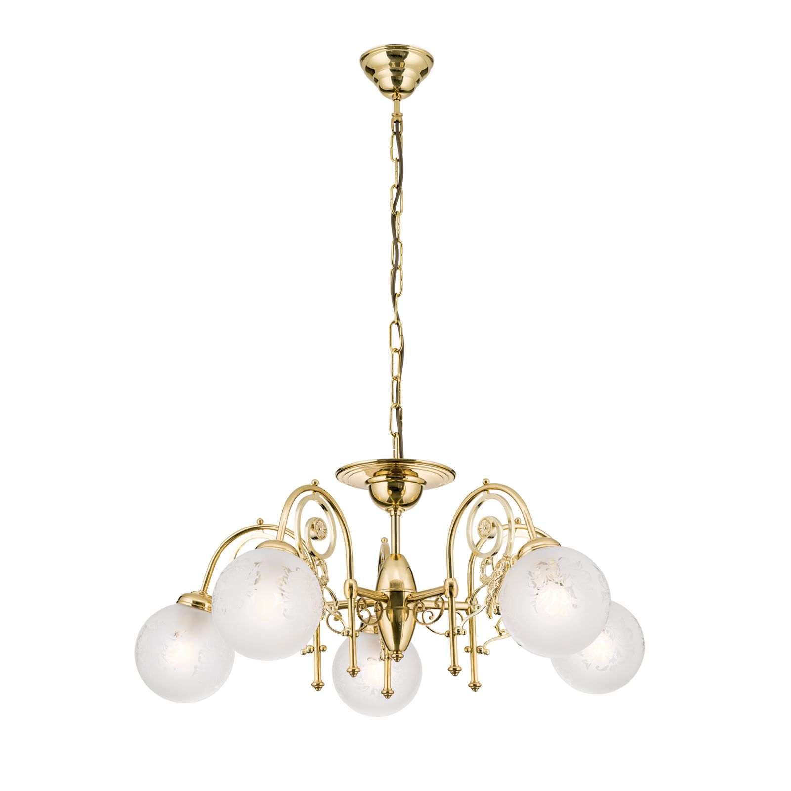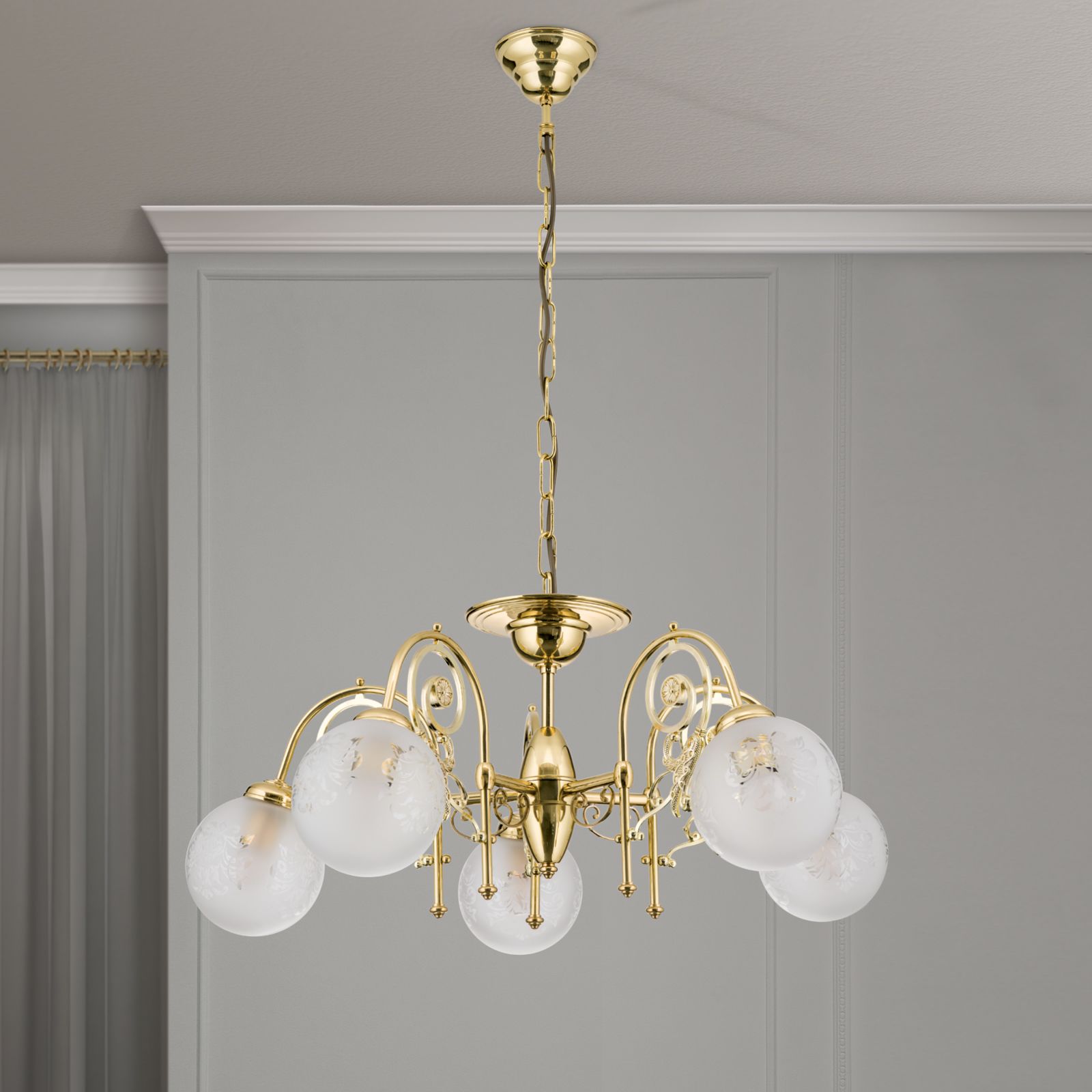 Entdecken Sie den Luster RINGSTRASSE - Eine majestätische Lichtquelle, die Eleganz und Charme in Ihr Zuhause bringt. Mit seinen fünf strahlenden Armen, gefertigt aus glänzendem Messing, und klaren matten Kugelgläsern, die ein bezauberndes florales Dekor zieren, ist dieser Kronleuchter die perfekte Wahl, um Ihr Interieur zu verschönern.