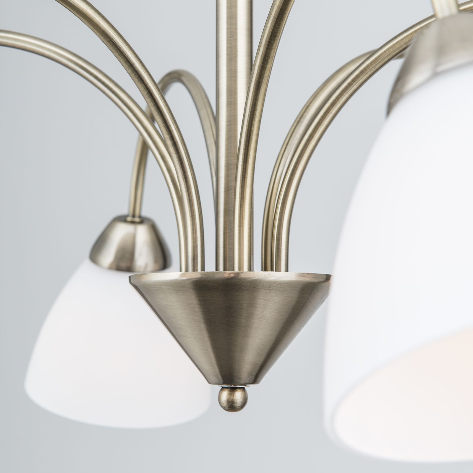Der Kronleuchter aus der Serie SUSAN fügt sich aufgrund seiner schlicht-eleganten Grundformen und dem dynamischen Schwung seiner sechs Arme gleichermaßen in moderne Wohn-, Ess- oder Schlafzimmereinrichtungen wie traditionellere Ensembles. Die kelchförmigen Glasschirme entspringen einem zentralen Kegel wie die Fontänen eines Springbrunnens. Die matt gebürstete Patina-Optik unterstreicht die hochwertige Verarbeitung. Auch die glockenförmige Verzierung der Deckenrosette ist ein stilvolles Statement. Sechs E14-Fassungen bieten jeweils maximal 40 Watt Leistung und somit die Möglichkeit auch große Räume mit einer stilvollen und angenehmen Grundbeleuchtung zu versorgen. Klare oder matte kerzenförmige Lampen runden das Design perfekt ab.