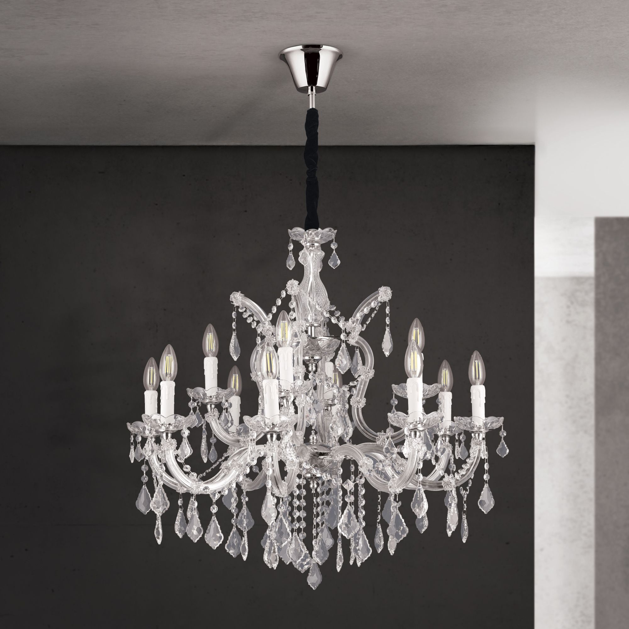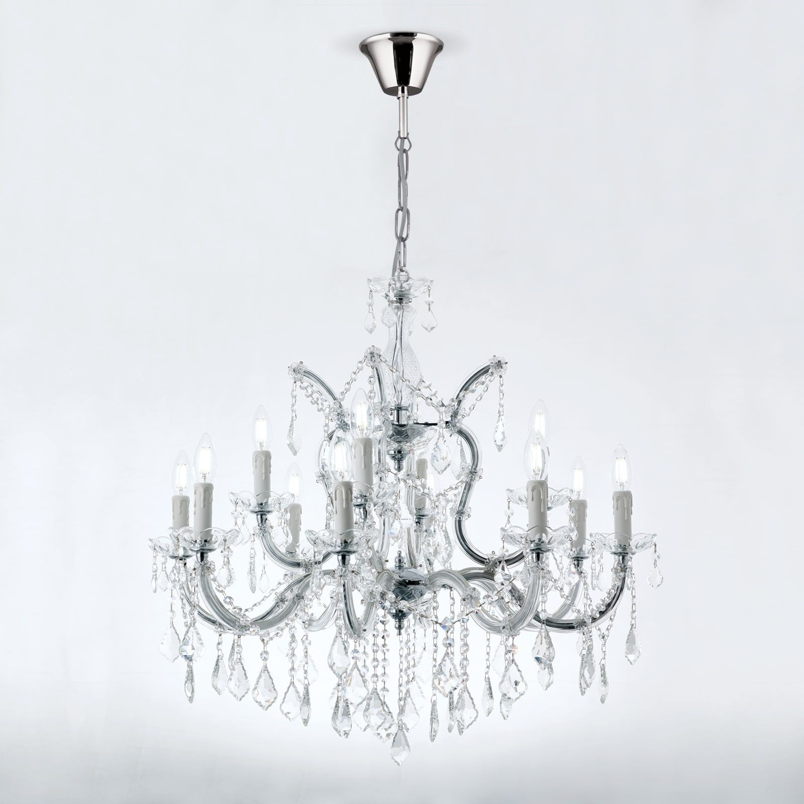 Der Kronleuchter aus der THERESA-Serie spart nicht mit Prunk. Alleine der Behang von senkrechten Perlenreihen, geschliffenen Pendeln und kleinen wachtelförmigen Steinen lassen einen Raum wie ein leuchtendes Kaleidoskop wirken. Die gläsernen Arme und Bögen laufen in einem aus vier Bögen bestehenden Mittelteil zusammen. Gekrönt wird der reich verzierte untere Teil durch eine Glasvase, die triumphierend über allem thront. Jeder Salon wird durch diesen Prunk geadelt. Der Kronleuchter ist mit zwölf Fassungen à bis zu 40 Watt ausgestattet. Die Aufhängung ist optional mit Samtverkleidung erhältlich.