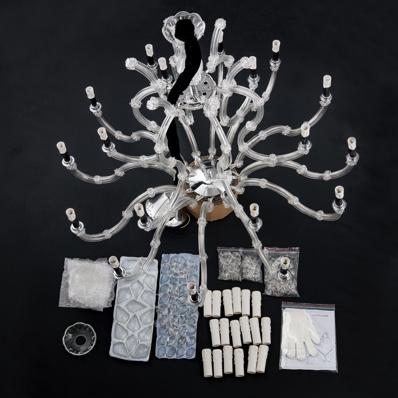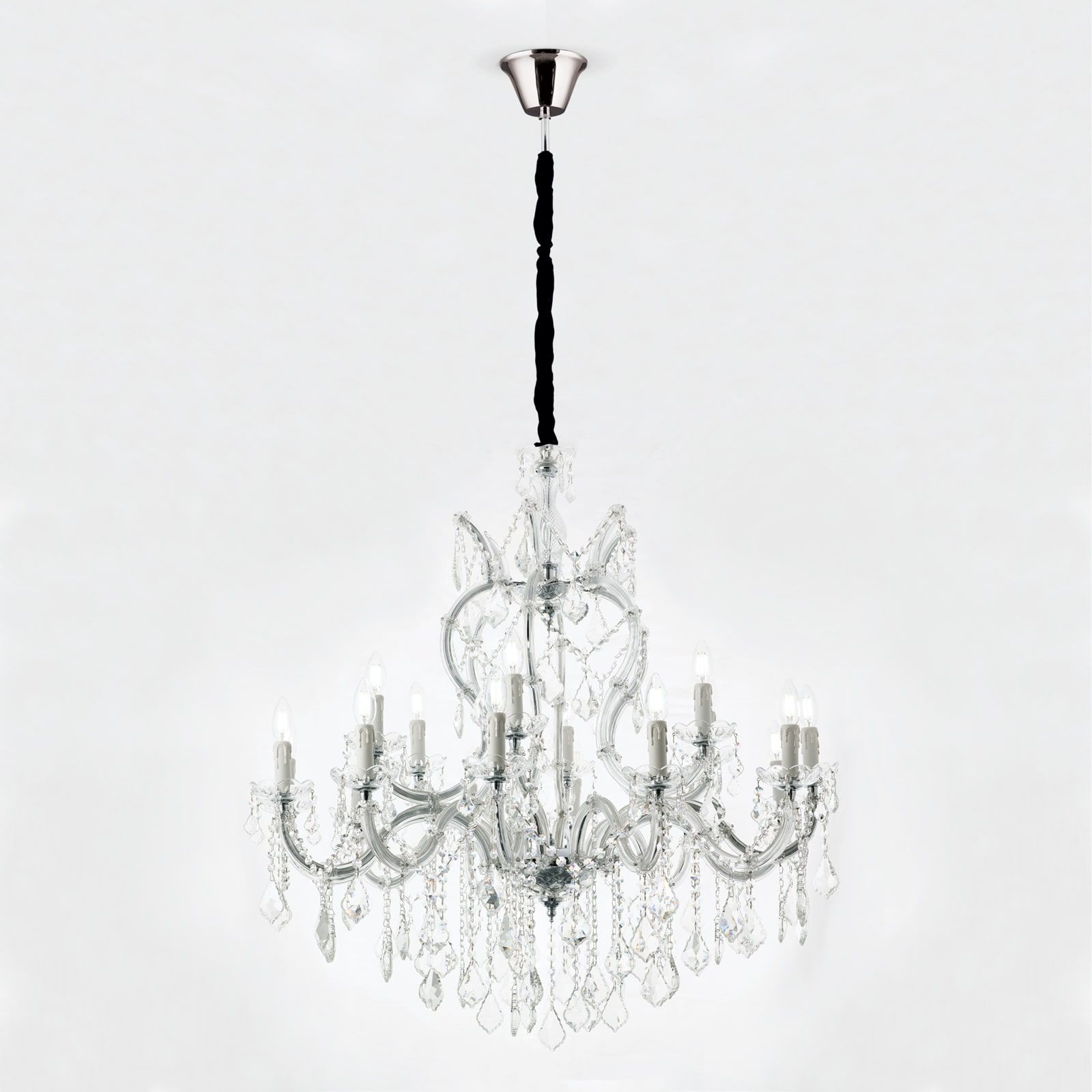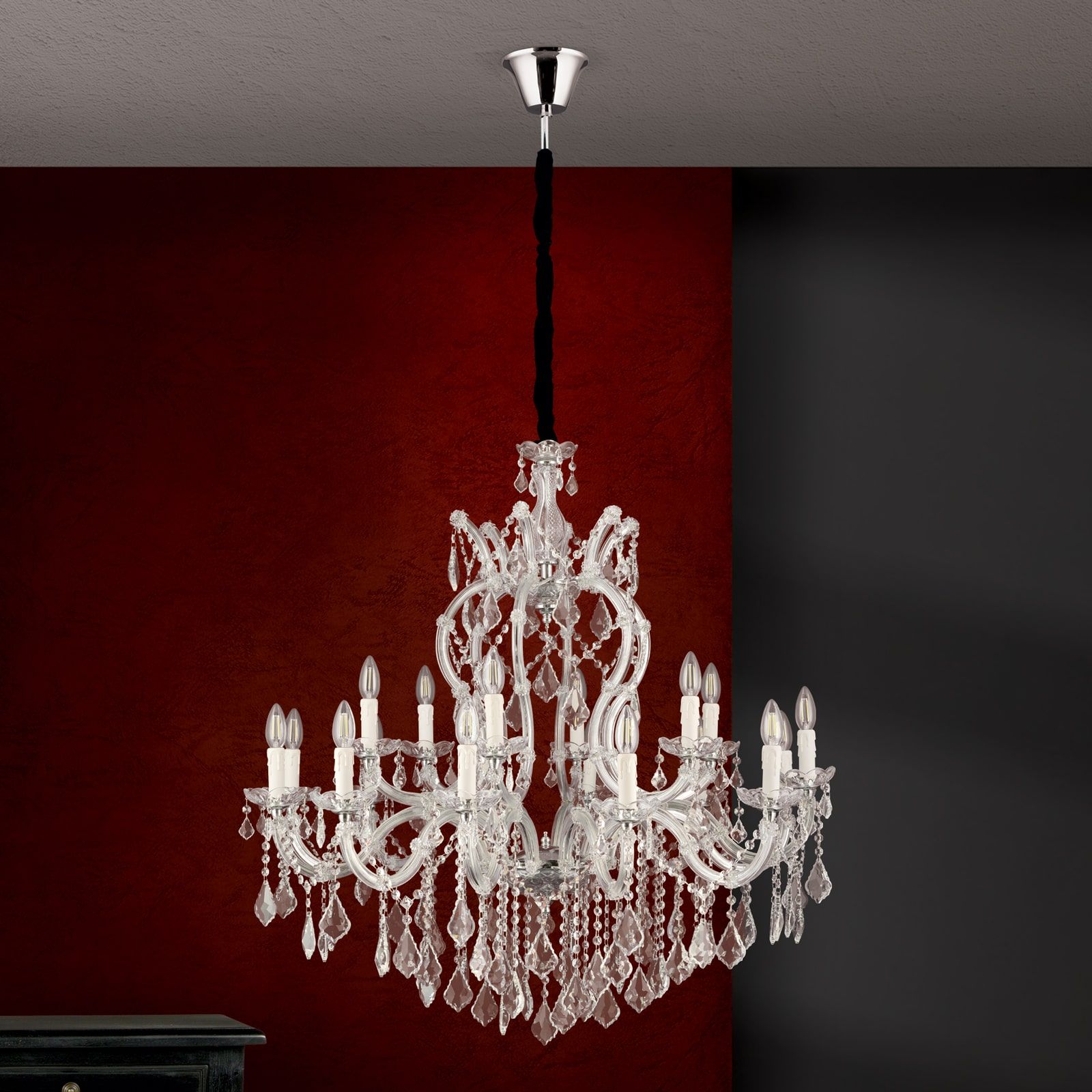 Der 18-flammige Luster aus der THERESA-Serie in Silber entfaltet für uns seinen königlichen Prunk in Ballsäälen, großen Salons, über Festtafeln - oder man weidet sich daran aus purer Lebensfreude! Achtzehn in zwei Stöcken - unten 12, oben 6 -angeordnete Flammen in Kerzenoptik stehen in gläsernen Wachstropfschalen. Die Arme sind in Ringelreih miteinander durch Perlenketten mit Kristallbehang verbunden. In der Mitte geht alles in ein prachtvolles Gefüge aus Bögen und Pendeln aus K9 Kristallen über. Seide, Brokat, Damast, warme Farben, Holz sind die natürlichen Gefährten dieses Lusters. Der Kronleuchter ist mit achtzehn E14-Fassungen à bis zu 40 Watt ausgestattet.